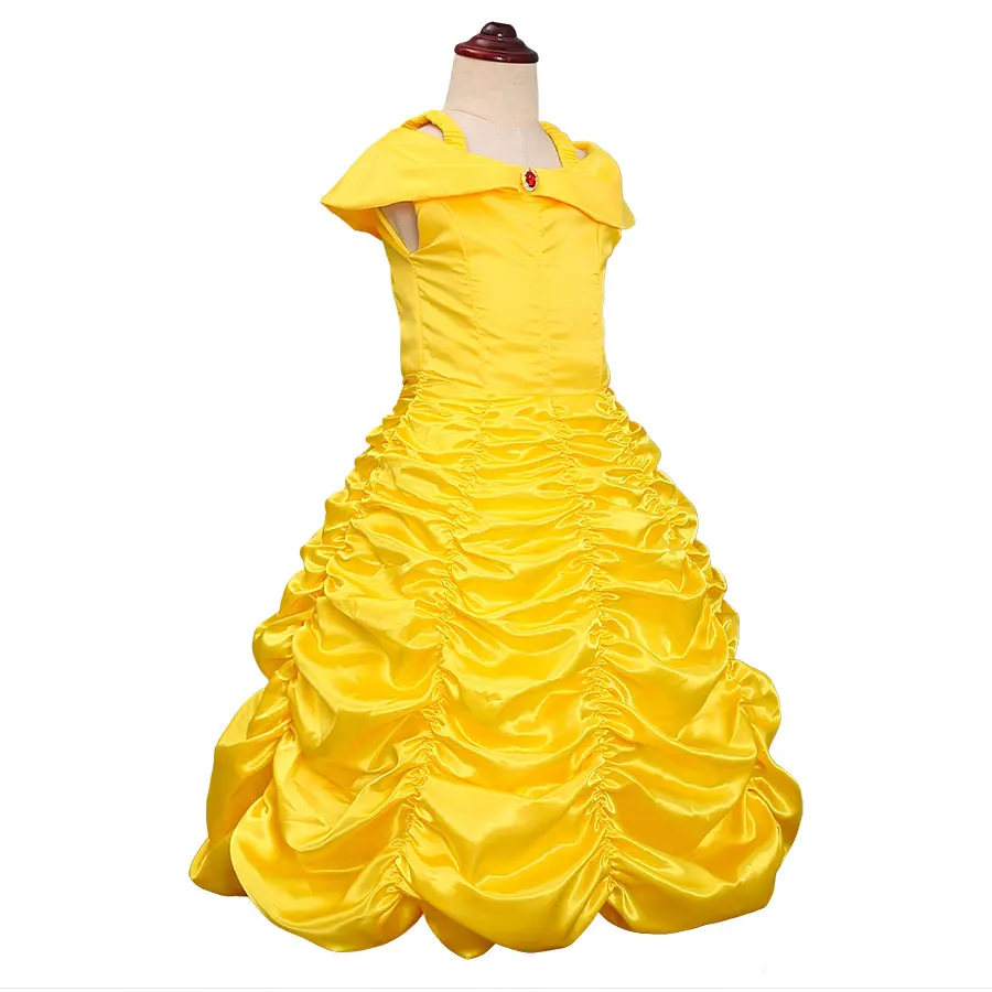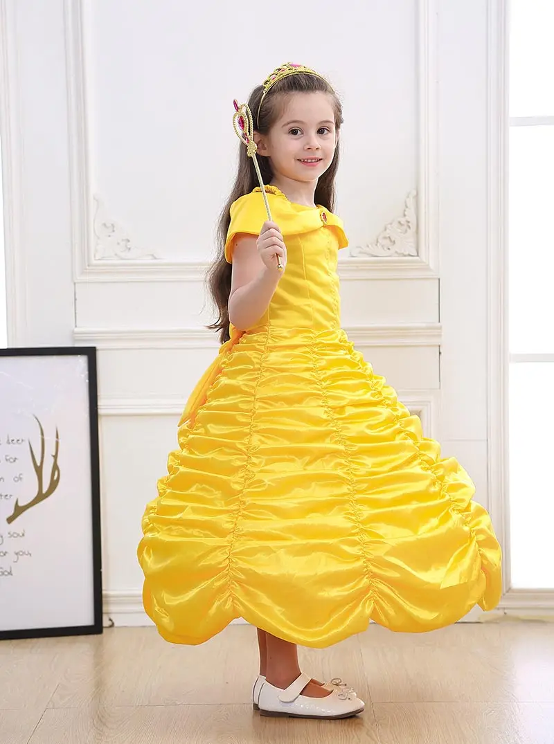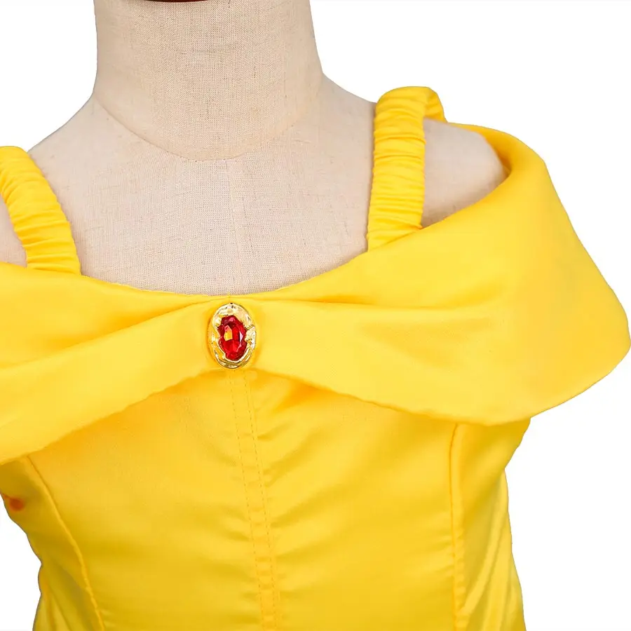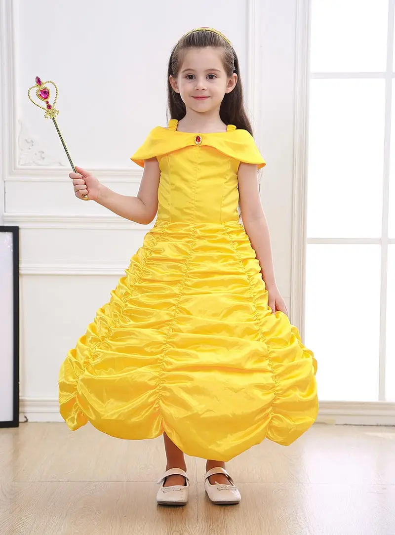 Платье принцессы Белль для девочек, костюм для косплея, детское желтое бальное платье с открытыми плечами, платье на Хэллоуин с короной и волшебной палочкой