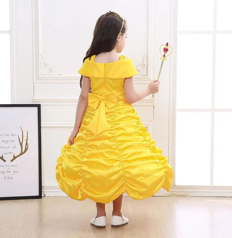 Платье принцессы Белль для девочек; Карнавальный костюм для детей с открытыми плечами; Желтые вечерние бальные платья; Платье на Хэллоуин с короной; Волшебная палочка