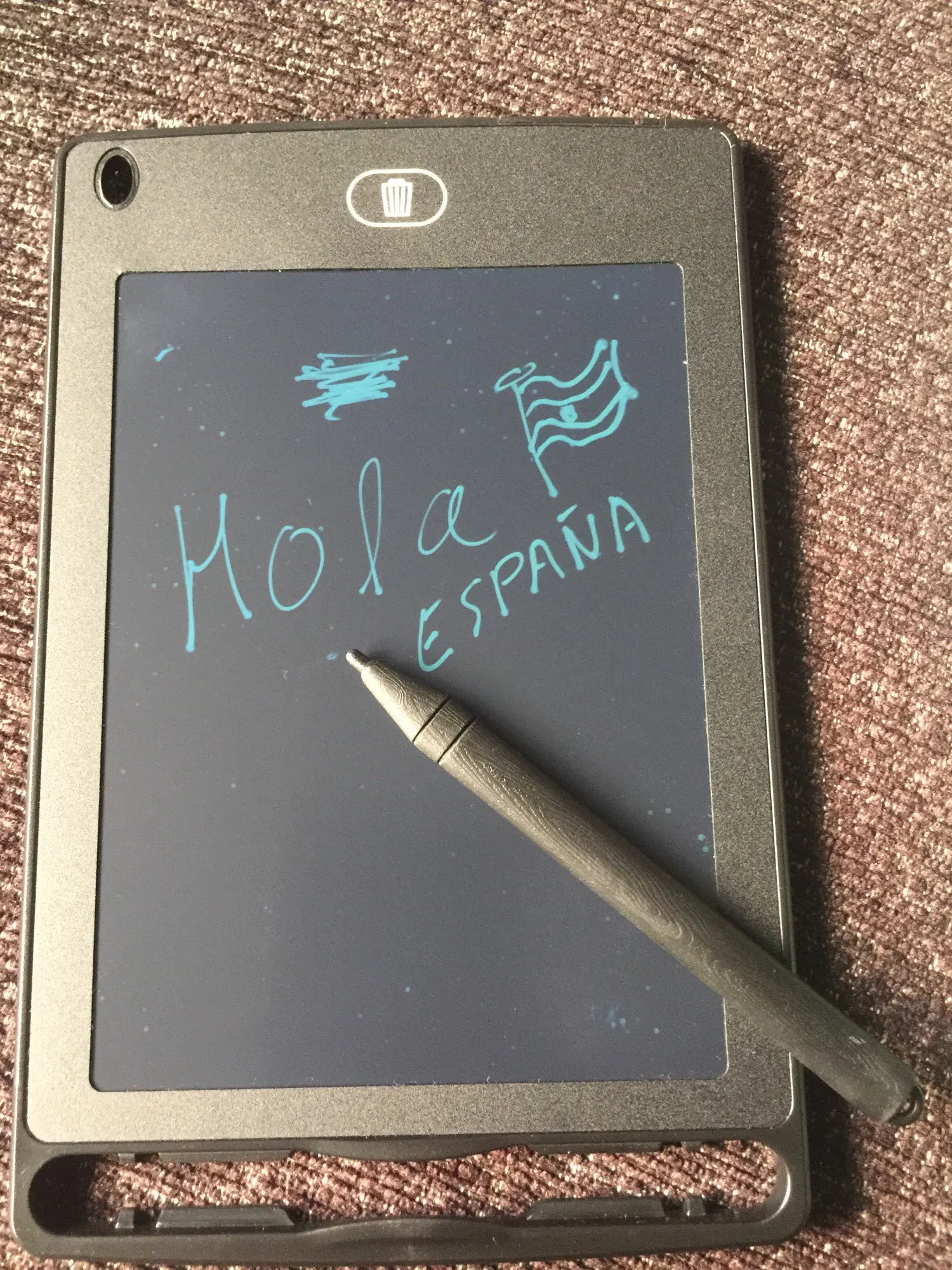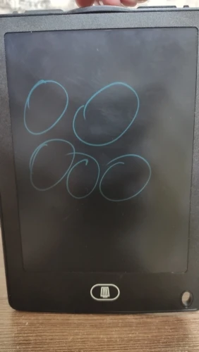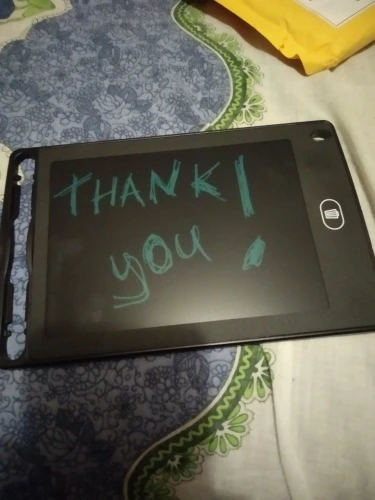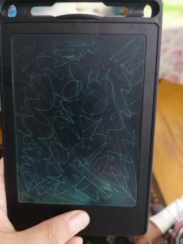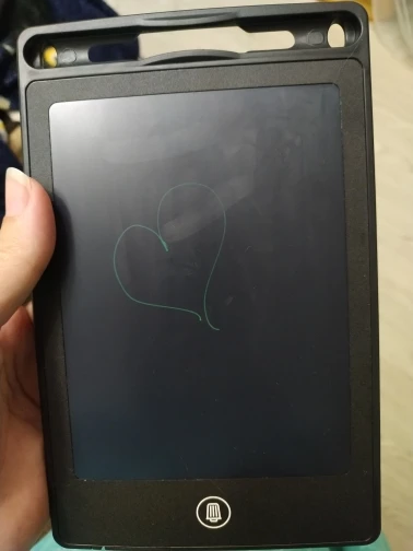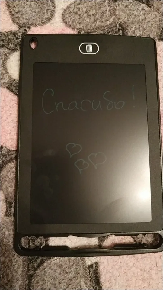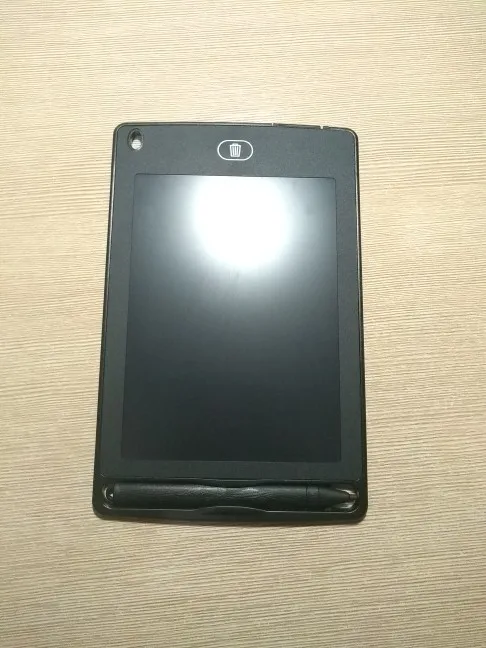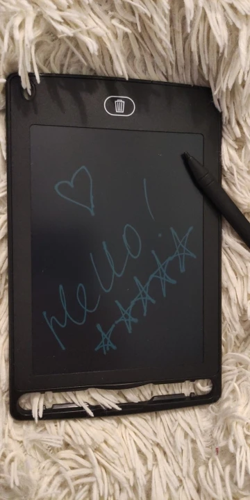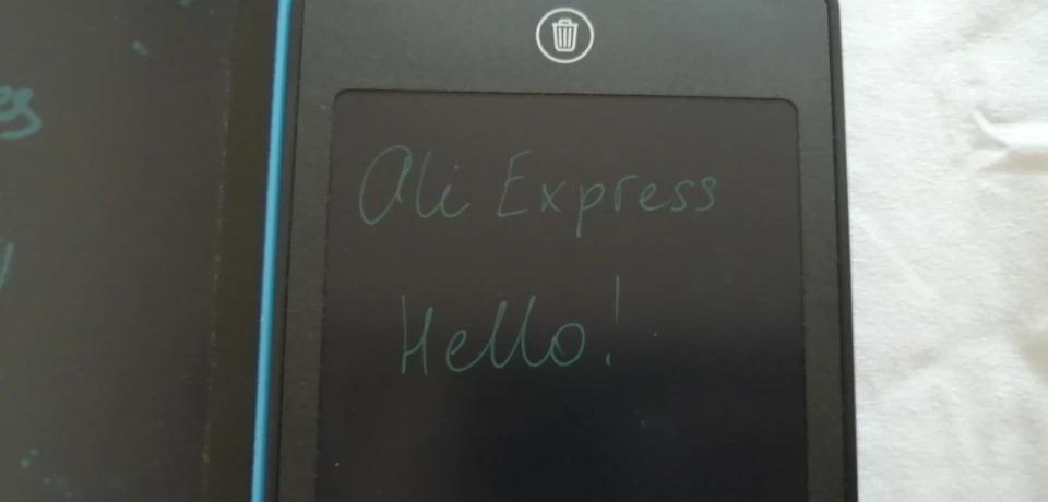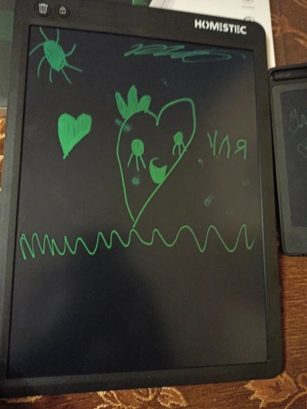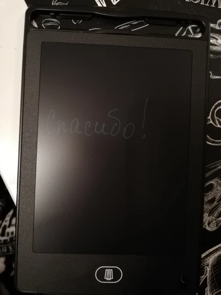 Отличный планшет за свою стоимость. Рисует ярко салатовым цветом. Кнопка корзины удаляет полностью рисунок или надпись. Сзади есть кнопка отключения и включения. Батарейку можно менять