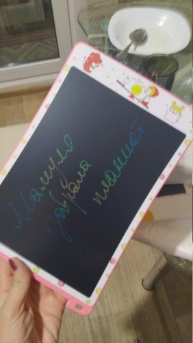 Отличная рисовалка, уже не первая купленная в этом магазине, качество товара на высоте и внимательность со стороны магазина также! Спасибо магазину за предоставленный купон, с его помощью покупка получилась за 100 ₽. О товаре: описанию соответствует, работает от батареи - таблетка 3 В., одна кнопка для стирания рисунка, а также ползунковый переключатель от случайного стирания. На экране есть защитная плёнка и как показал опыт продрать её очень трудно (следы оставить можно). Поставляется в картонной розничной упаковке, упаковано хорошо и аккуратно. Думаю, что по причине стоимости - была выбрана доставка без отслеживания (его и не было), время пересылки было долгим, но в результате - товар получен (правда за время пересылки села батарейка). Приятно, что не глядя на стоимость, магазином были выполнены все действия по заказу. Рисовалки рекомендую в данном магазине. Для старшего возраста обратите внимание на те в которых есть частичное стирание! Магазину спасибо, будем дружить дальше!!!