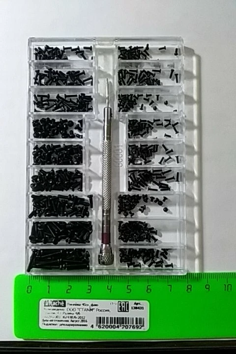 Винты нормальные. Отвёртка тоже. Товар пришёл за 17 дней. В коробке винты перемешались. 500 мелких винтов перемешались. Раскладывать - трудоёмкое занятие, а причина в том, что коробка не имеет защёлок, а продавец не закрепил её дополнительно упаковочной плёнкой или скотчем.