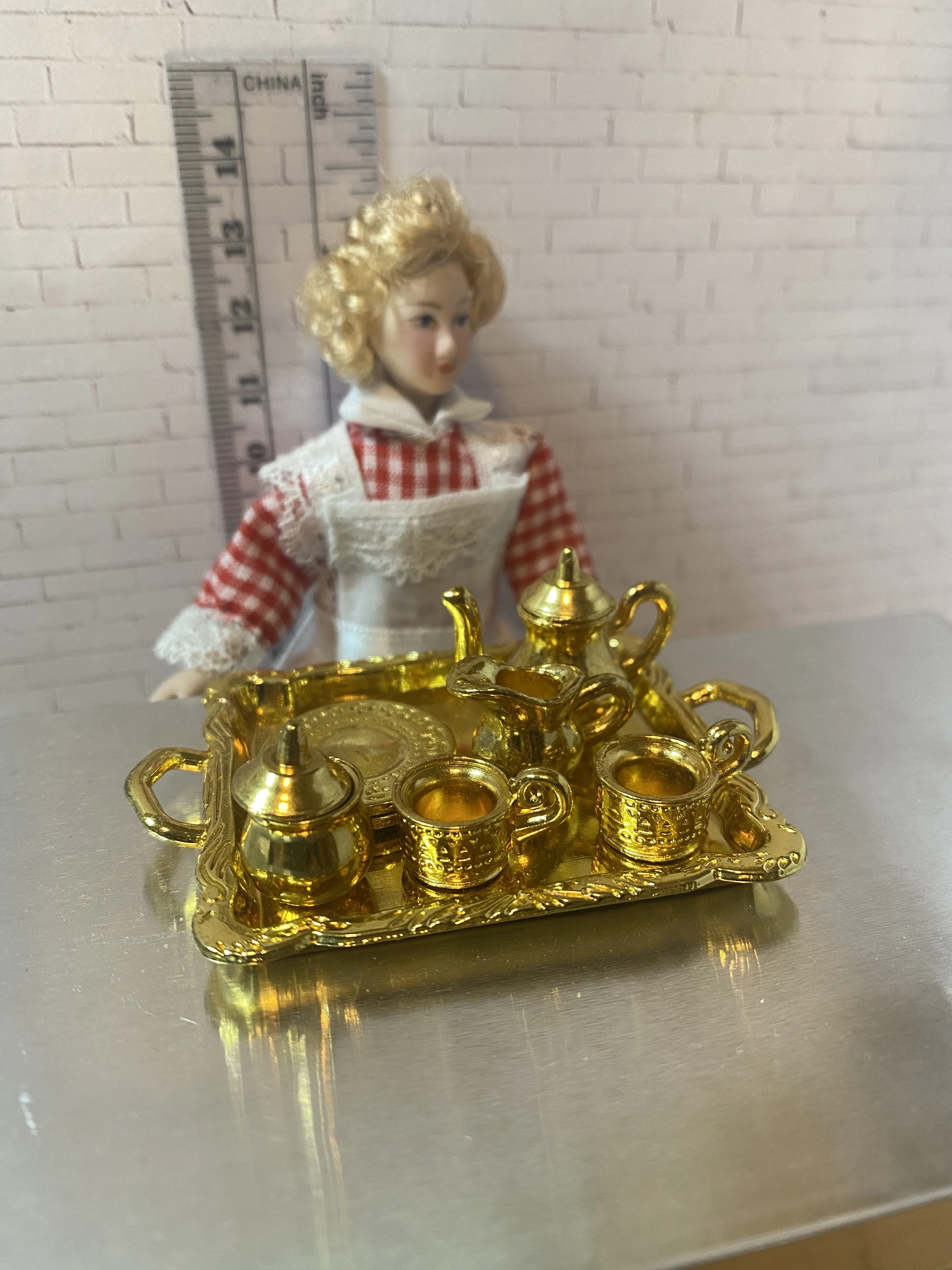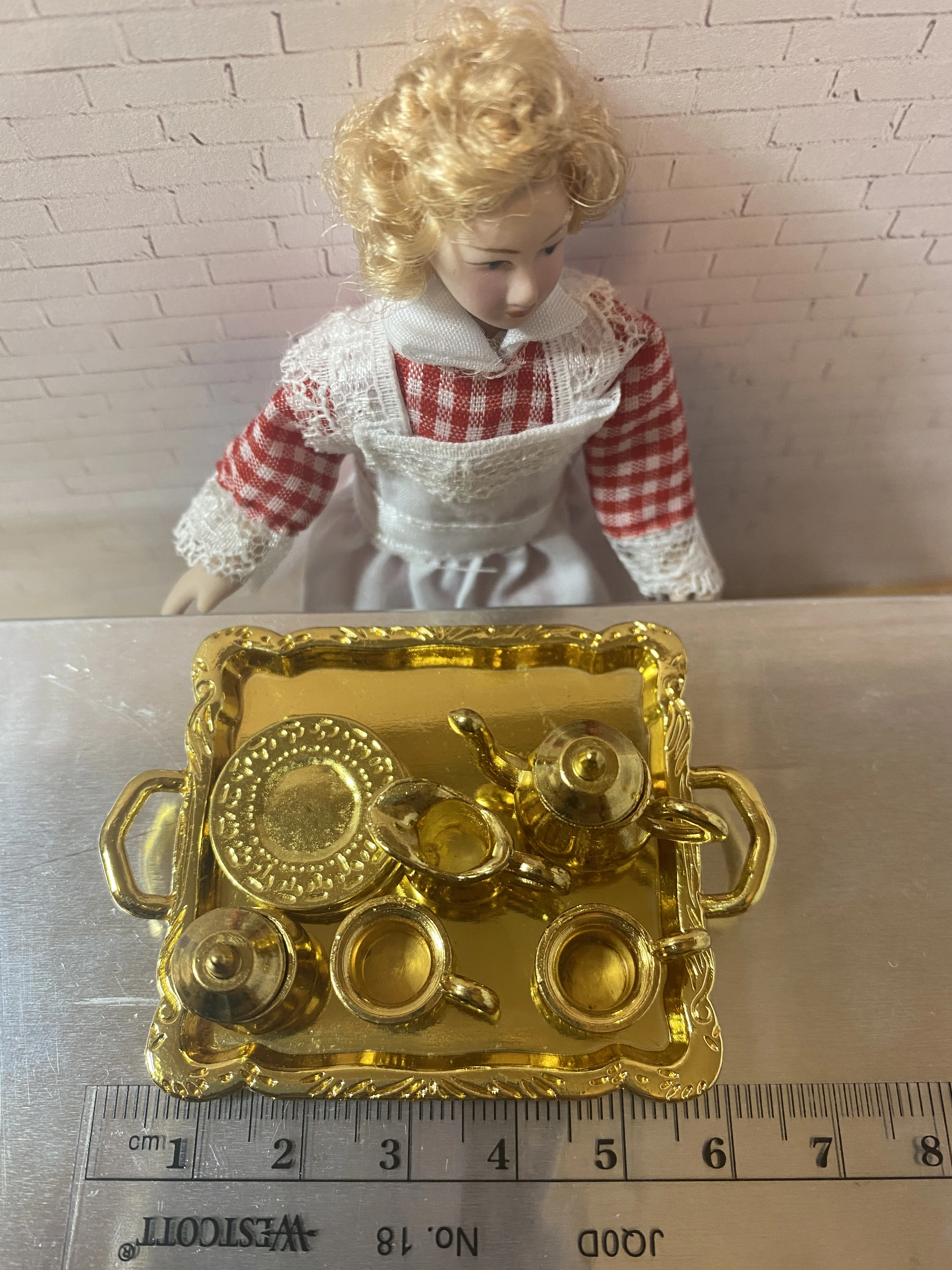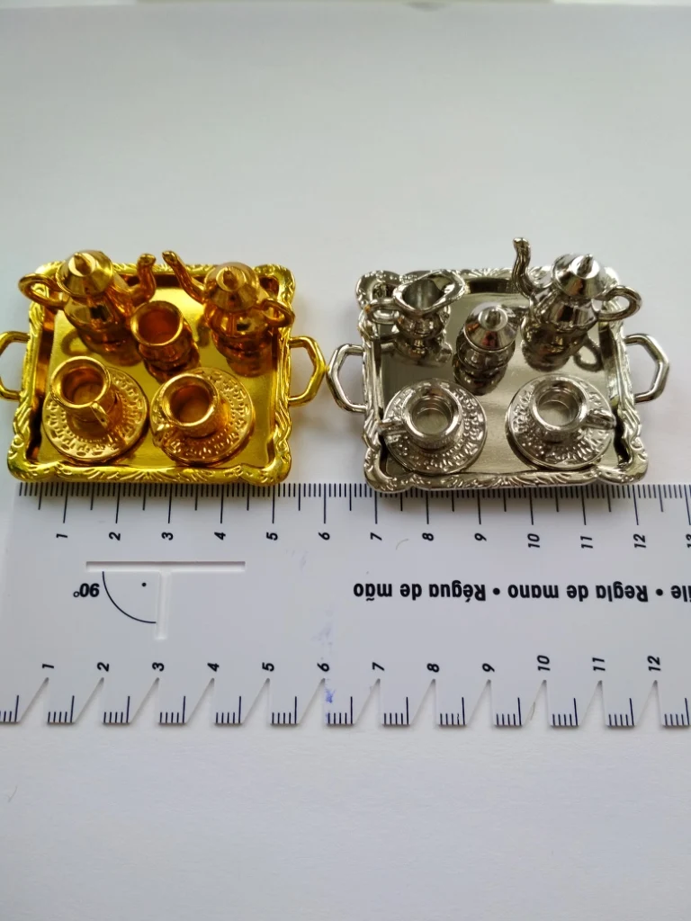Пришло за две недели. Комплект как описывается, упакован хорошо, размер 1:12. Не такая изящная работа, как я надеялась, но все равно смотрится хорошо.