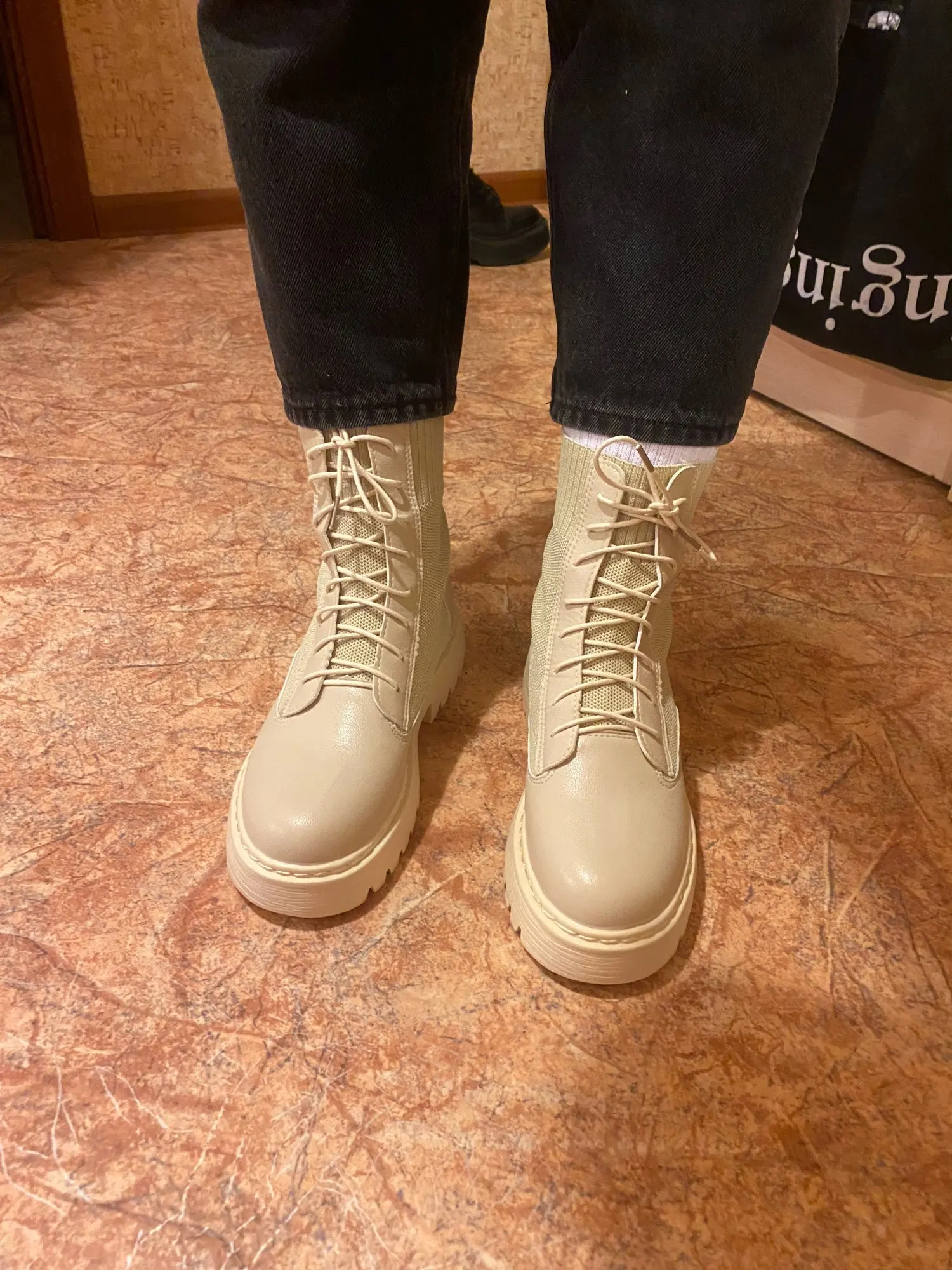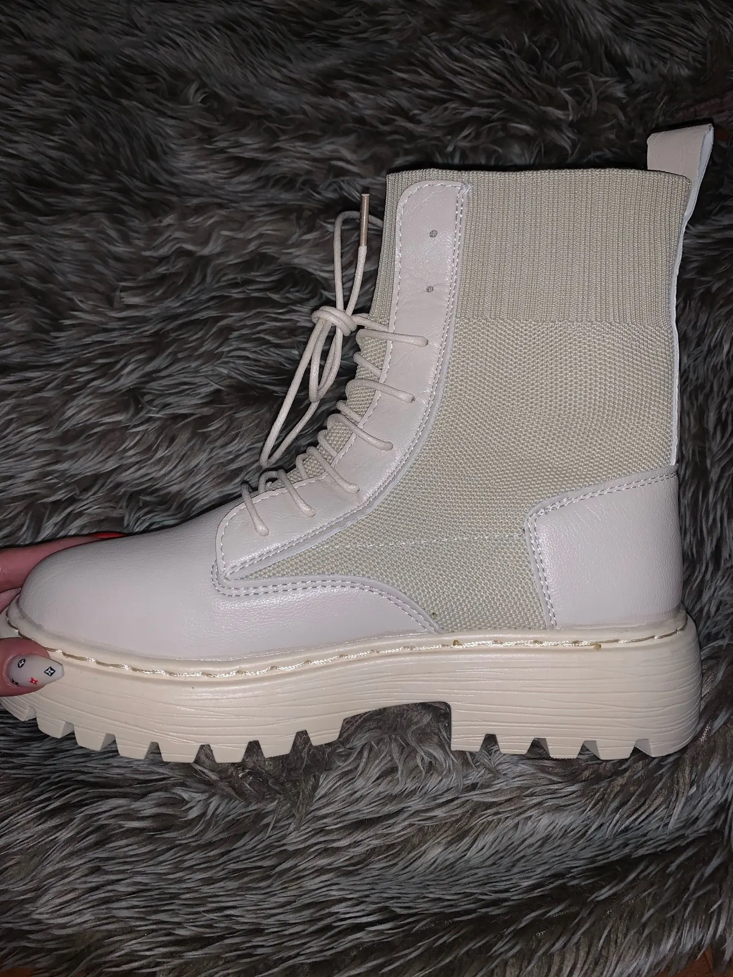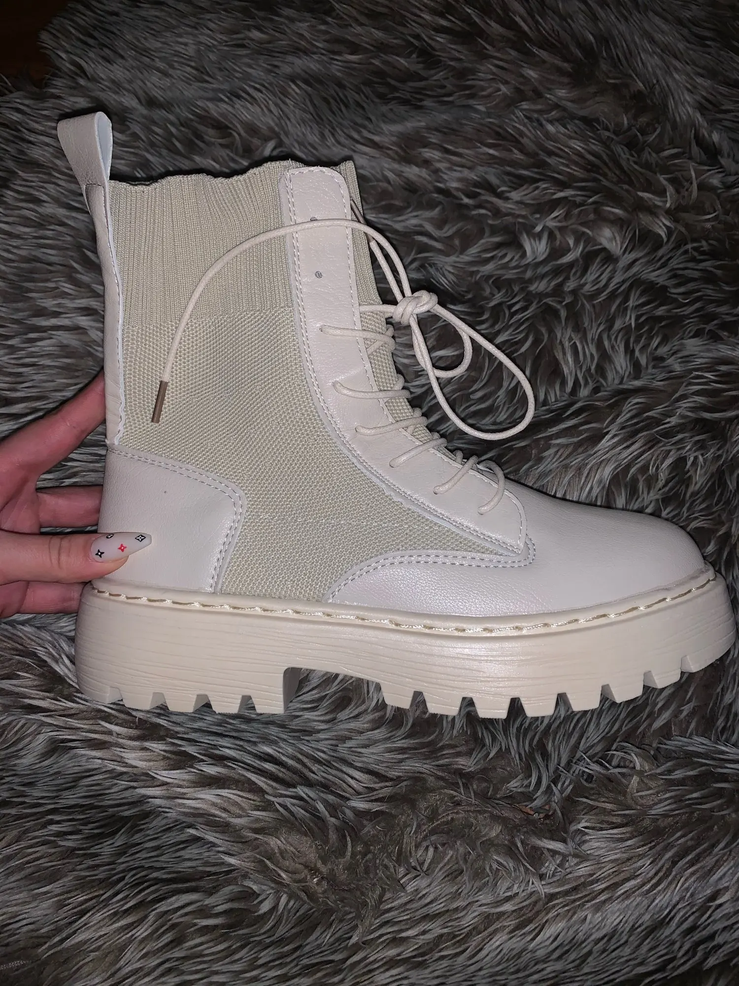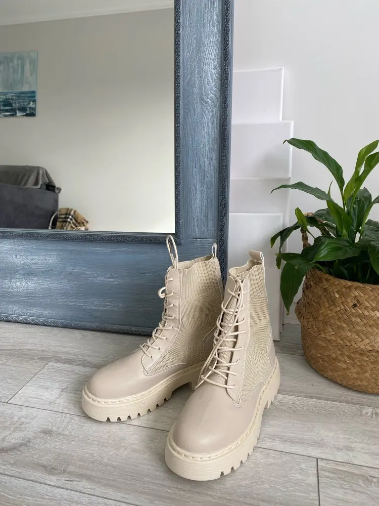 очень понравились боты. взяла на размер больше (у меня 35 рус - 22.5 см) подошли, чуть с запасом. меньшие бы тоже были хороши. упакованы были в качественно. дошли очень быстро, в пункт выдачи. жить будут, наверняка, недолго, но я знала это, когда заказывала (если сильно затянуть шнурки, можно порвать петли). резинка хорошая, прошиты, легкие, без дефектов)