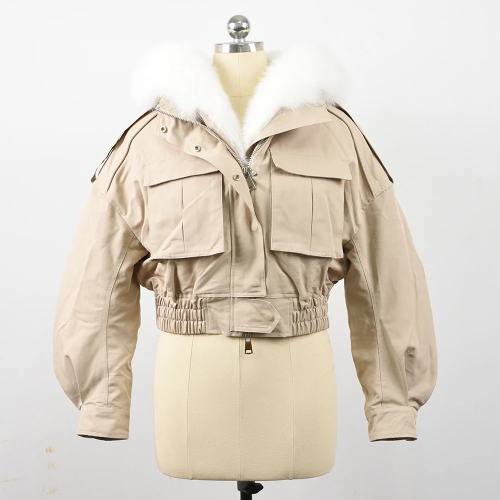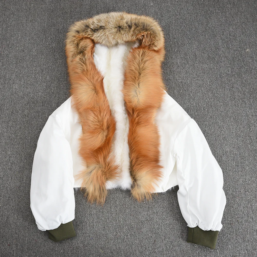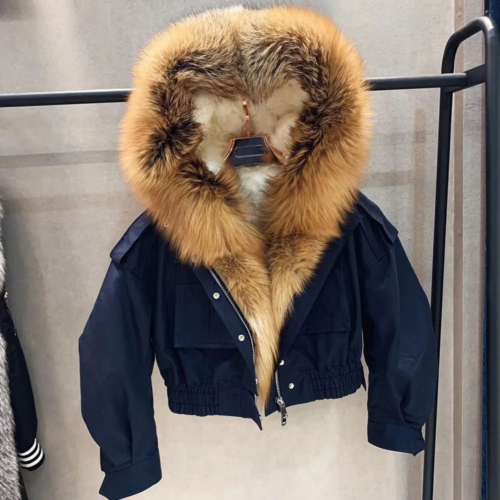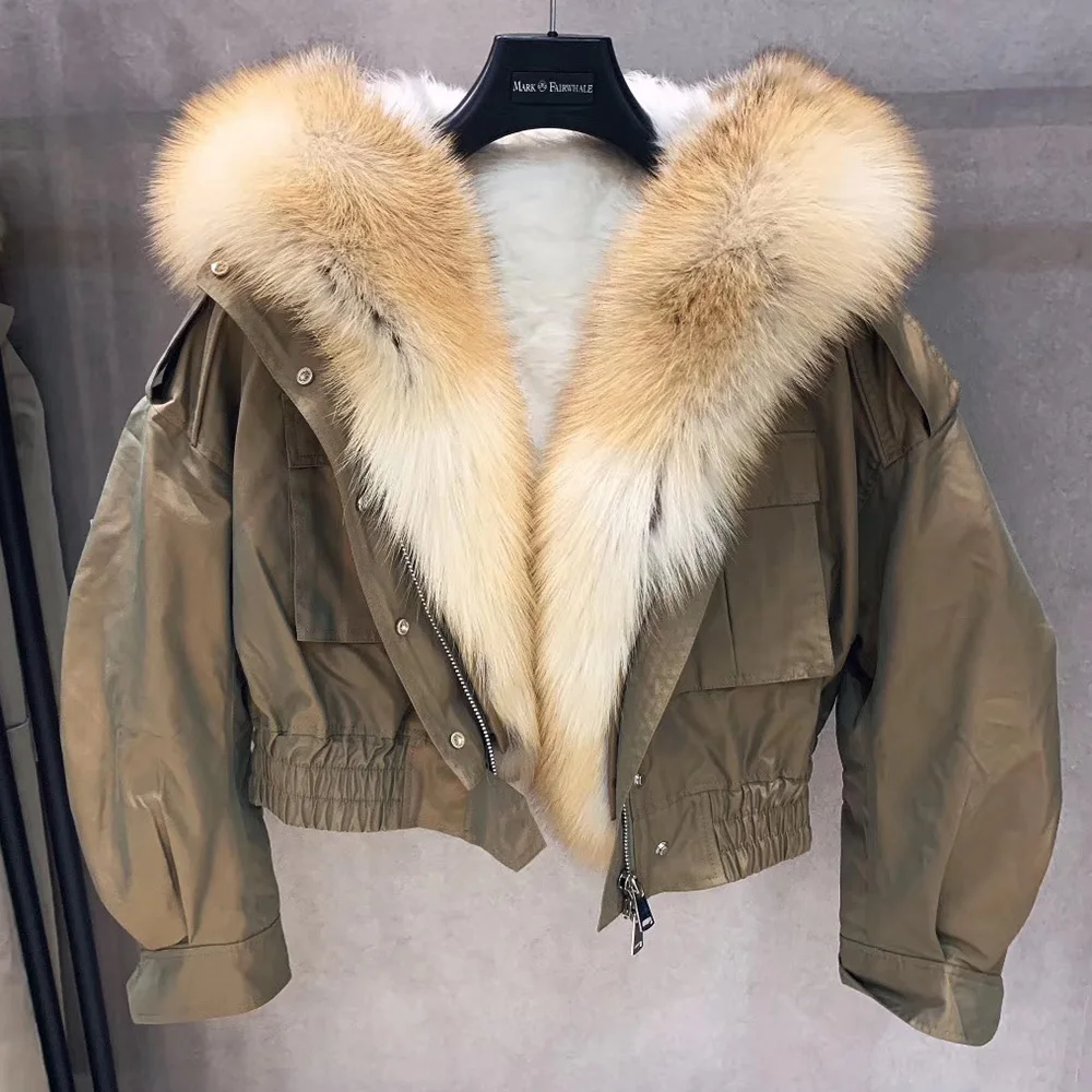 Женская короткая куртка-бомбер со съемной подкладкой из натурального меха овечьей шерсти, короткая куртка с серебристой и красной лисой на воротнике, S7652