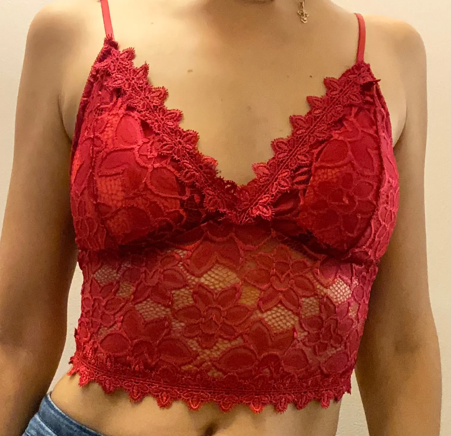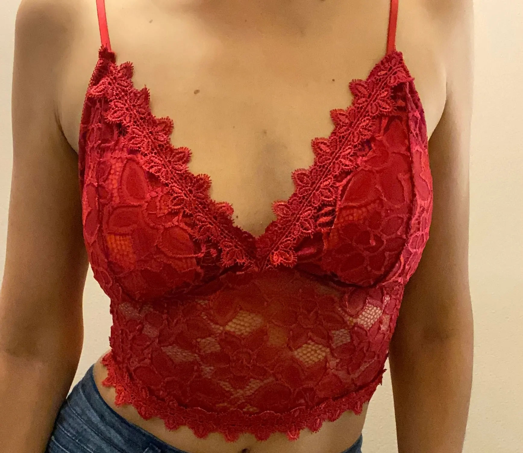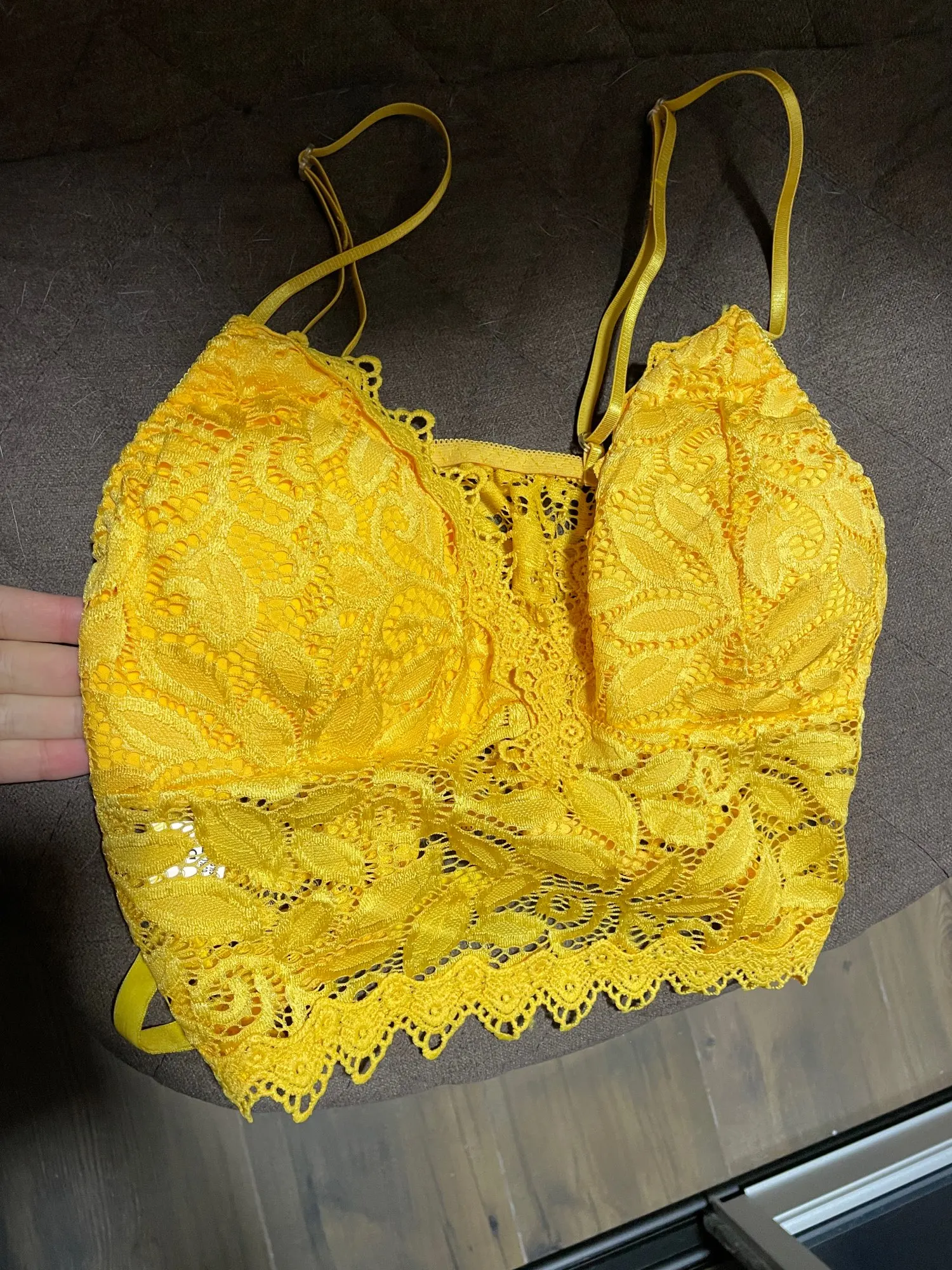 Разочаровывающее качество. Слишком тонкий материал. Просвечивают поролоновые, желтые вставки в чашках. Я покупала такие же топы у другого продавца и такого не было. А здесь кружево очень тонкое и выглядит дёшево.