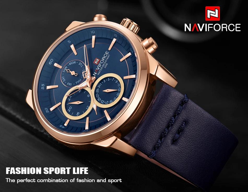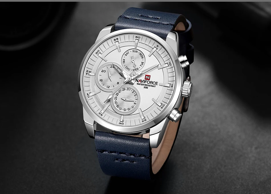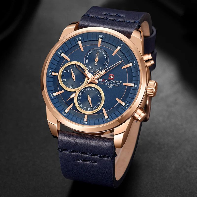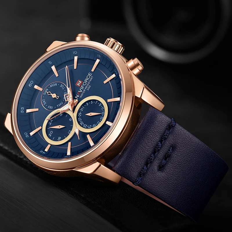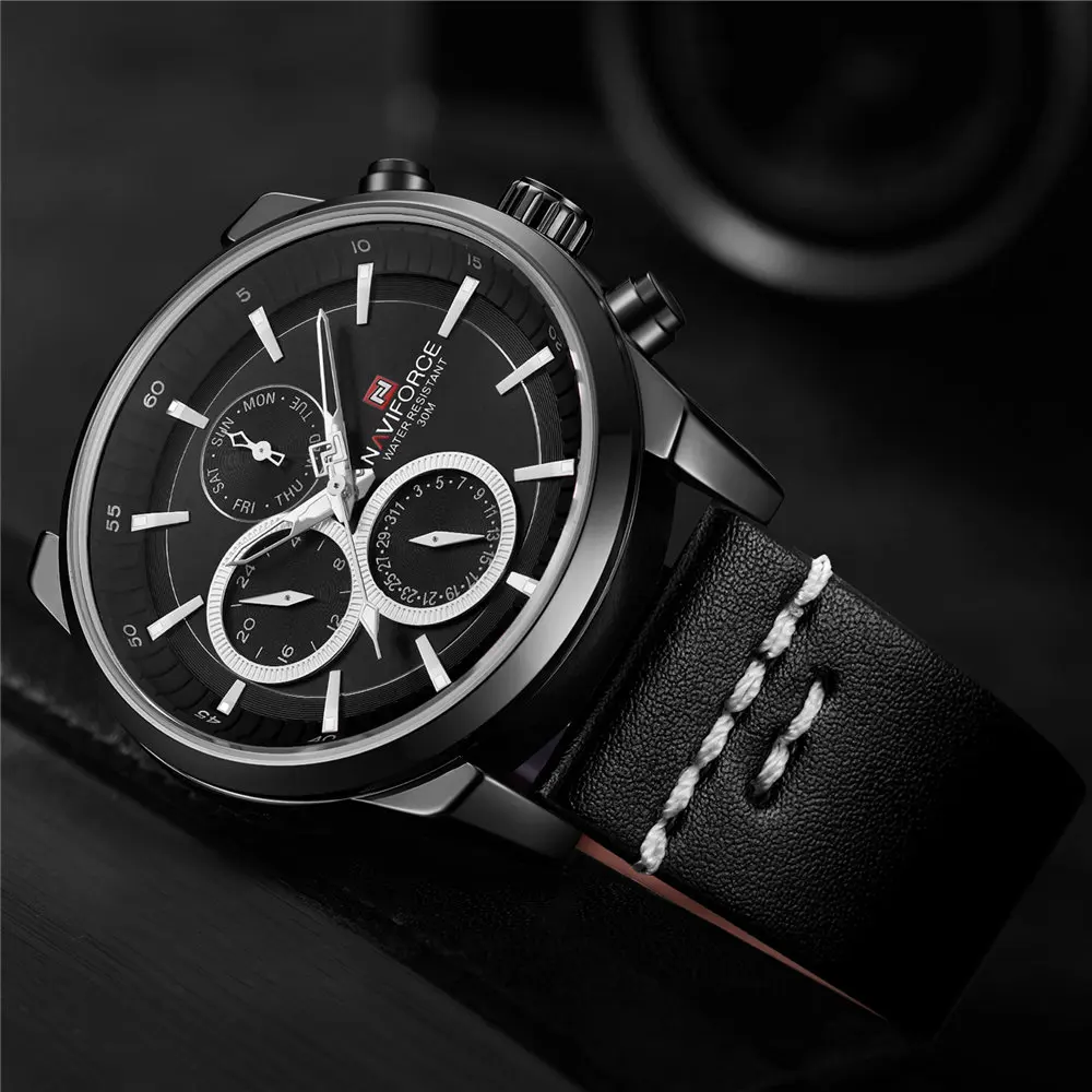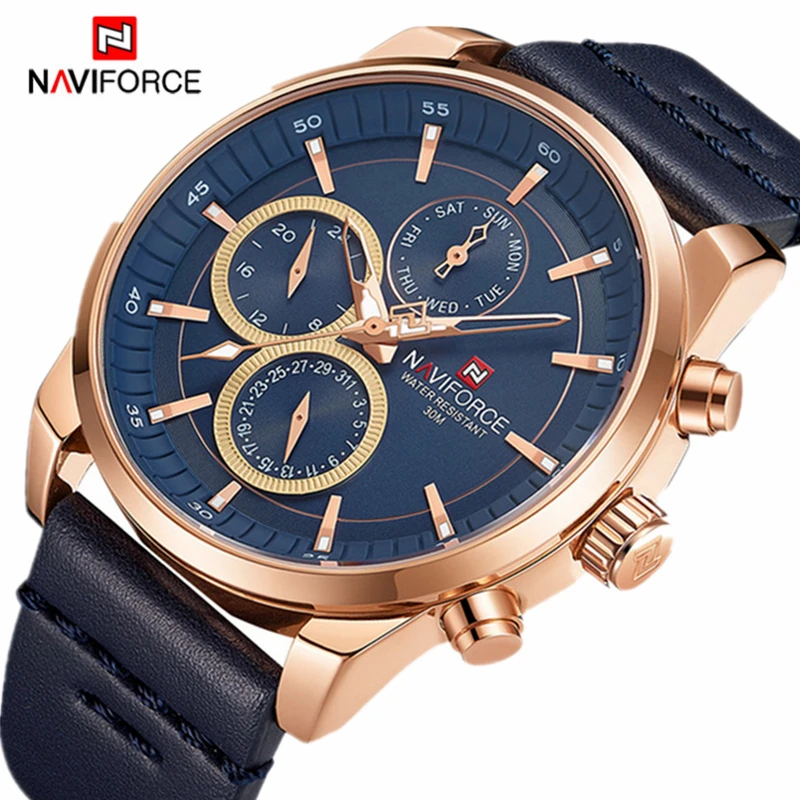 Часы наручные NAVIFORCE Мужские кварцевые, роскошные спортивные водонепроницаемые с кожаным ремешком, с отображением даты и недели, 24 часа в сутки