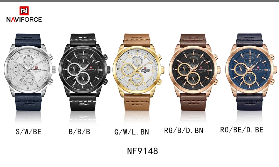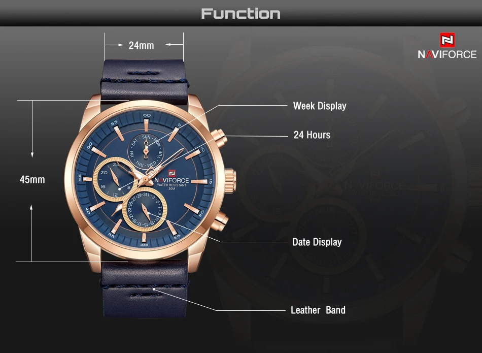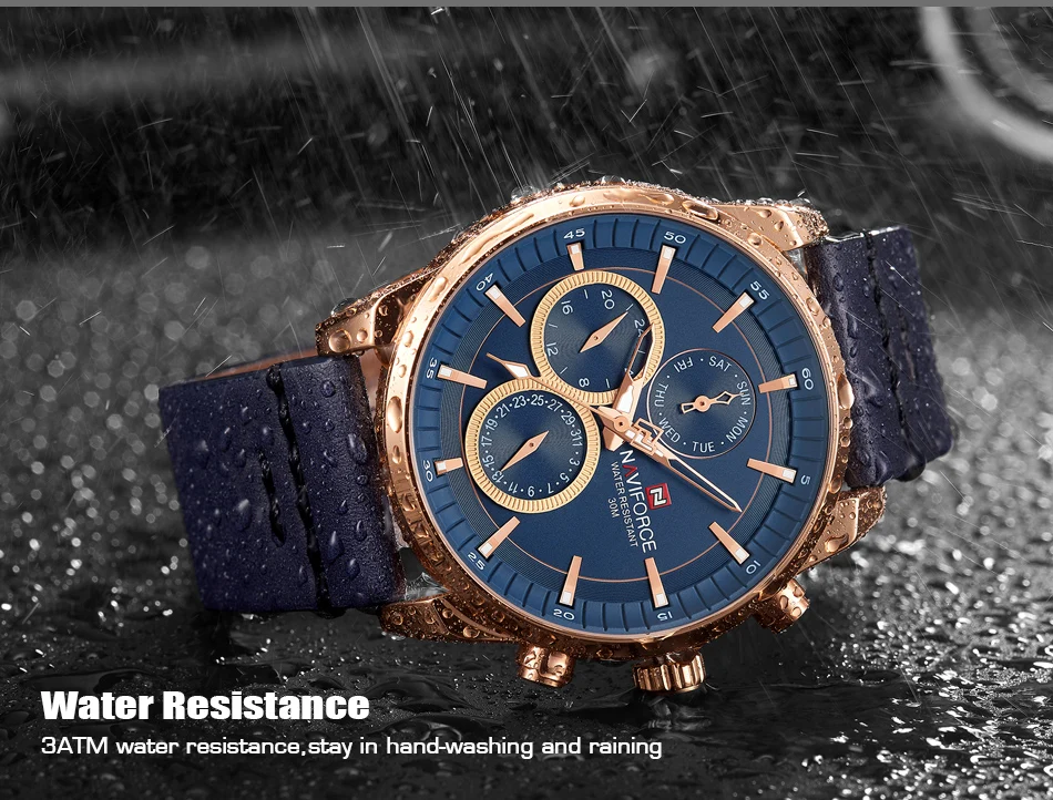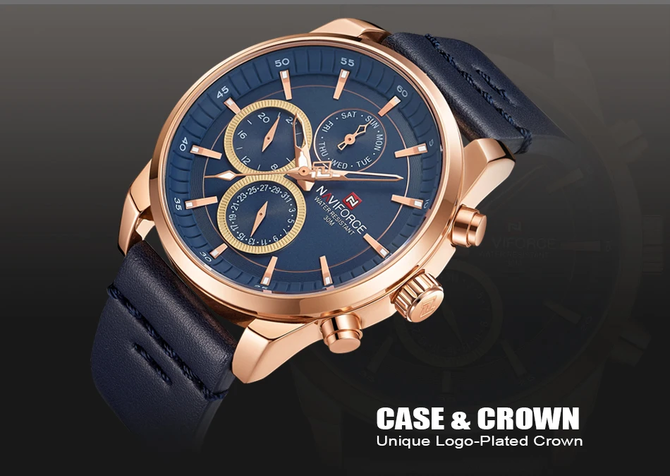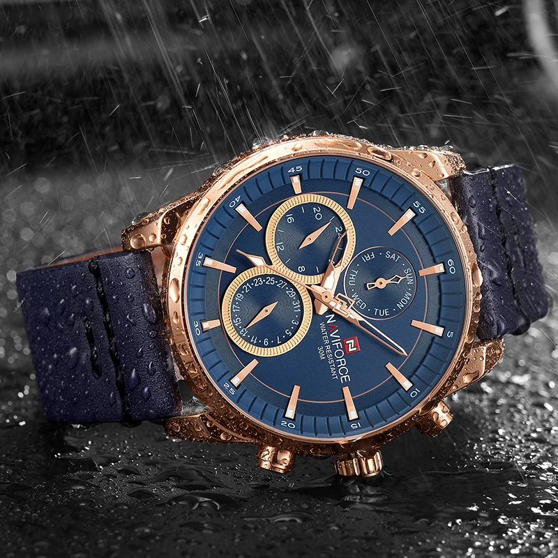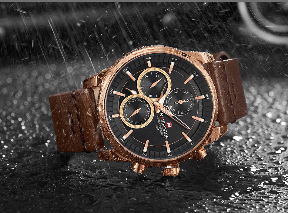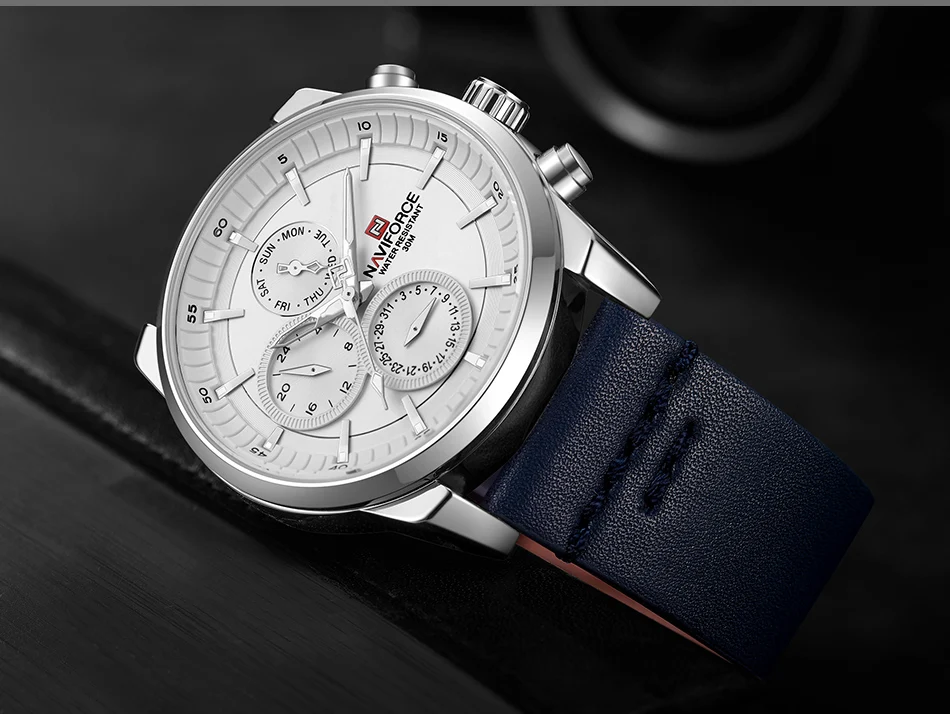 Часы наручные NAVIFORCE Мужские кварцевые, роскошные спортивные водонепроницаемые с кожаным ремешком, с отображением даты и недели, 24 часа в сутки