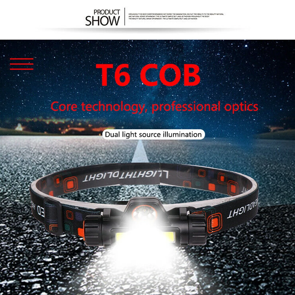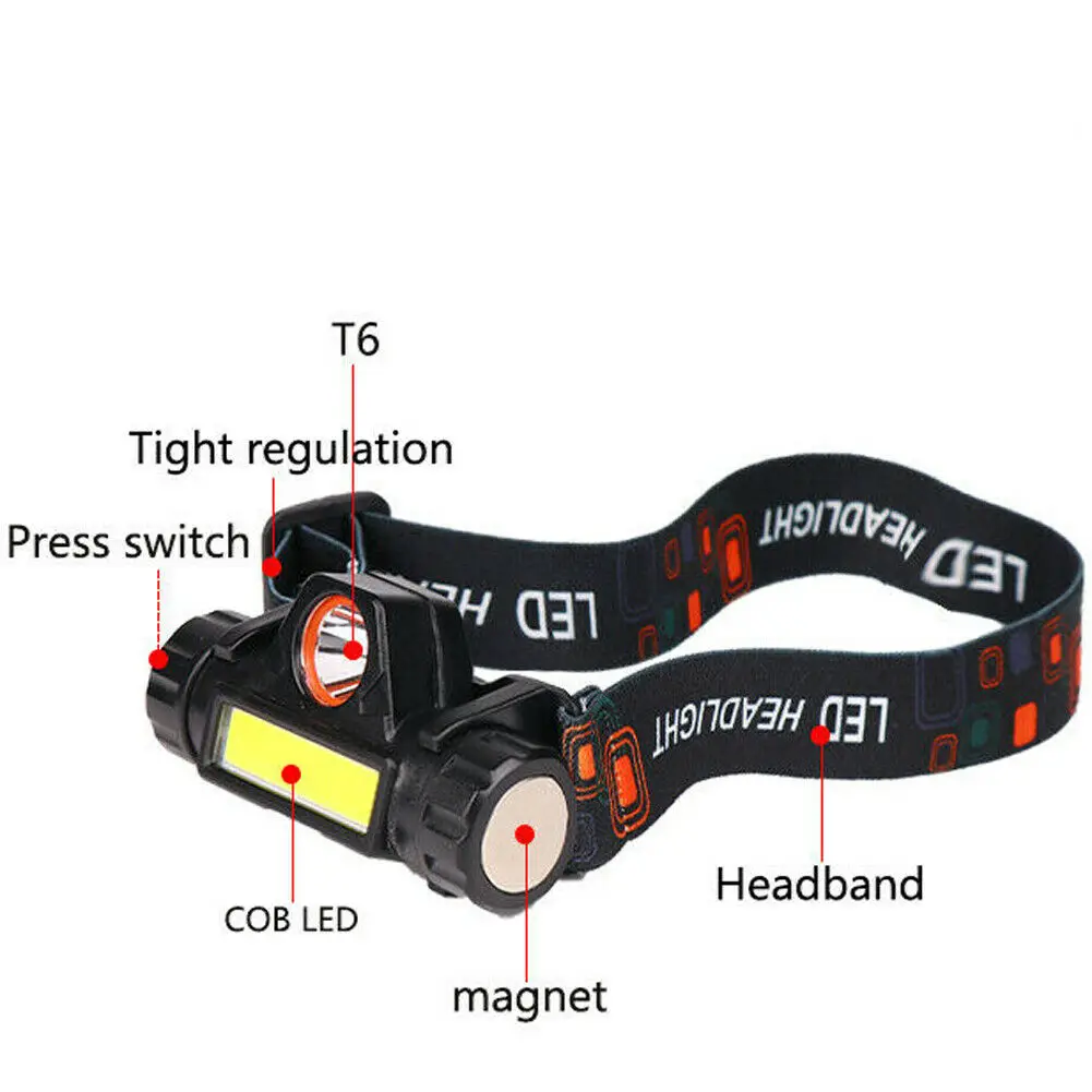 Портативный мини-фонарик XPE + COB, светодиодный налобный фонарь + Встроенный литиевый аккумулятор 1200 мАч, уличный фонарь для кемпинга