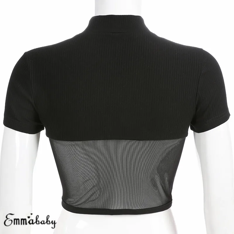 Сексуальная прозрачная уличная одежда, рубашка с коротким рукавом, женский черный сетчатый патч-майки, укороченный топ, Женская Клубная одежда, облегающий Топ