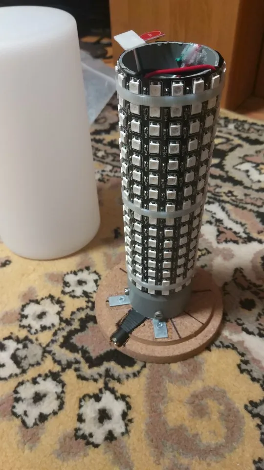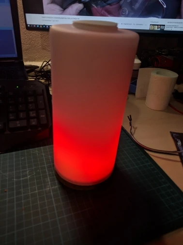 Получил, спаял на скорую руку не собирая в корпус, всё завелось, работало но криво. Изначально прошивка стоит, но какая-то кривая, работало только с сенсорной кнопки, через программу и вай-фай так и не подключилось. Потом перелопатив все возможные прошивки и программы, зашил себе от Gunner47 но уже модифицированную на 85 эффектов, программу взял Fire Lamp от Koteyka, человек из Украины пилит (красавчик), обновляется постоянно. Лампа преобразилась, в итоге просто ! Непередаваемое ощущение. Это только нужно видеть в живую, камера не передаёт даже половины вау-эффекта как в реальности. Поначалу часами можно залипать. При сборке есть нюансы. В пробковой подставке пришлось ножом вырезать место под разъем питания и провода. Плафон без верхних вырезов, здесь либо резать дырку под кнопку и что-то придумывать или как сделал я, посадил кнопку на двухсторонний скотч нацелился в центр, приклеил а затем надо ещё поизголяться чтобы "горячие сопли" туда залить, рука не пролазит в отверстие.