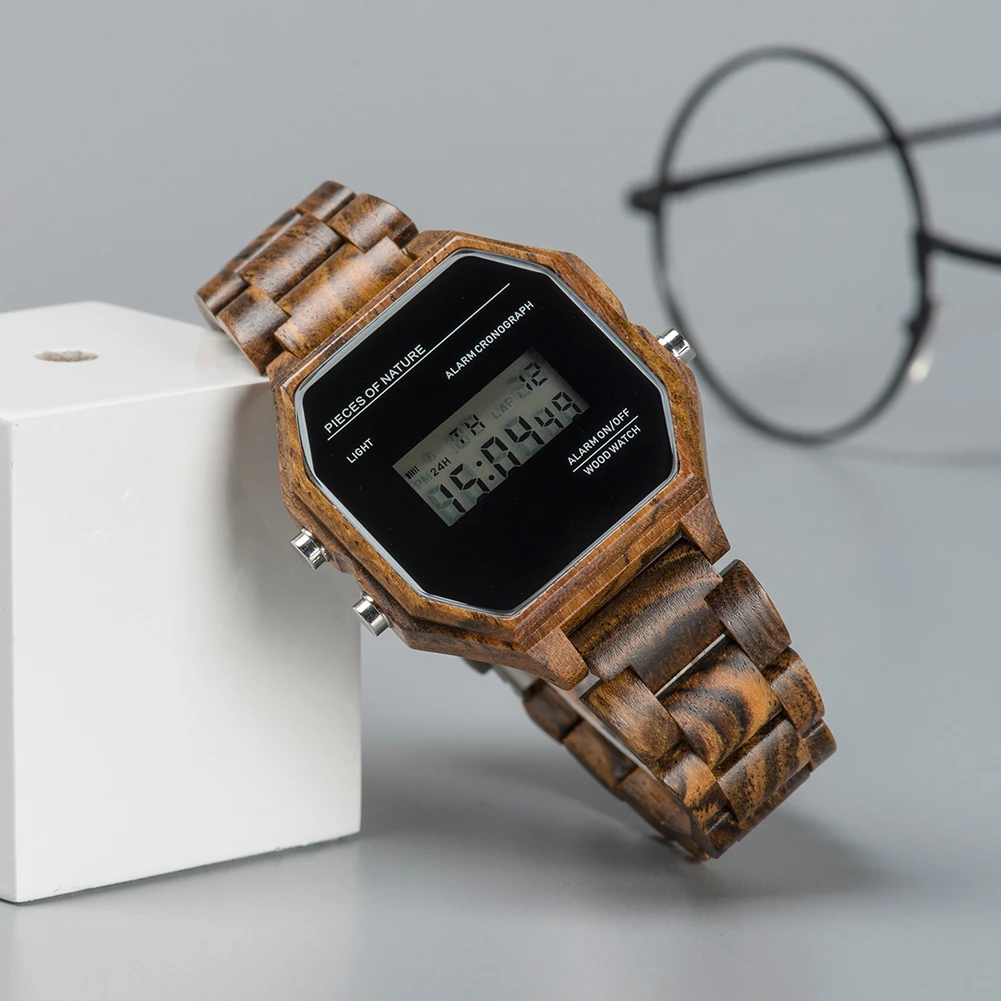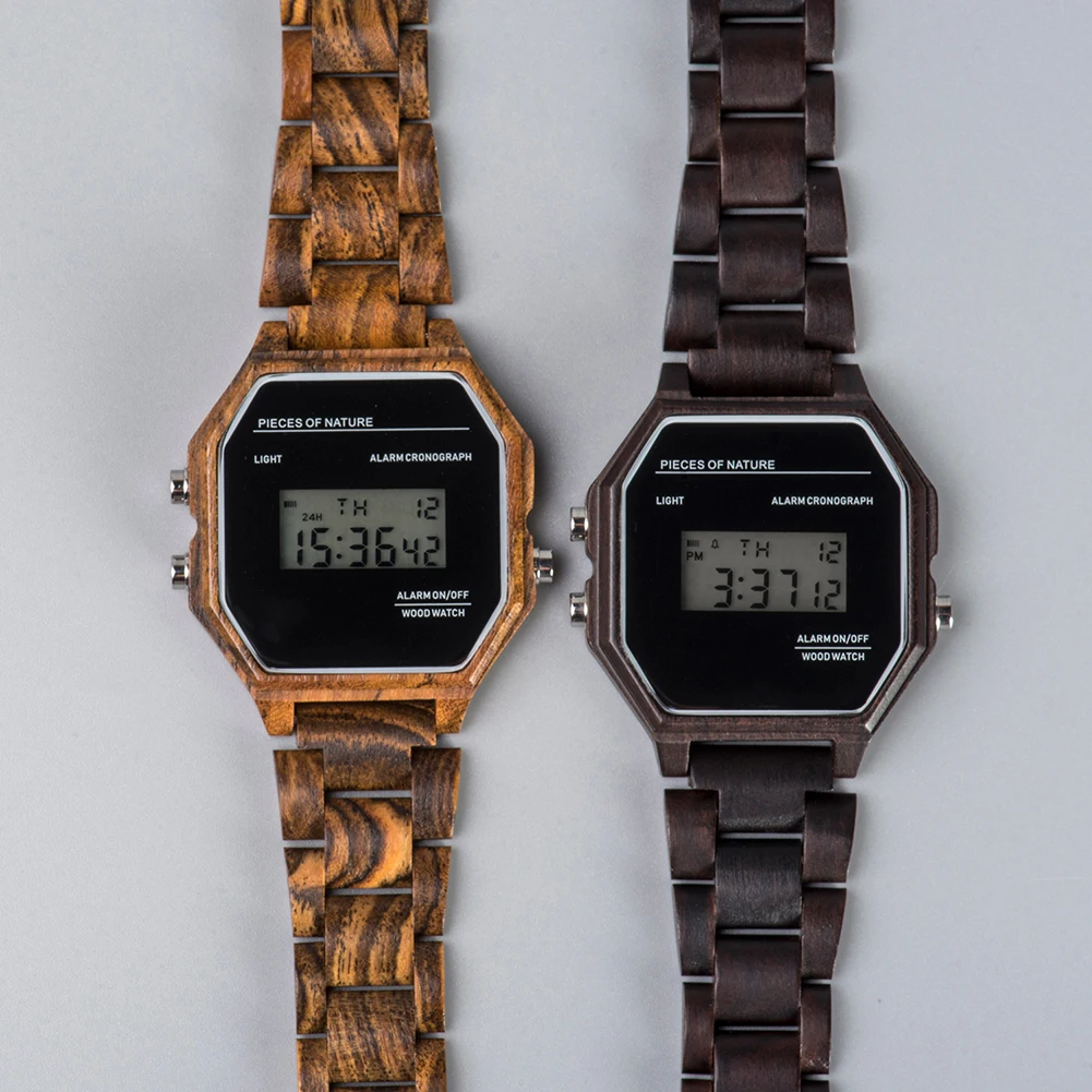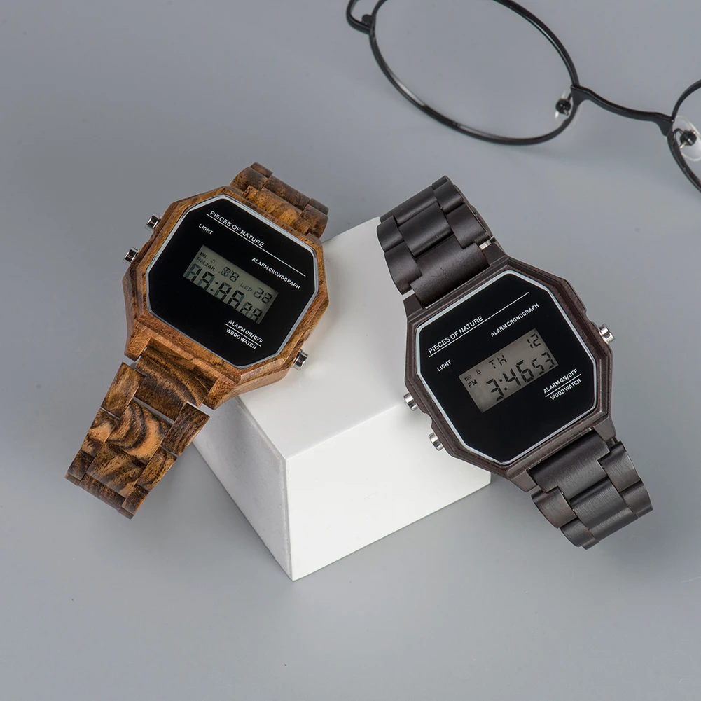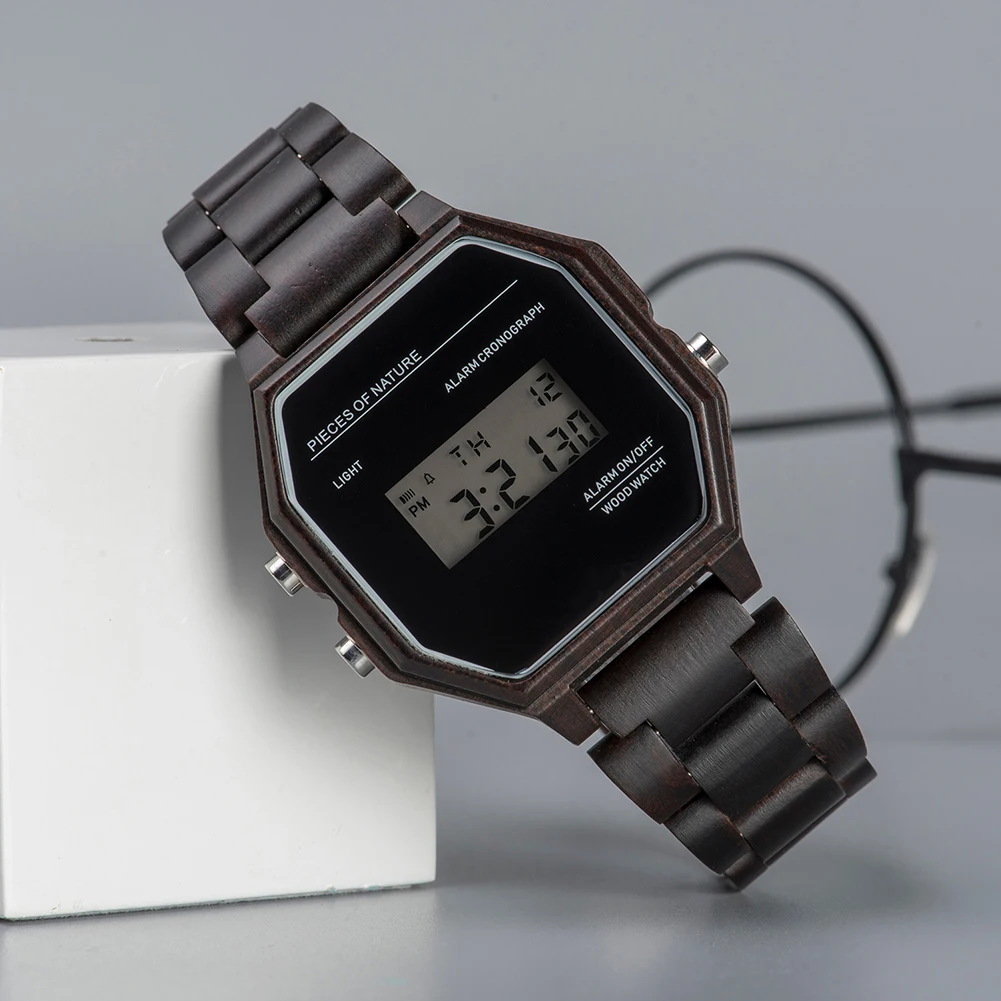Светящиеся цифровые наручные часы: светодиодный дисплейДеревянные часы: Эбеновое дерево и ЗебраПерсонализированные часы: engarve на задней крышкеМногофункциональный Relogio Masculino: будильник, отображение недели, отображение даты