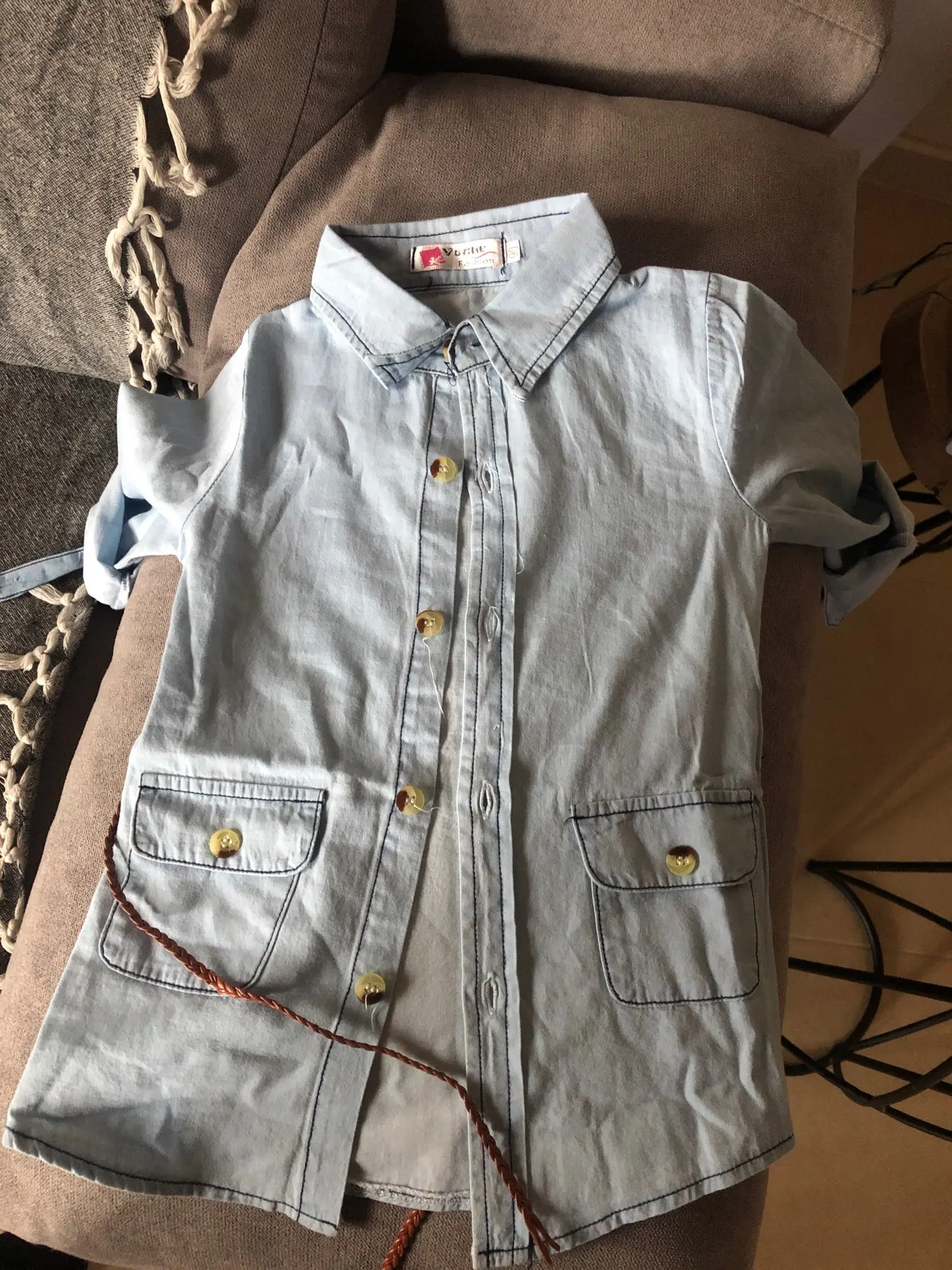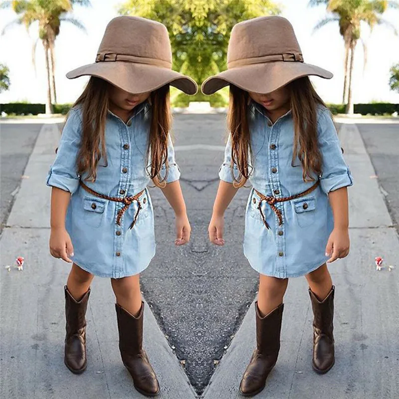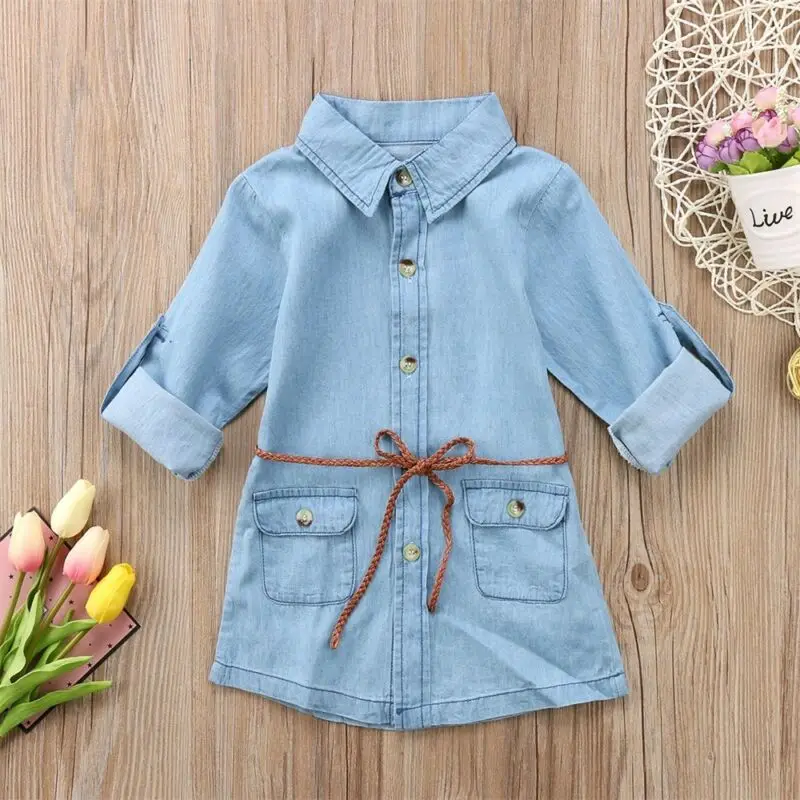 Джинсовое Короткое мини-платье с длинным рукавом и ремнем для девочек