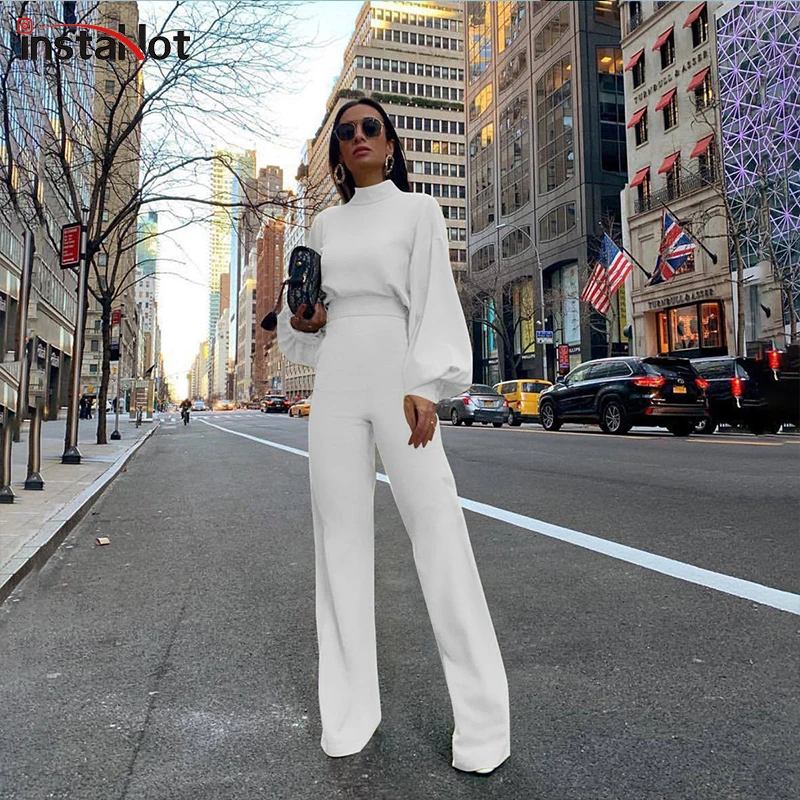 Женский костюм-двойка InstaHot, элегантный осенний офисный костюм с пышными длинными рукавами и расклешенными штанами