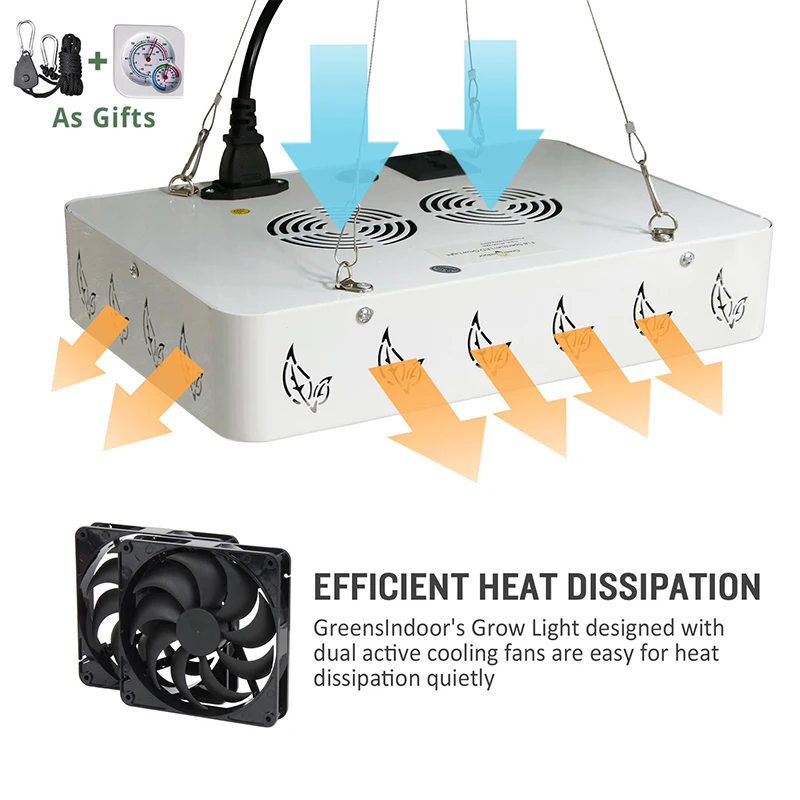 Меньше тепловых светодиодов более эффективны, чем HID и производят меньше тепла. Садовый светильник GreensIndoor, разработанный с двумя активными вентиляторами охлаждения, легко рассеивать тепло.