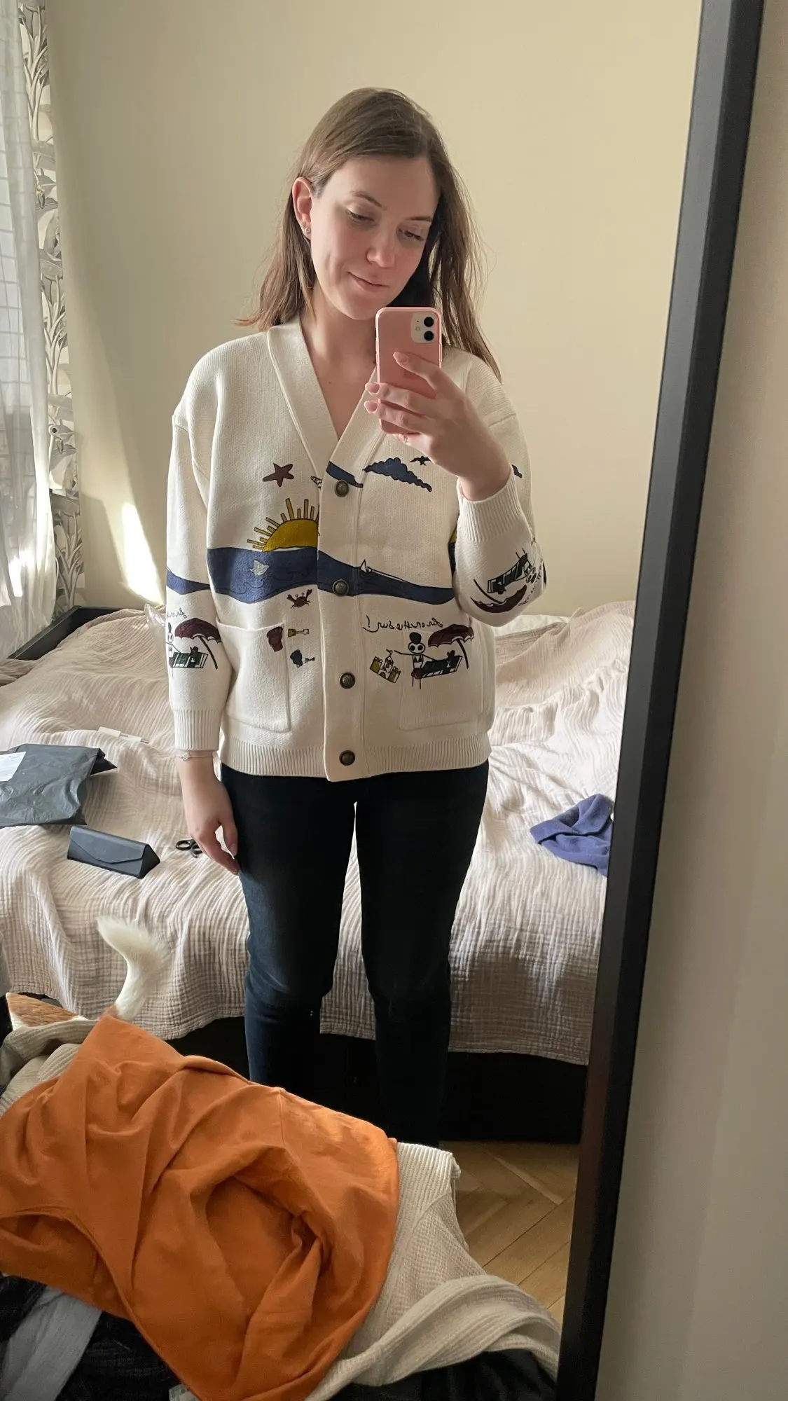 Хороший кардиган, качественный, приятный. На 46-48 российский сел хорошо. Немного коротковаты рукава, но некритично. Купила в том числе потому, что увидела рекламу в московском шоуруме, где он стоит 5900 р. Доставка быстрая, спасибо продавцу.