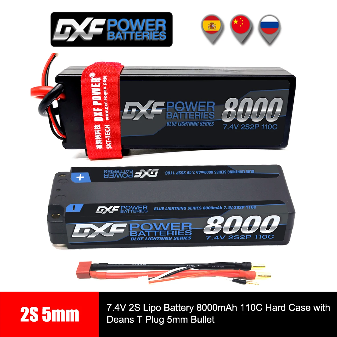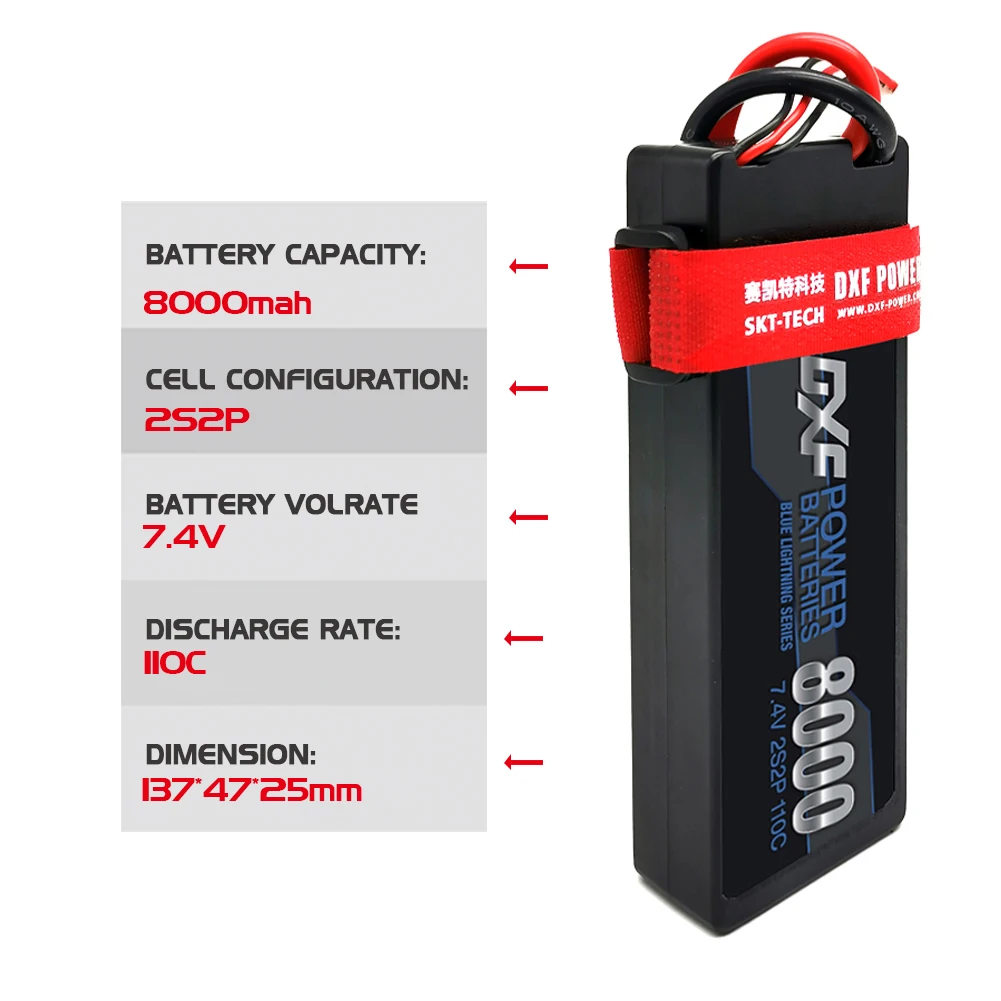 Литий-полимерный аккумулятор DXF 7,4 В 2S 8000 мАч 110C, жесткий чехол с T-образной вилкой Deans 5 мм, пуля для радиоуправляемого грузовика, автомобиля, Truggy, багги, хобби