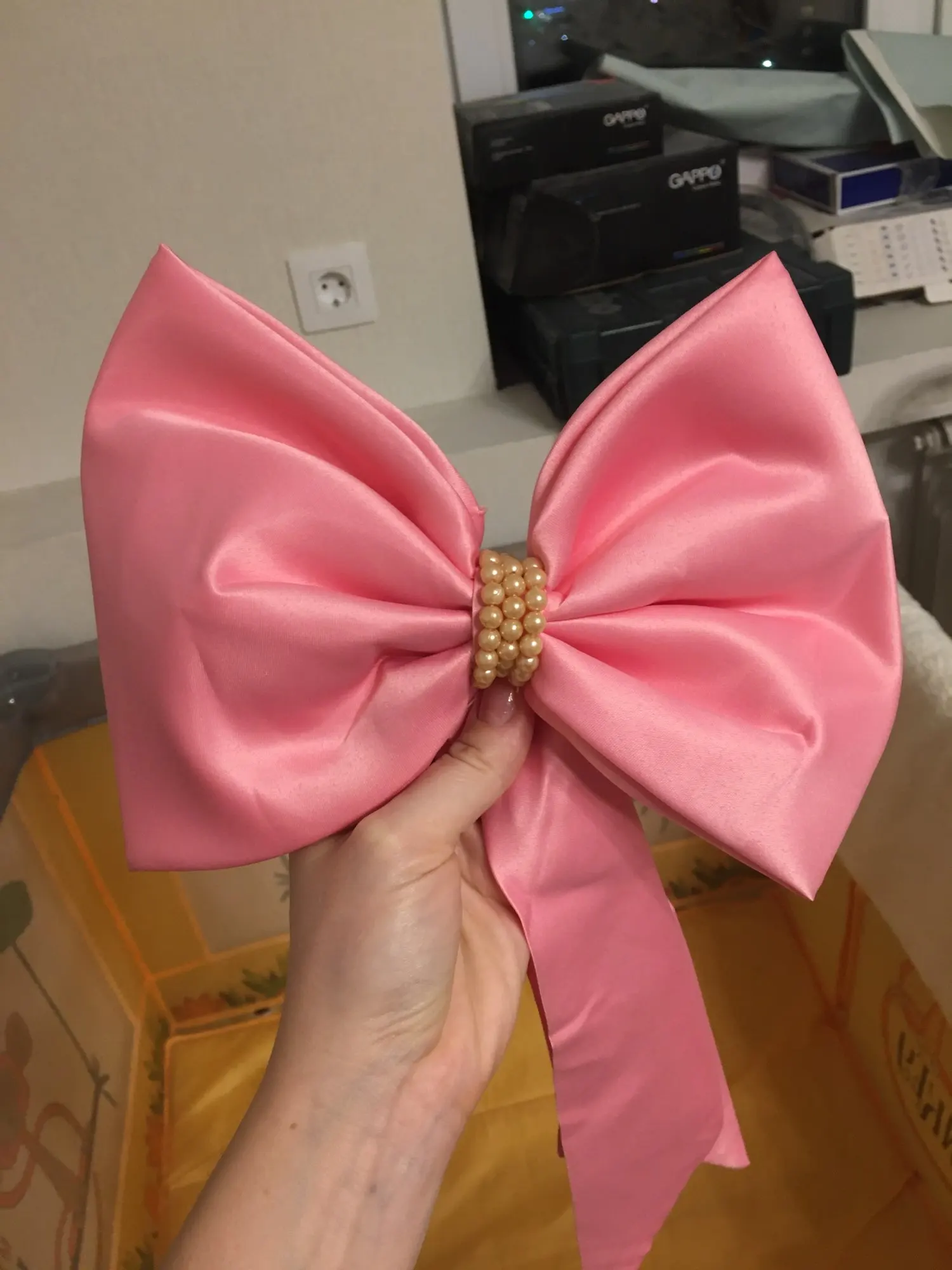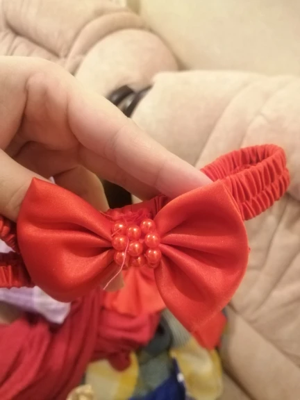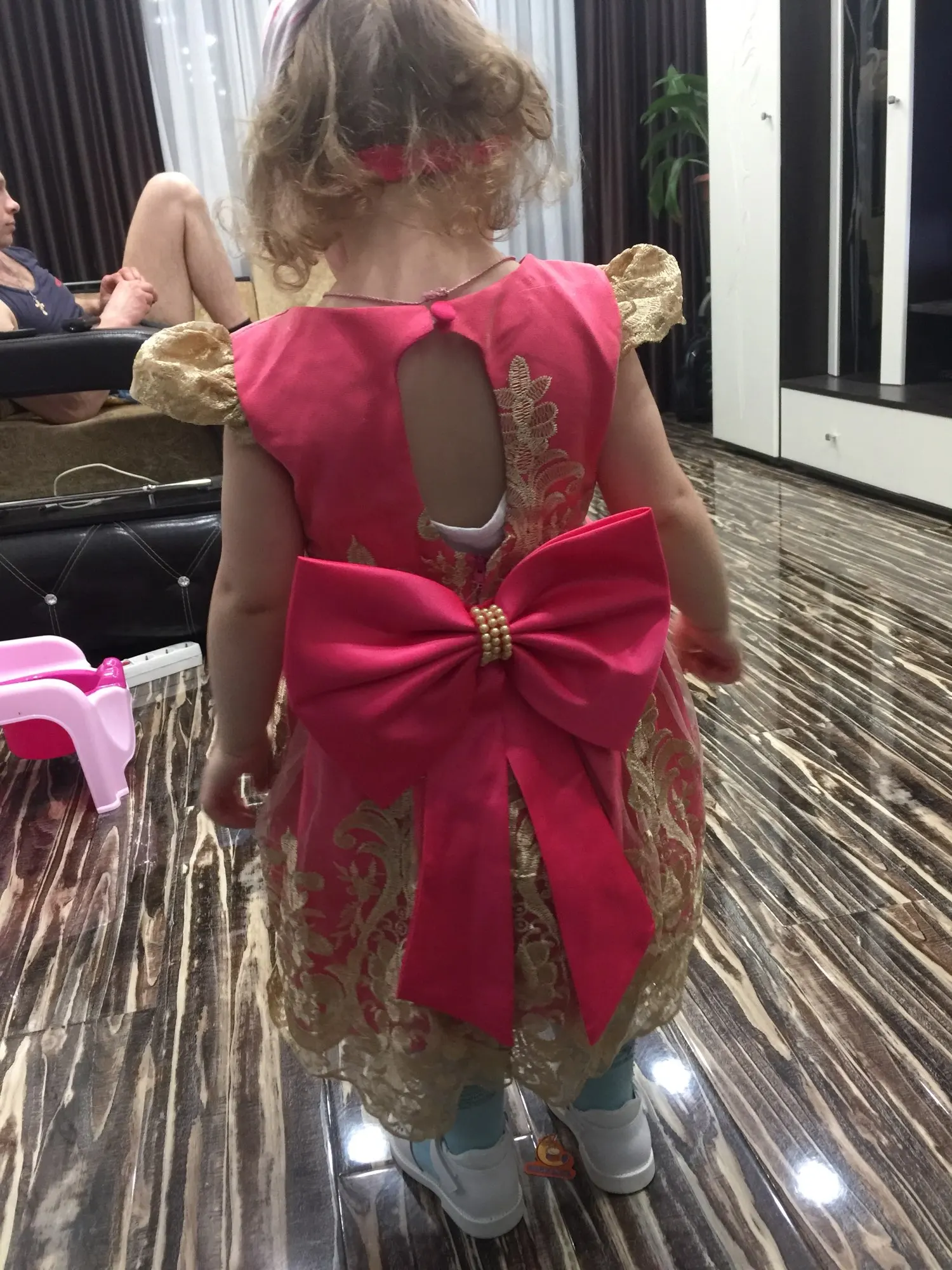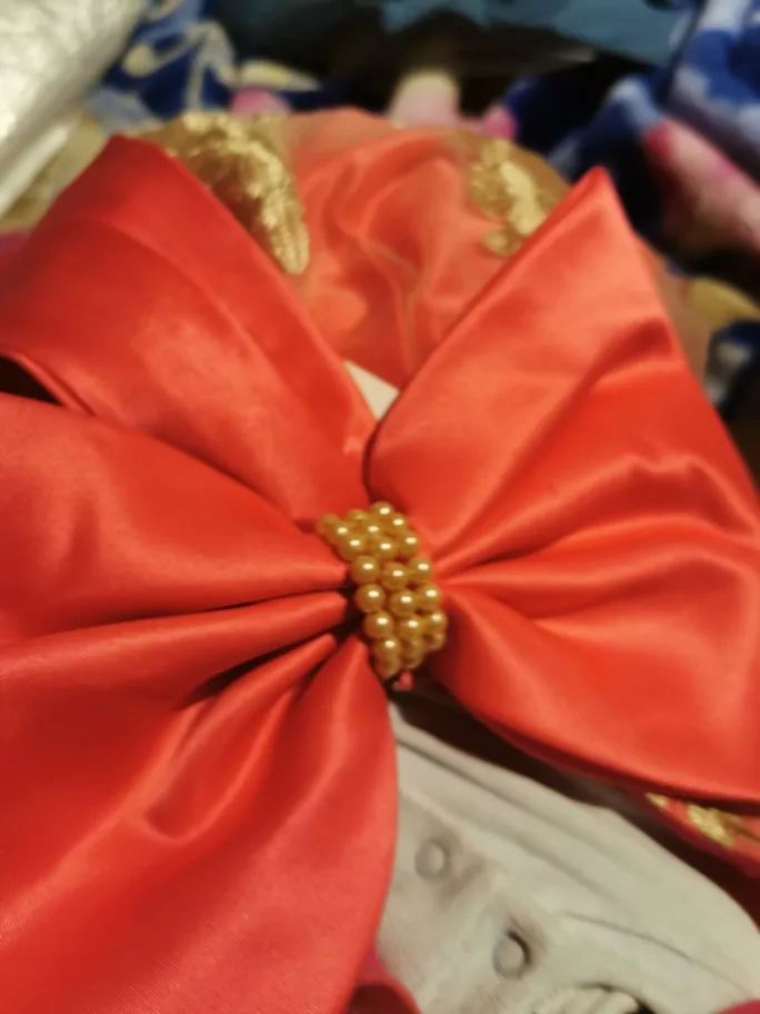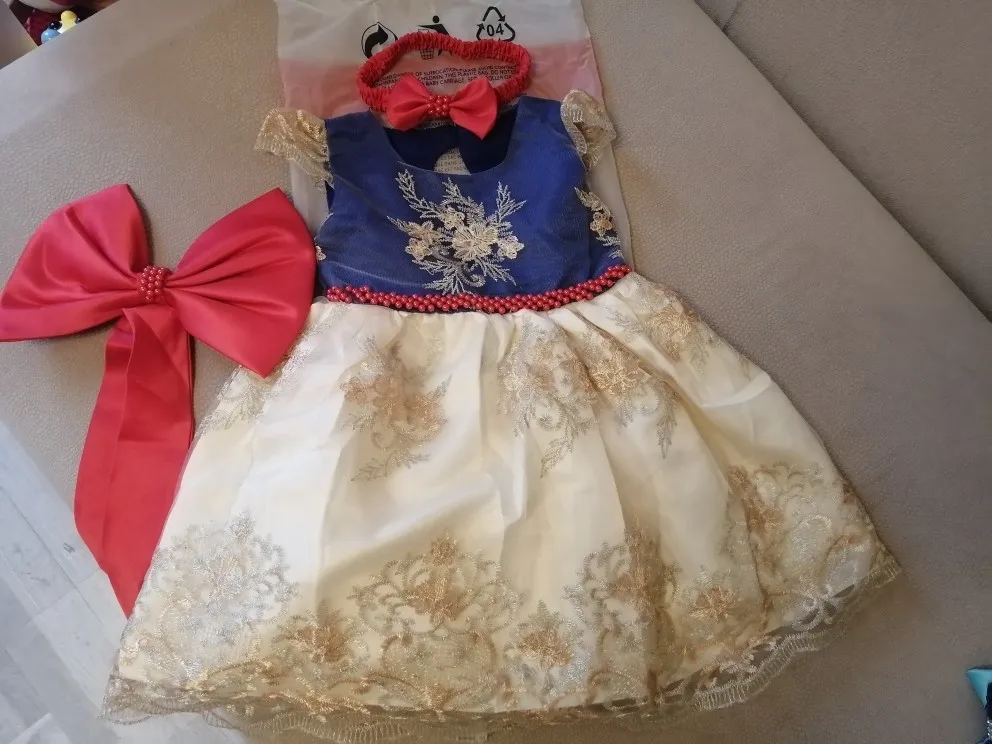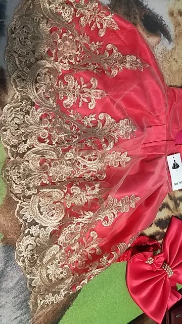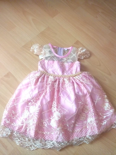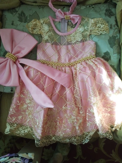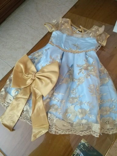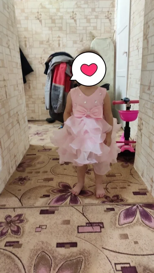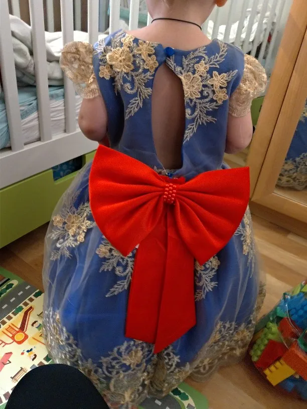 Очень красивое платье. Но бант был оторванный от булавки, найти специальный пистолет с клеем нет возможности, поэтому пришлось пришишать бант прям на платье. Так же по отзывам видно, что к платью идет резинка для головы, даже к тому размеру, что купила я, но продавец отказывается видеть тот факт, что мне не положили резинку. Не критично, но очень обидно... На платье имеется одна огромная затяжка, спереди, убрать невозможно. Спор открывать не стала, пусть будет у продавца на совести....