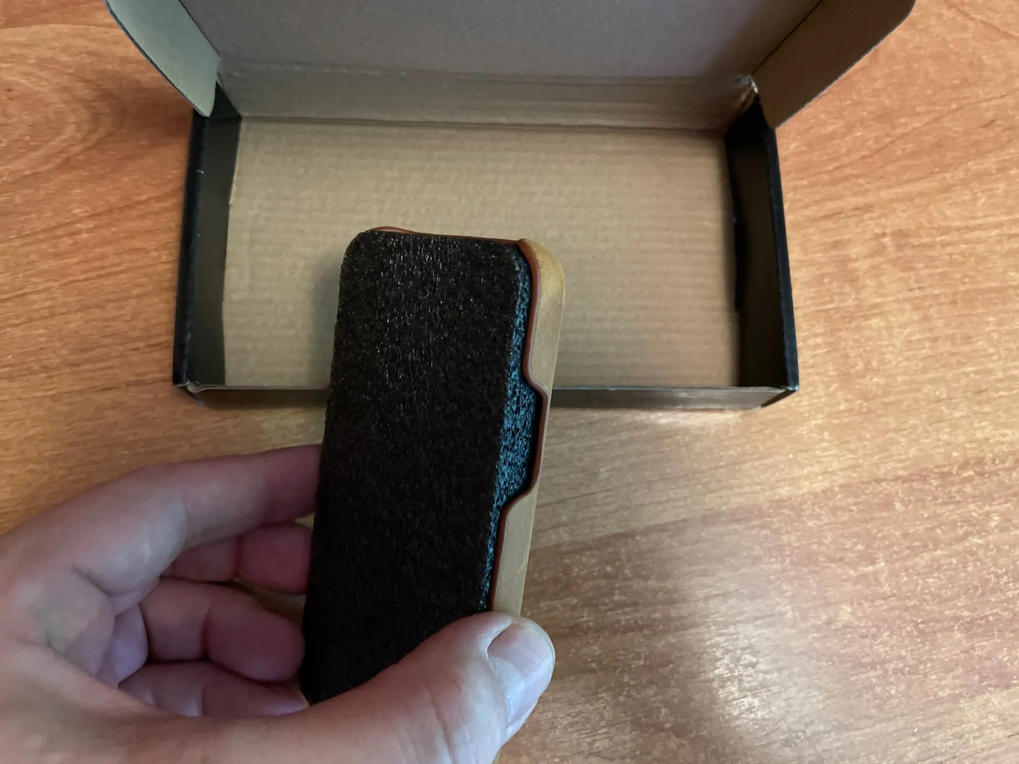 Чехол пришел в фирменной коробочке, слегка помятой, сам чехол еще и в пакетике. На чехле уже есть царапины. Помимо царапин есть мелкие производственные дефекты. Из натуральной, или искусственной кожи сделан чехол- не понять.Внутренний бархатный слой черный. На телефоне чехол сидит хорошо. Снимать и одевать легко.