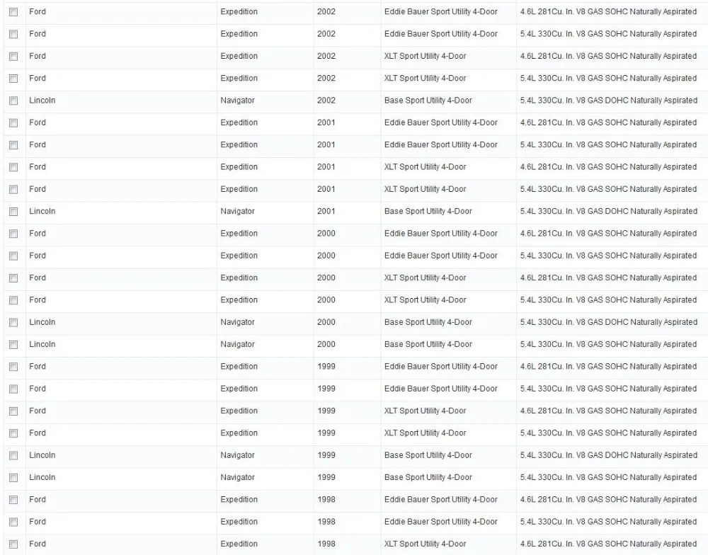 Модель модели года; Стиль корпуса двигателяFord Expedition Base 1997-2002 все двигатели Спортивная УтилитаFord Expedition Eddie Bauer 1997-2002 все двигатели Спортивная УтилитаFord Expedition XLT 1997-2002 все двигателя Спортивная УтилитаLincoln Navigator Base 1998-2002 все двигателя Спортивная Утилита