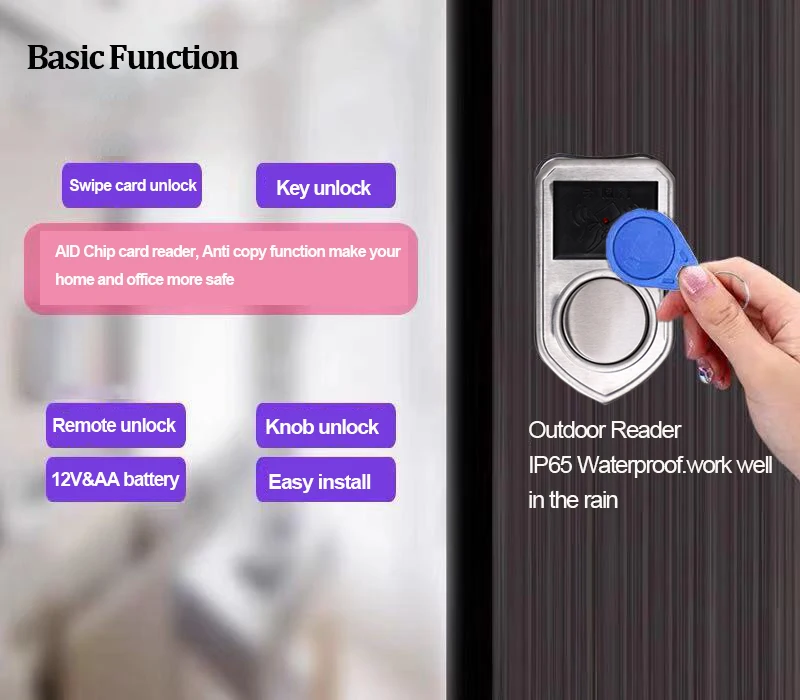 1. Встроенный Чип шифрования, защита от копирования, больше безопасности, чем у других чипов. 2. Поддержка 4 х АА батареи 12V, 4X AA батарея может открыть дверь для 30000 раз (примерно 1 год) 3. Поддержка дистанционного управления откройте дверь (дополнительная функция), расстояние дистанционного управления составляет 20 метров 4. Мастер-карта более легко управлять, добавлять и удалять карты. 5. Низкий нагрев батареи 6, может быть совместим со строительной системой системы охраны входа и т. Д. 7. Автоматически определяет состояние двери, автоматическая обработка, чтобы открыть дверь 8. Может быть установлен на левой двери, правой двери, внутренней двери, снаружи двери и других дверей 9. Диапазон рабочих температур-40 ℃-60 ℃ 10. Долгий срок службы (Более 500000), вкл/выкл, высокая чувствительность о вкл/выкл, низкое энергопотребление 11. Длина язычка замка> 20 мм, соответствует стандарту GA/T73-94 5.1.6B.