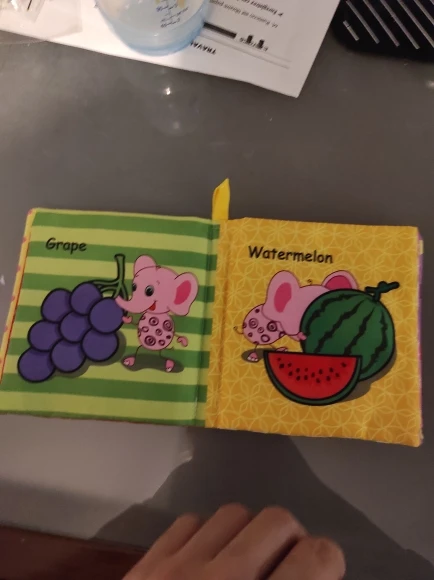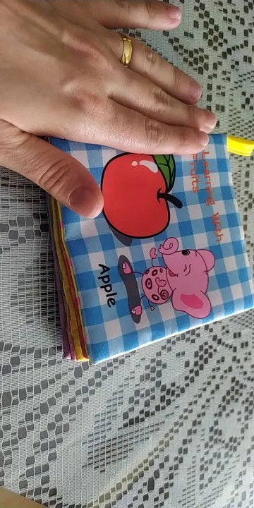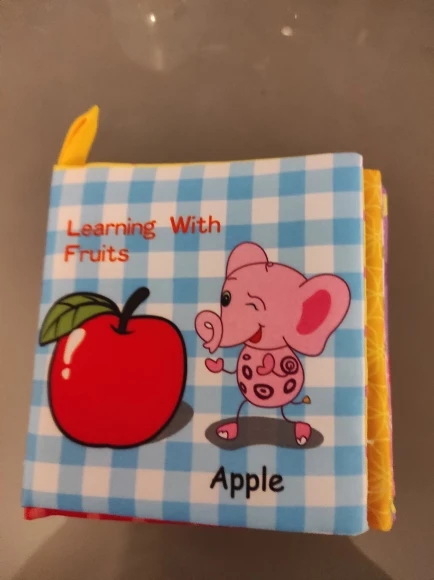 Доставка в Украину меньше 2 недель новой почтой при выборе бесплатного способа доставки. Ткань типа подкладочной, стирать или очень аккуратно, или ополаскивать под проточной водой, все страницы шуршат, ещё вшита пищалка. Овощи и фрукты нарисованы ярко, крупно, понятно.