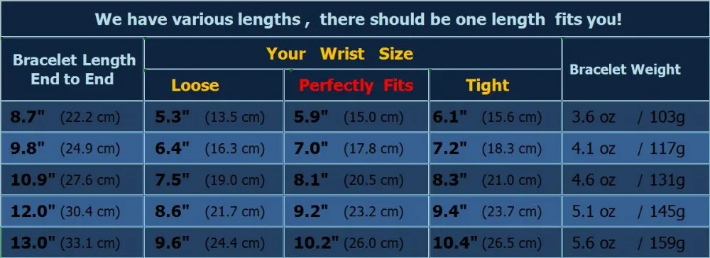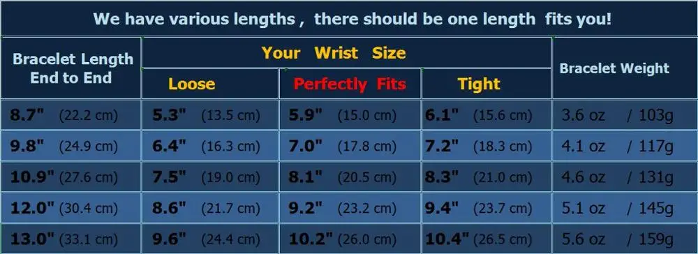 Как выбрать правильный размер?1:Измерьте размер запястья.(Пожалуйста, посмотрите на последнюю картинку, которая показывает, как измерить ваше запястье)2:Пожалуйста, посмотрите на таблицу размеров ниже и убедитесь, что ваш размер близок к"Идеально подходит" размер запястья, тогда вы будете знать, какая длина браслета подходит для вас(Если вам нравится браслет более свободный, пожалуйста, убедитесь, что размер запястья близок к размеру свободного кроя)