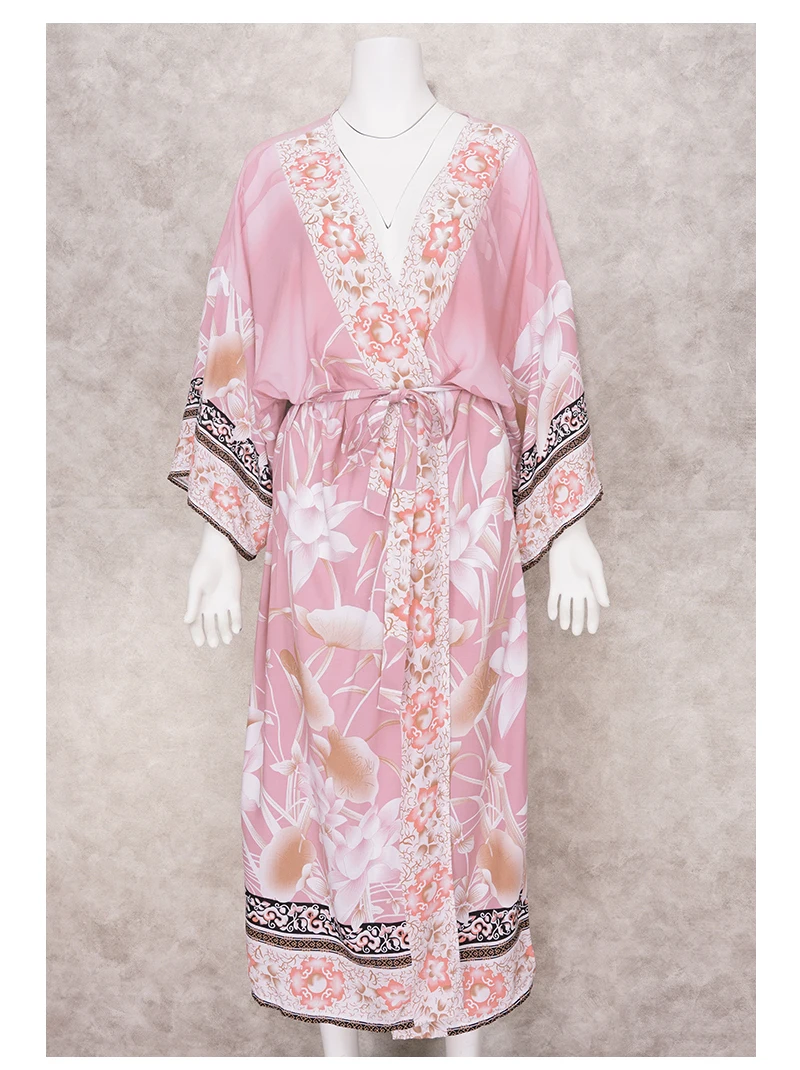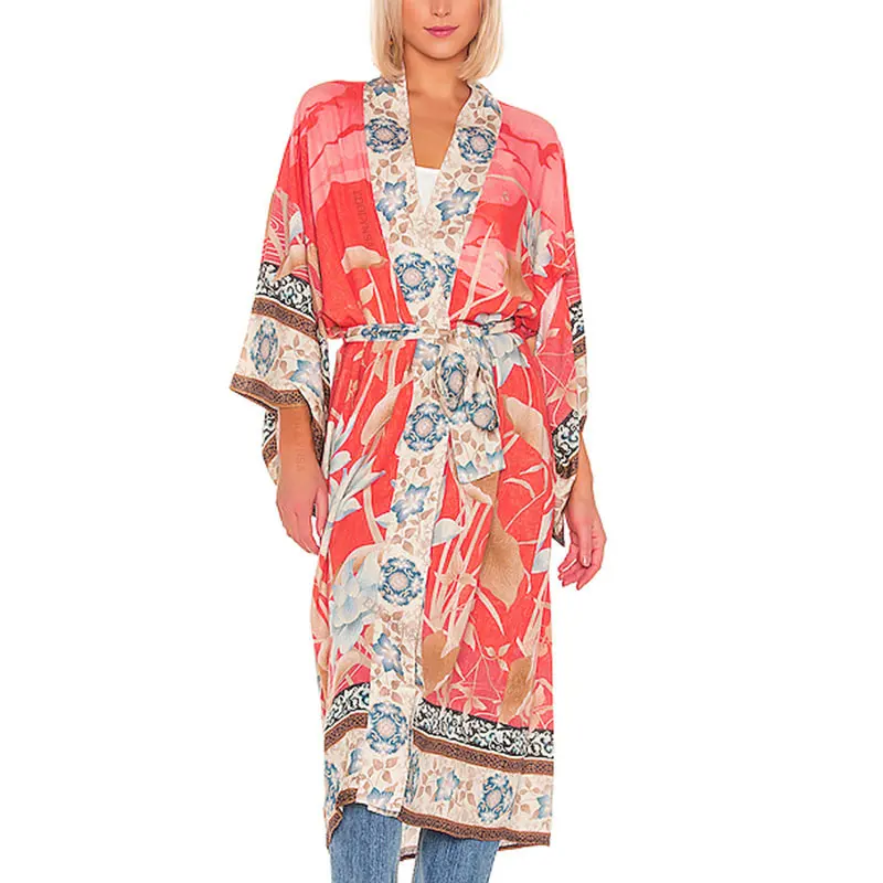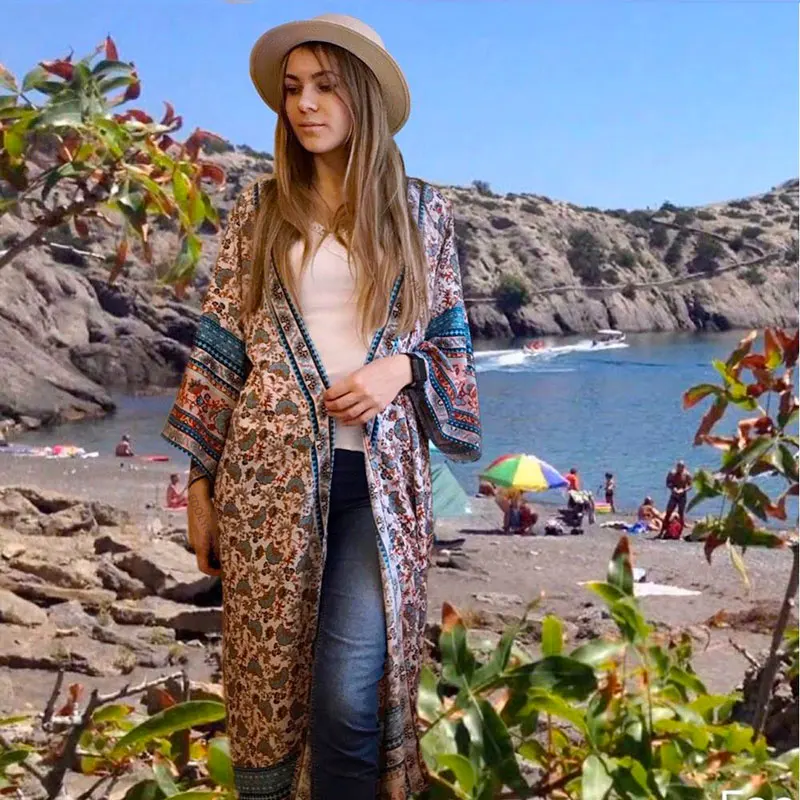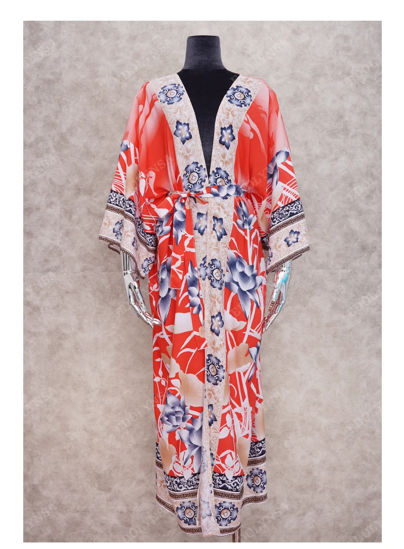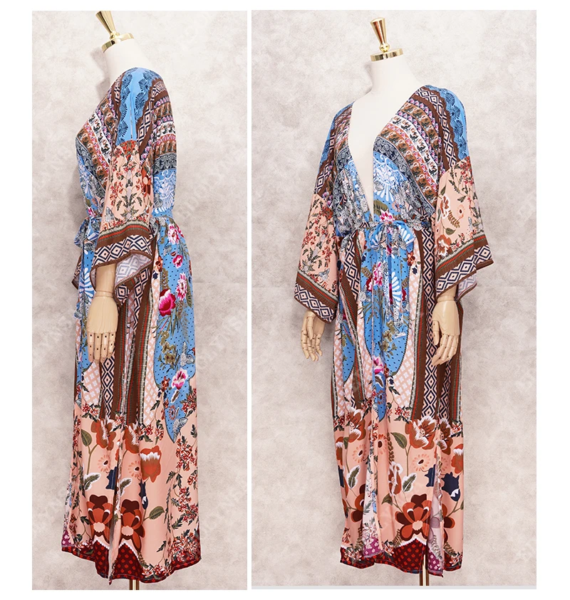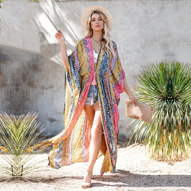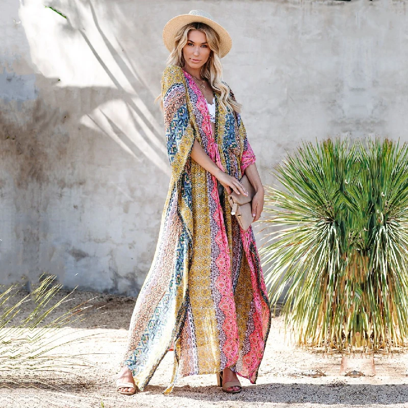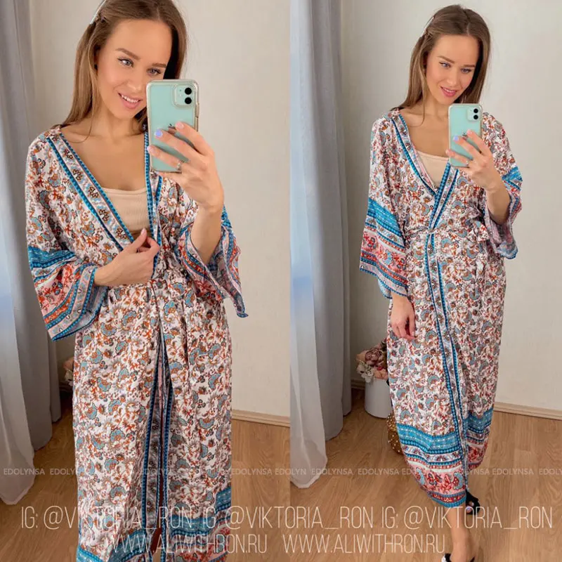 Женское длинное пляжное кимоно с богемным принтом и поясом