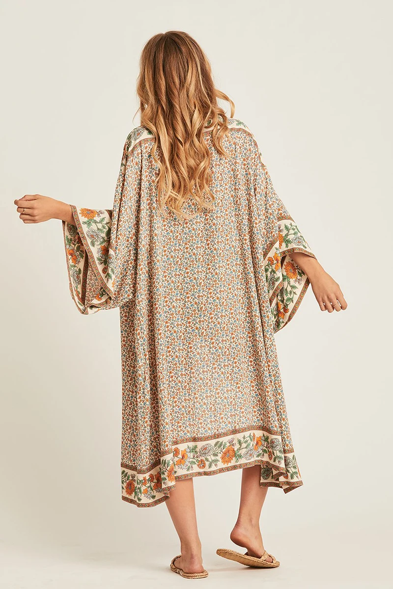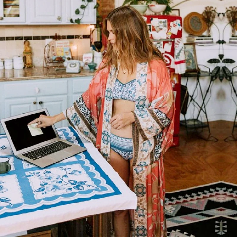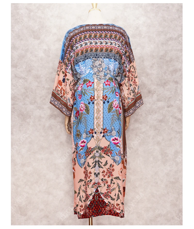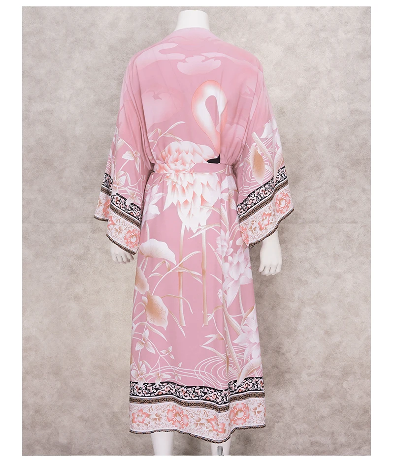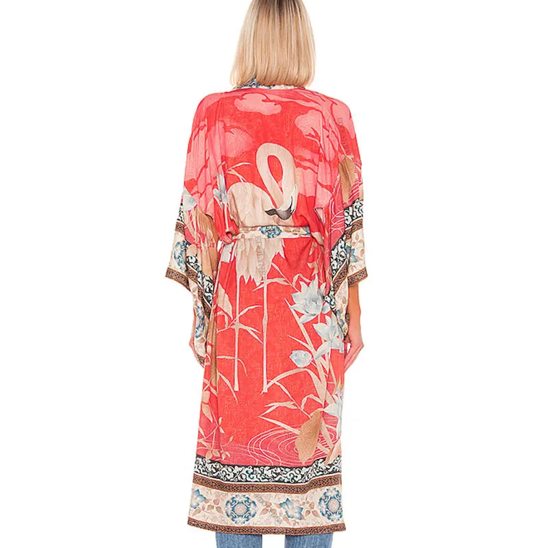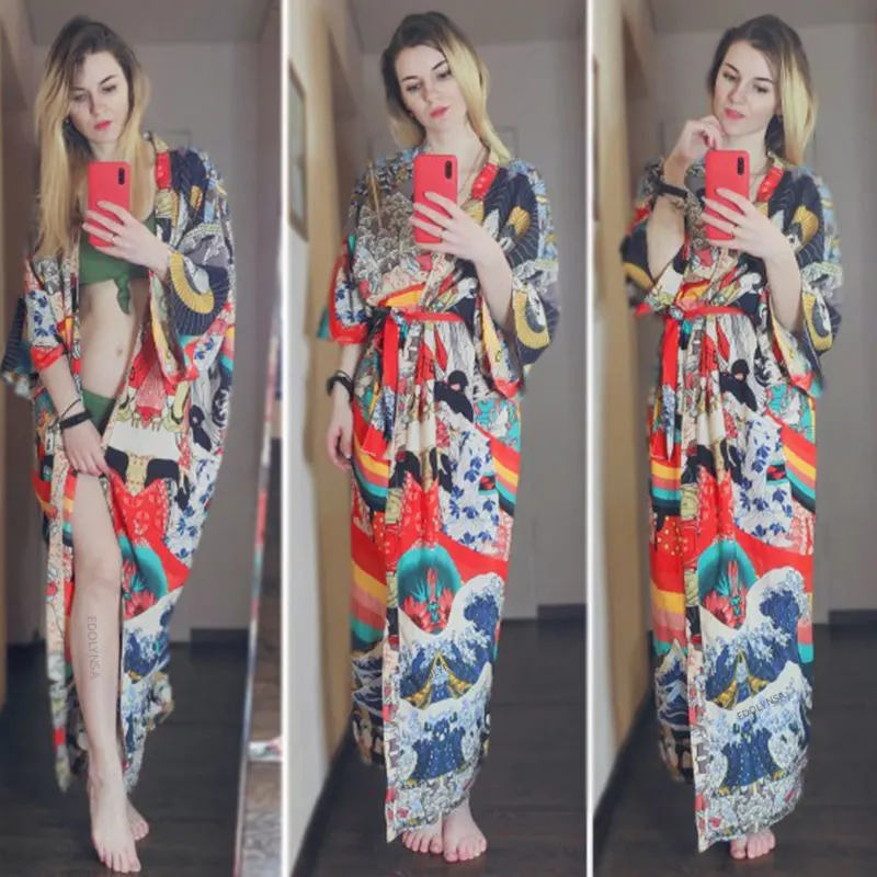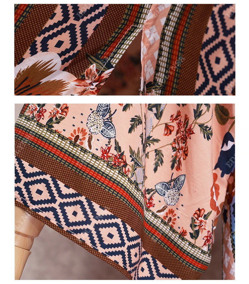 Женское длинное пляжное кимоно с богемным принтом и поясом