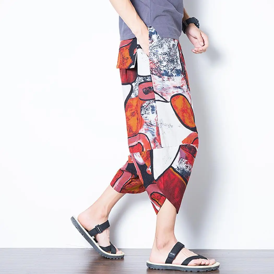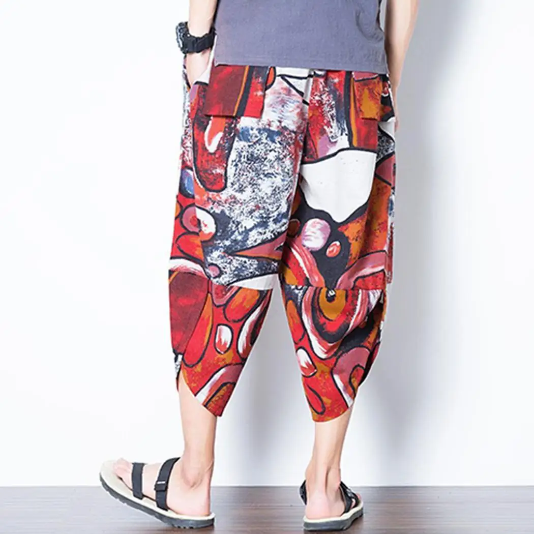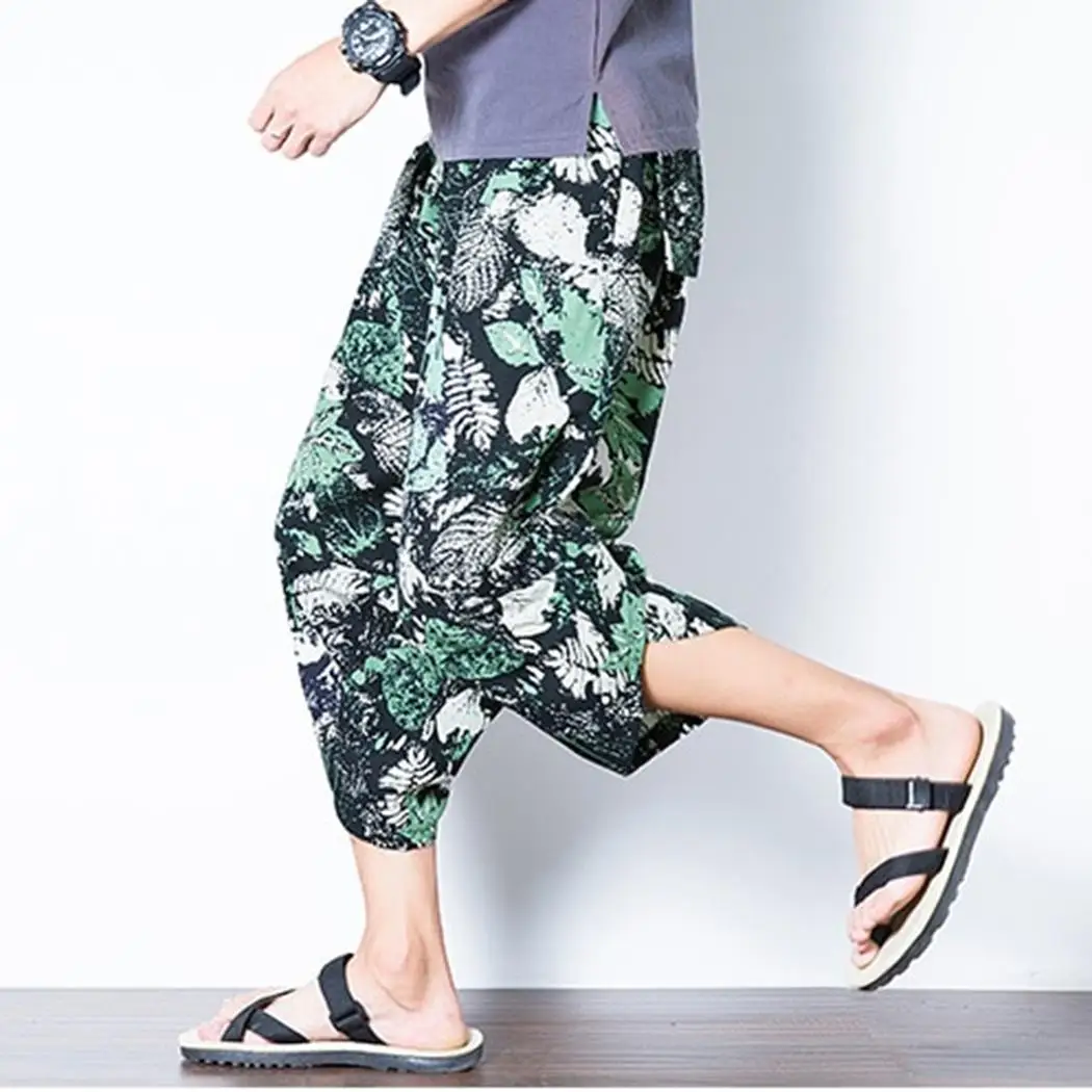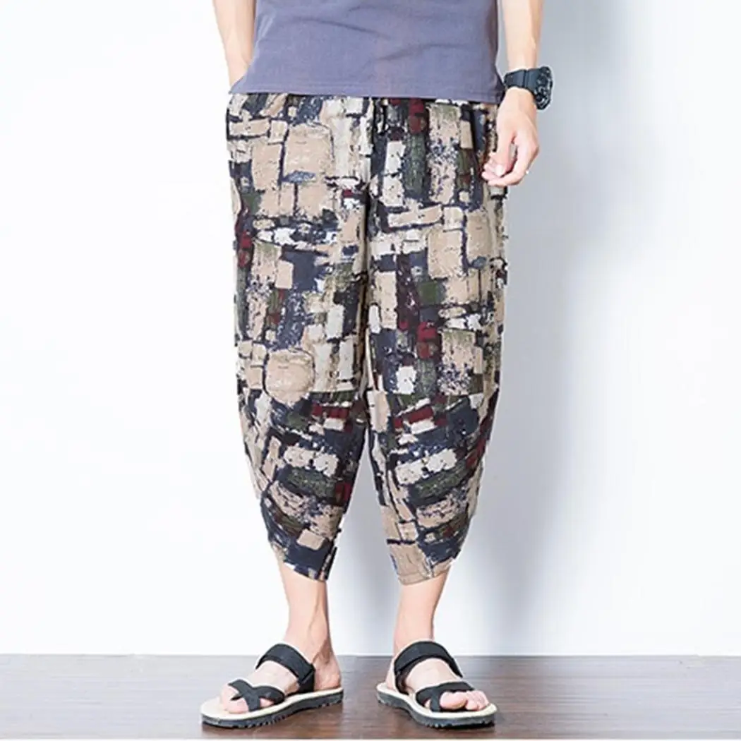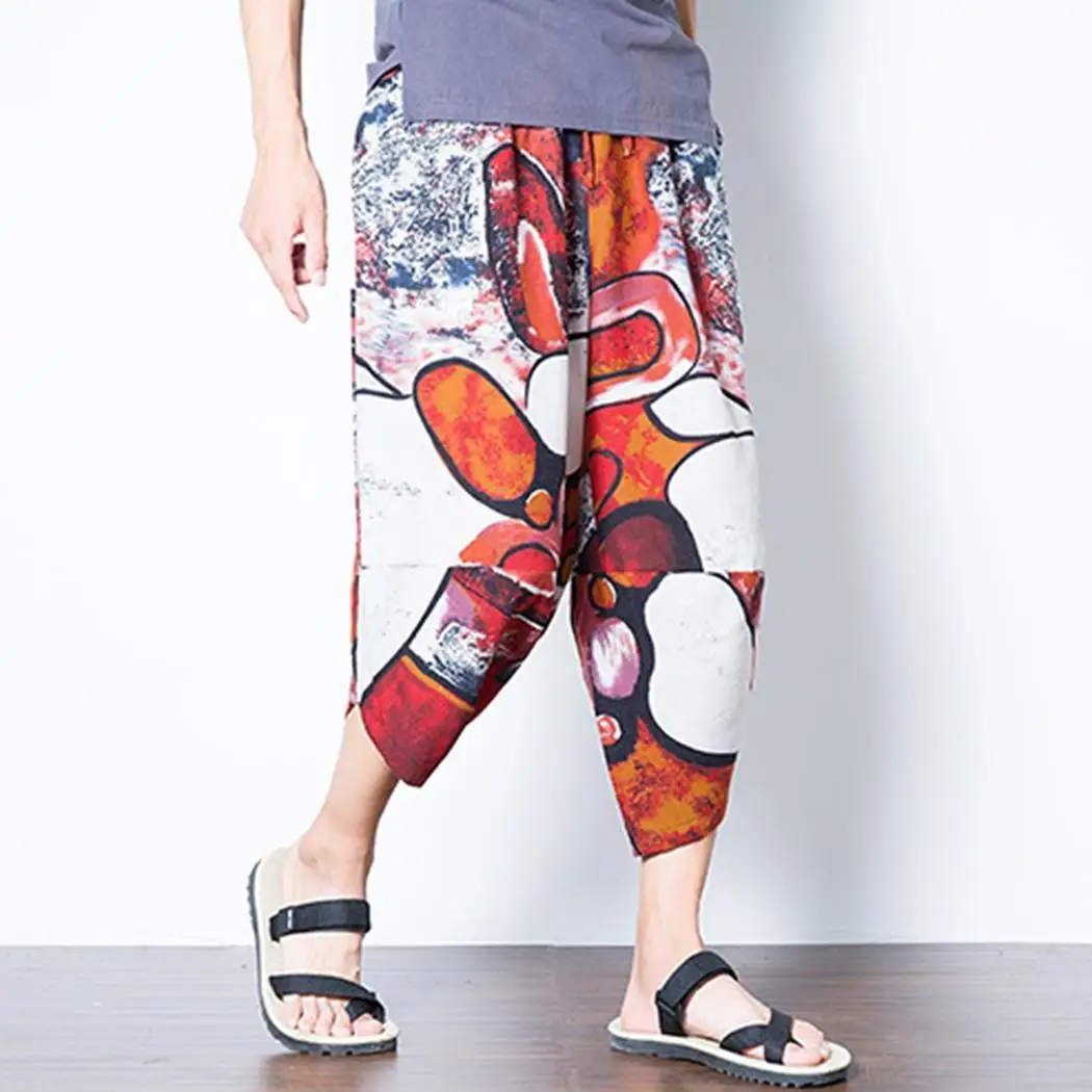 Мужские повседневные Цветочные со средней талией свободные пляжные, длиной до икры хлопковые регулируемые на завязках льняные шаровары