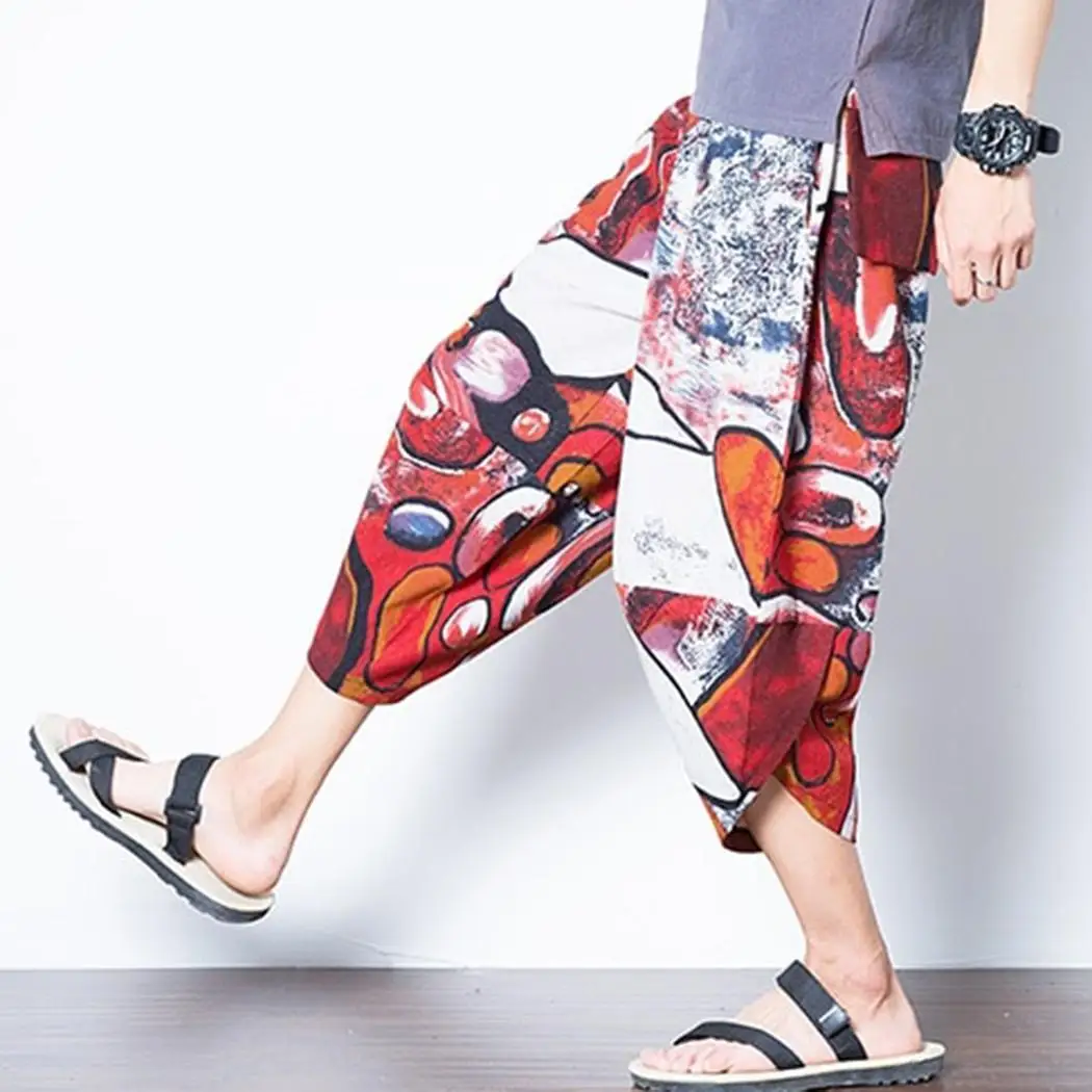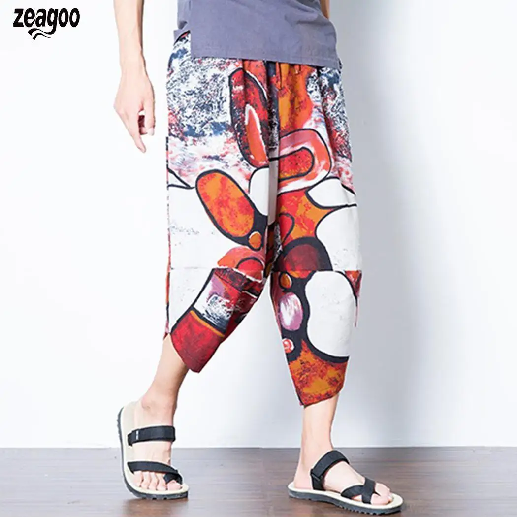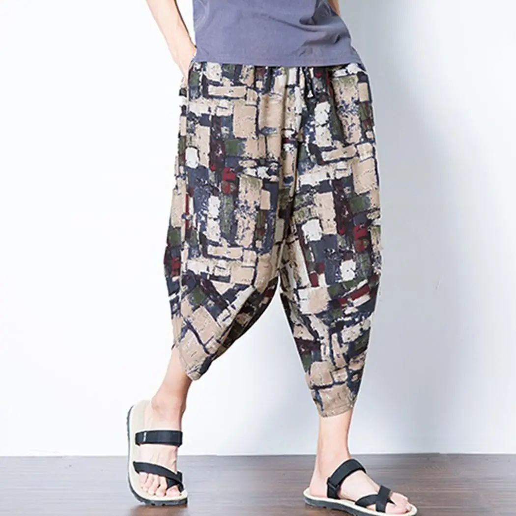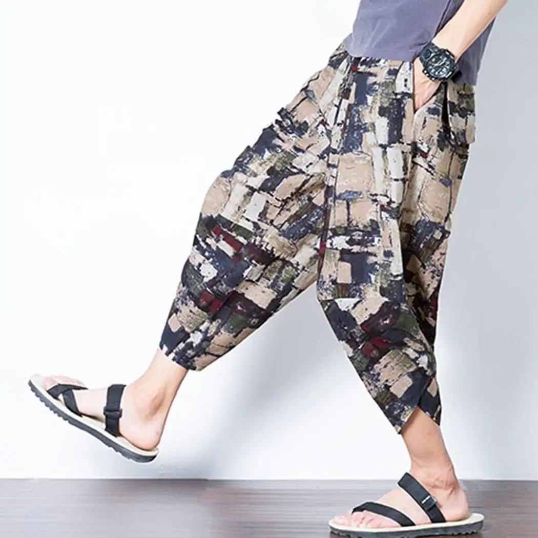 Мужские повседневные Цветочные со средней талией свободные пляжные, длиной до икры хлопковые регулируемые на завязках льняные шаровары