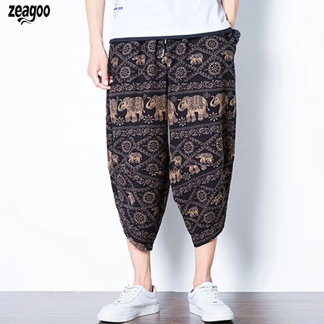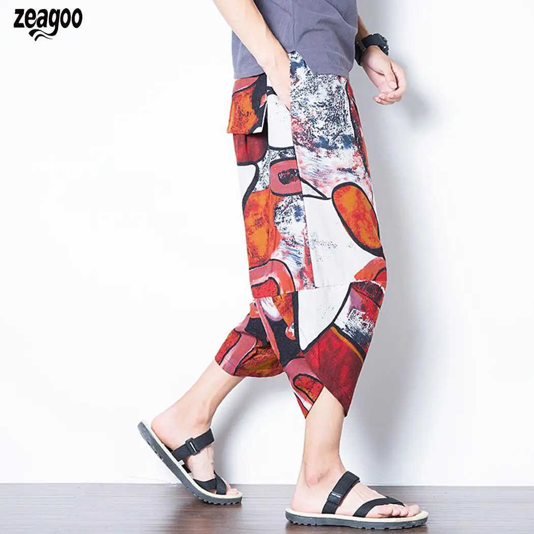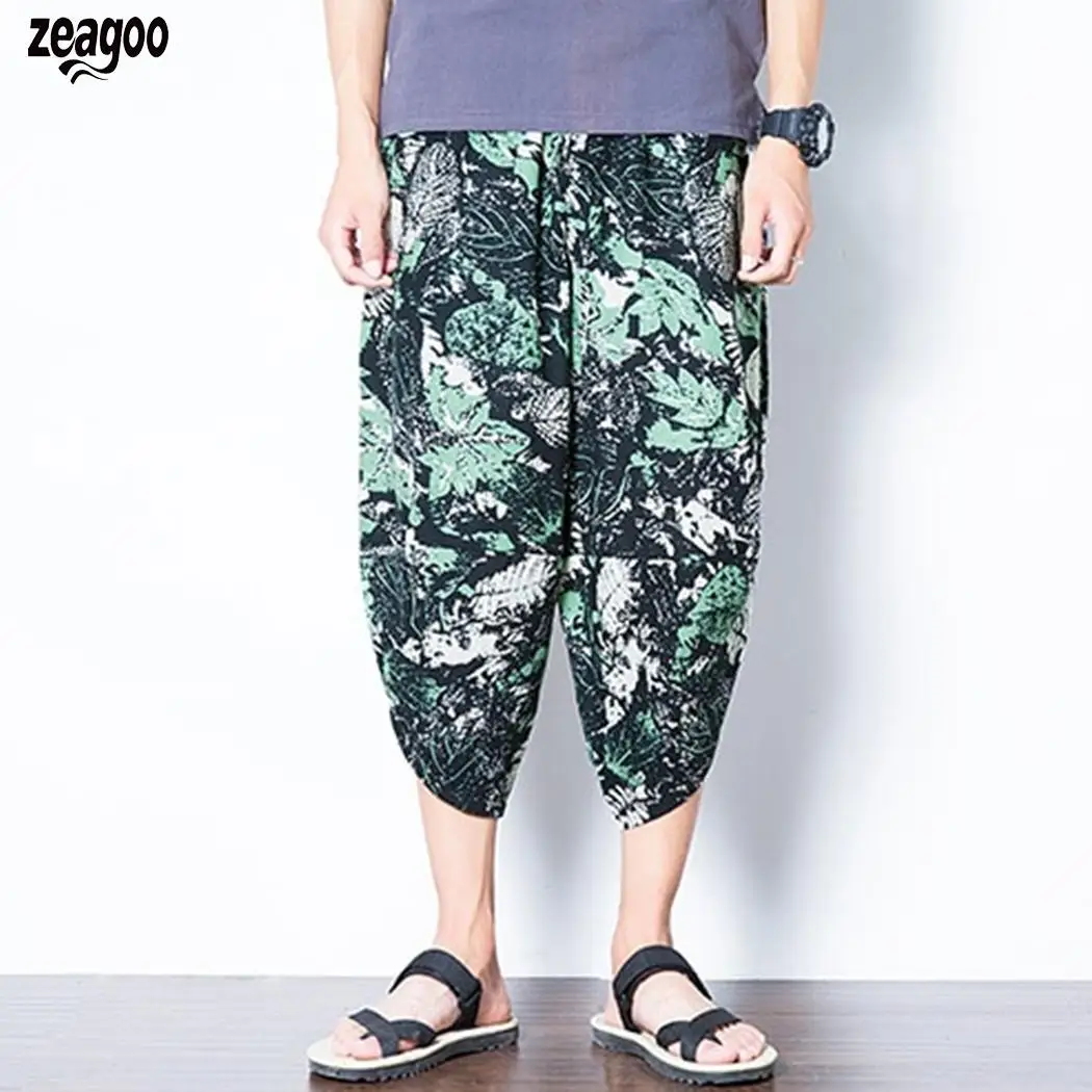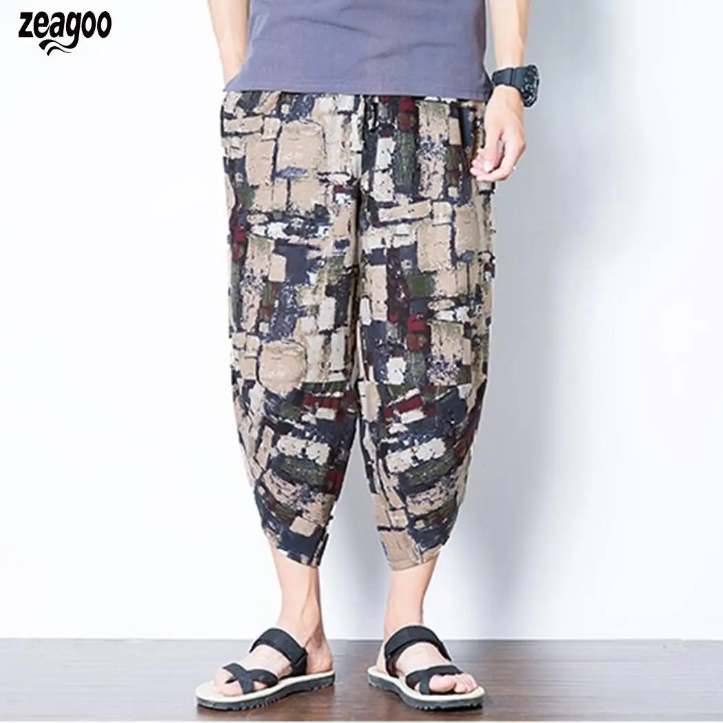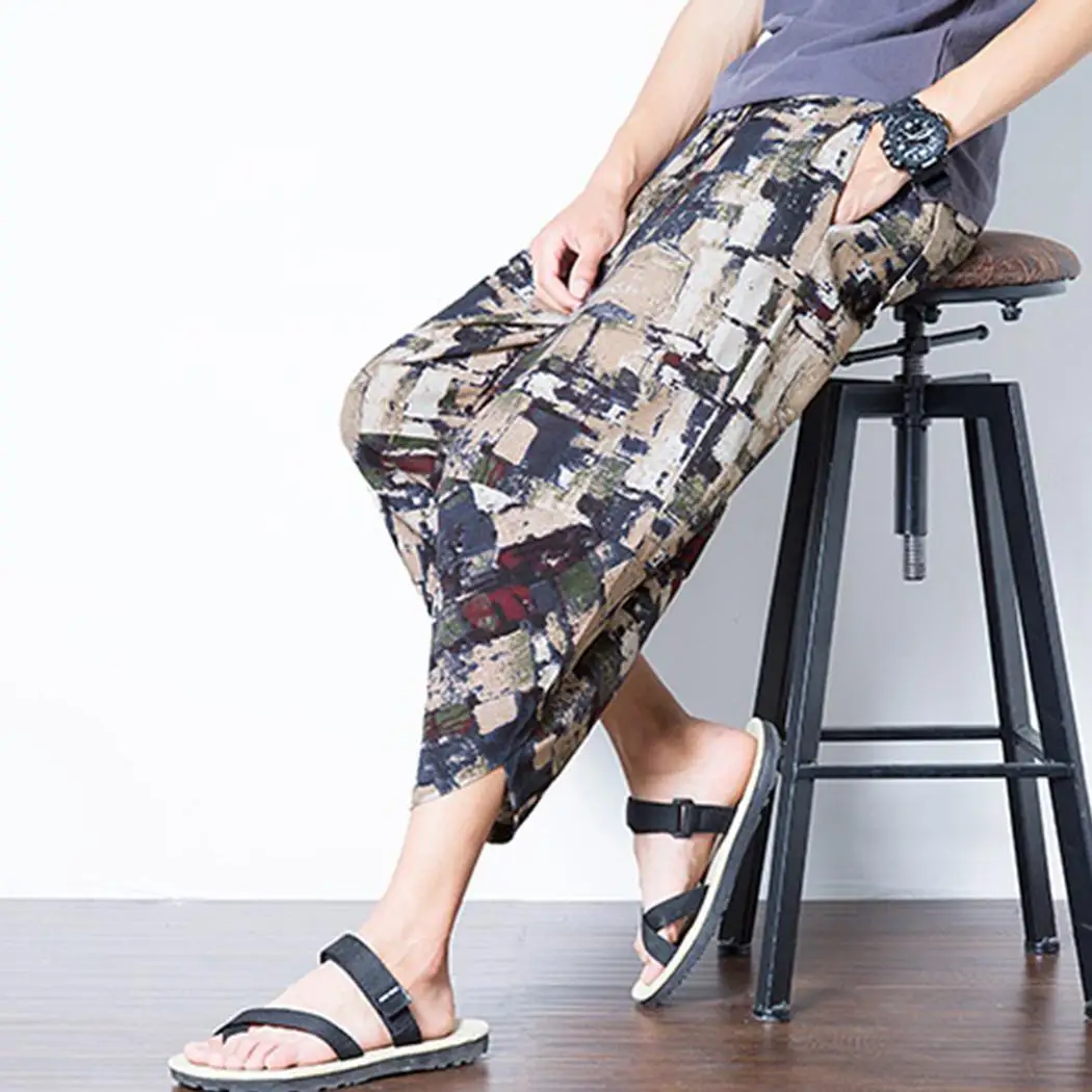 Мужские повседневные Цветочные со средней талией свободные пляжные, длиной до икры хлопковые регулируемые на завязках льняные шаровары