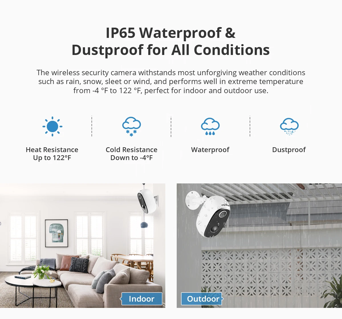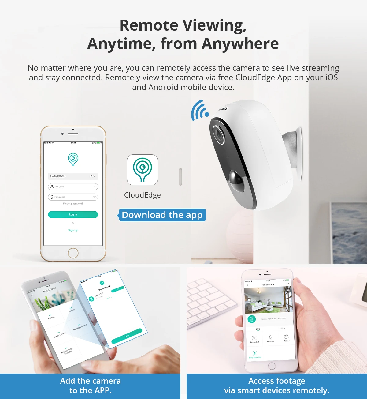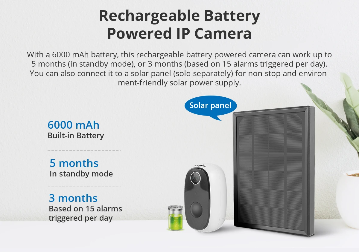 Камера домашней безопасности-это 100% беспроводная камера наблюдения, разработанная с перезаряжаемой батареей и подключением по Wi-Fi. Мощный аккумулятор обеспечивает время ожидания до 5 месяцев. Кроме того, вы можете подключить его к солнечной панели для непрерывного источника солнечного питания. Встроенный ИК-датчик может точно обнаруживать и идентифицировать человека и животных, уменьшая количество ложных оповещений. Получите удаленный или локальный доступ к камере через приложение CloudEdge, вы можете наслаждаться просмотром в реальном времени и воспроизведением на телефоне или планшете. Защитите свой дом и бизнес, когда и где угодно.