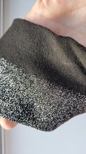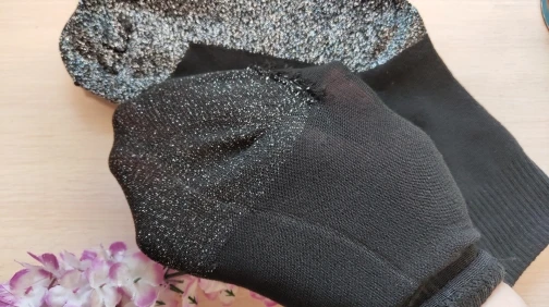 тонкие носки с люрексом на подошве. термо эффекта не заметили. муж такие носить не будет, забрала себе, прекрасно сели и на женскую ногу