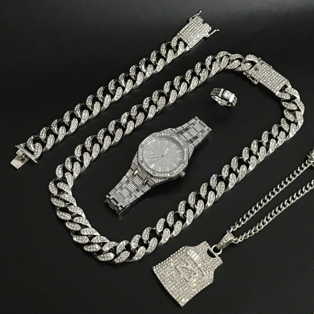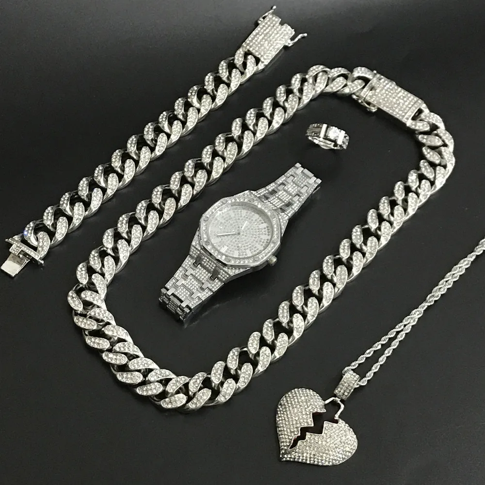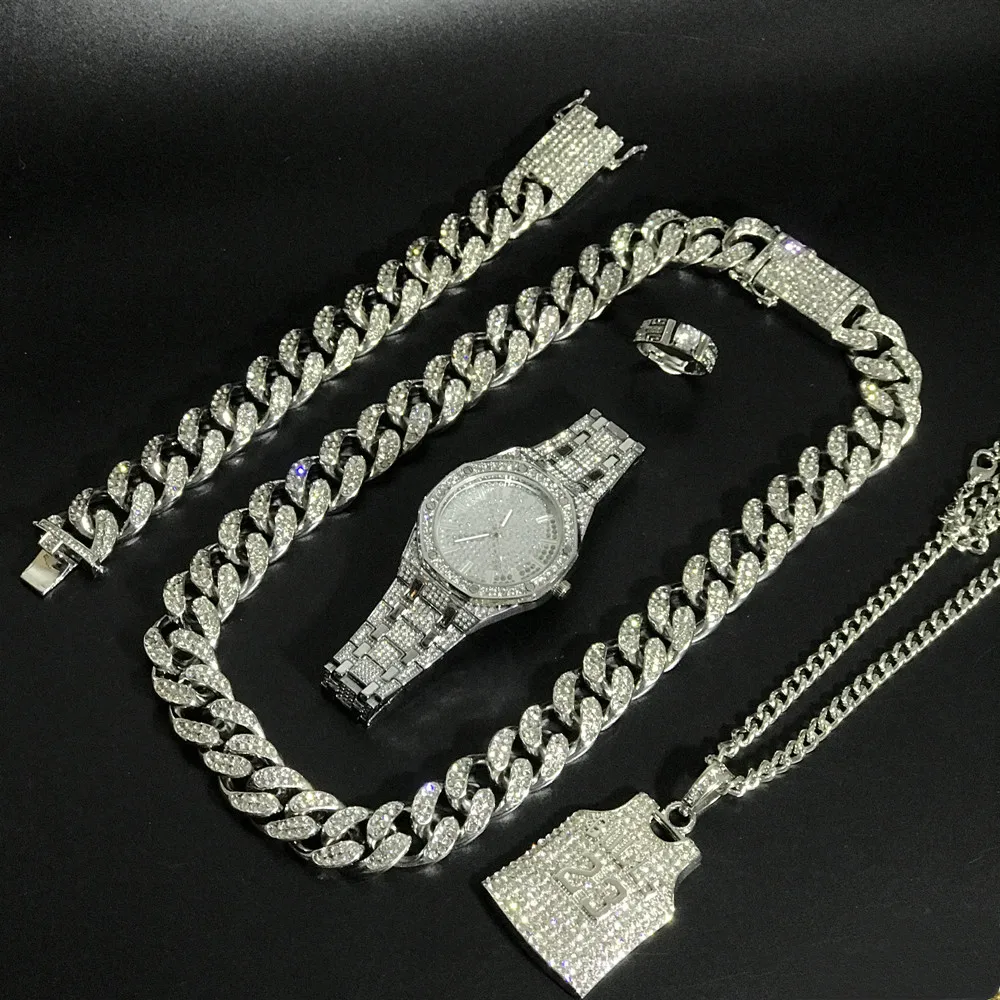 Роскошные мужские часы серебристого цвета, ожерелье и кольцо, Набор комбинированных часов в стиле хип-хоп с кристаллами Miami Ice Out, кубинское ювелирное изделие для мужчин