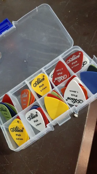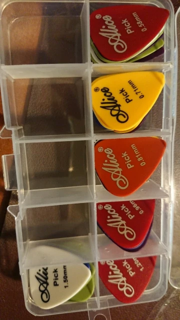 отличные медиаторы.толщина идёт от 0.58мм до 1.5мм медиаторы очень хорошо сидят в руке и достаточно прочные.за свою цену одни из самых лучших медиаторов.