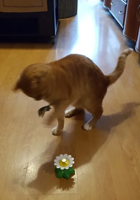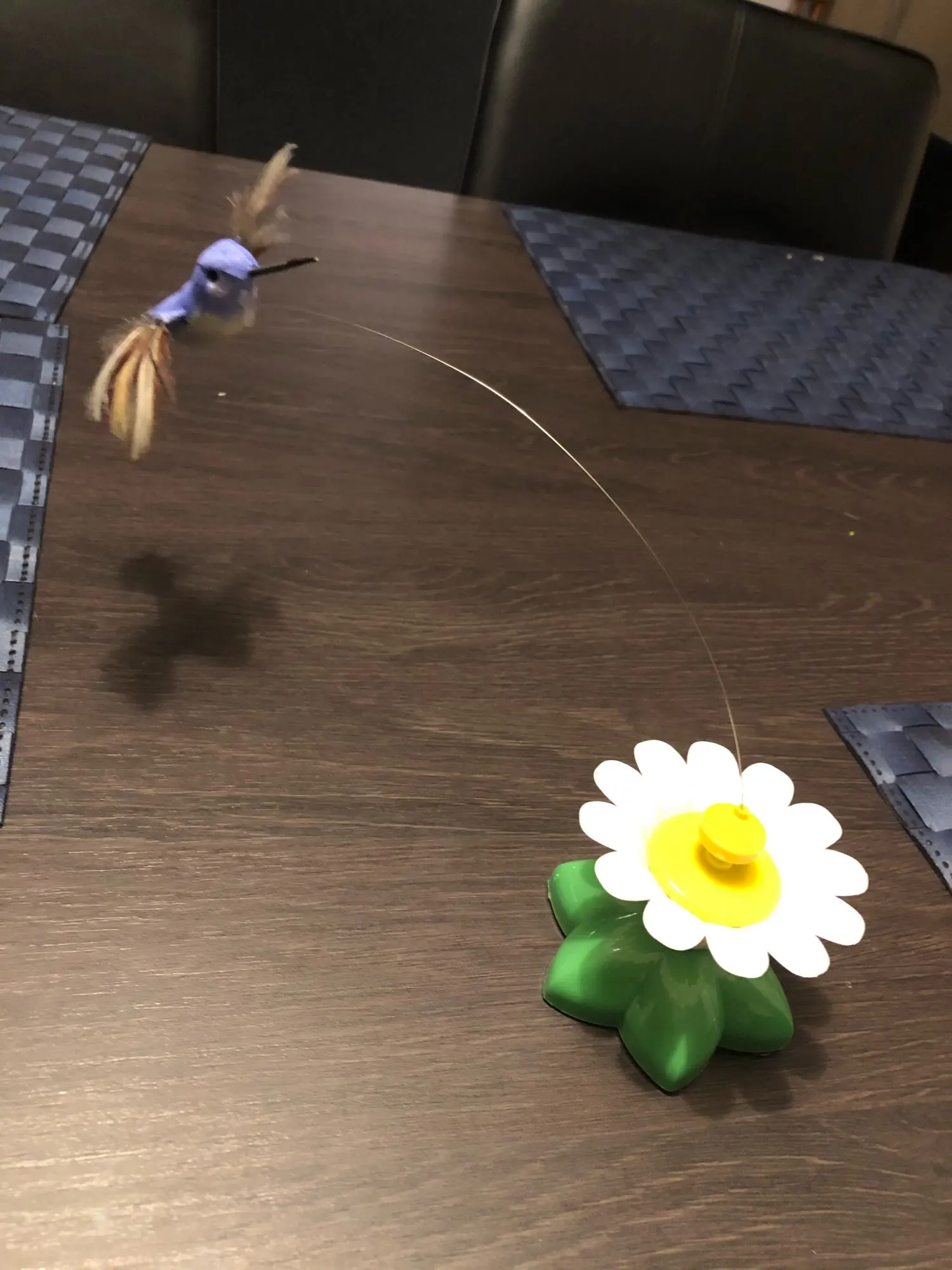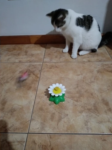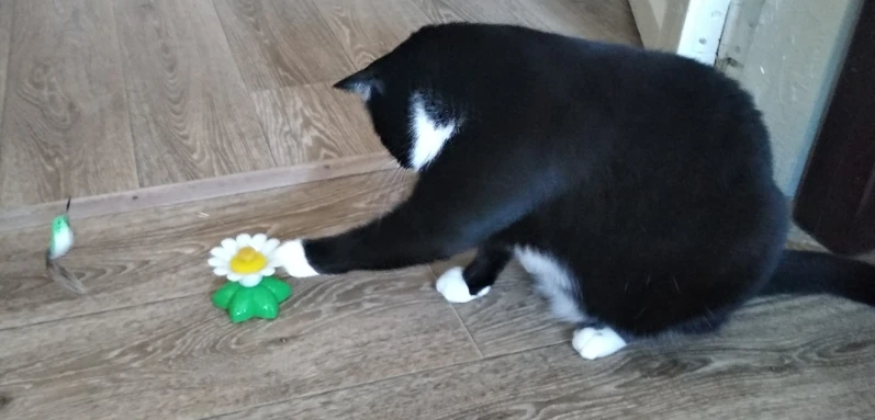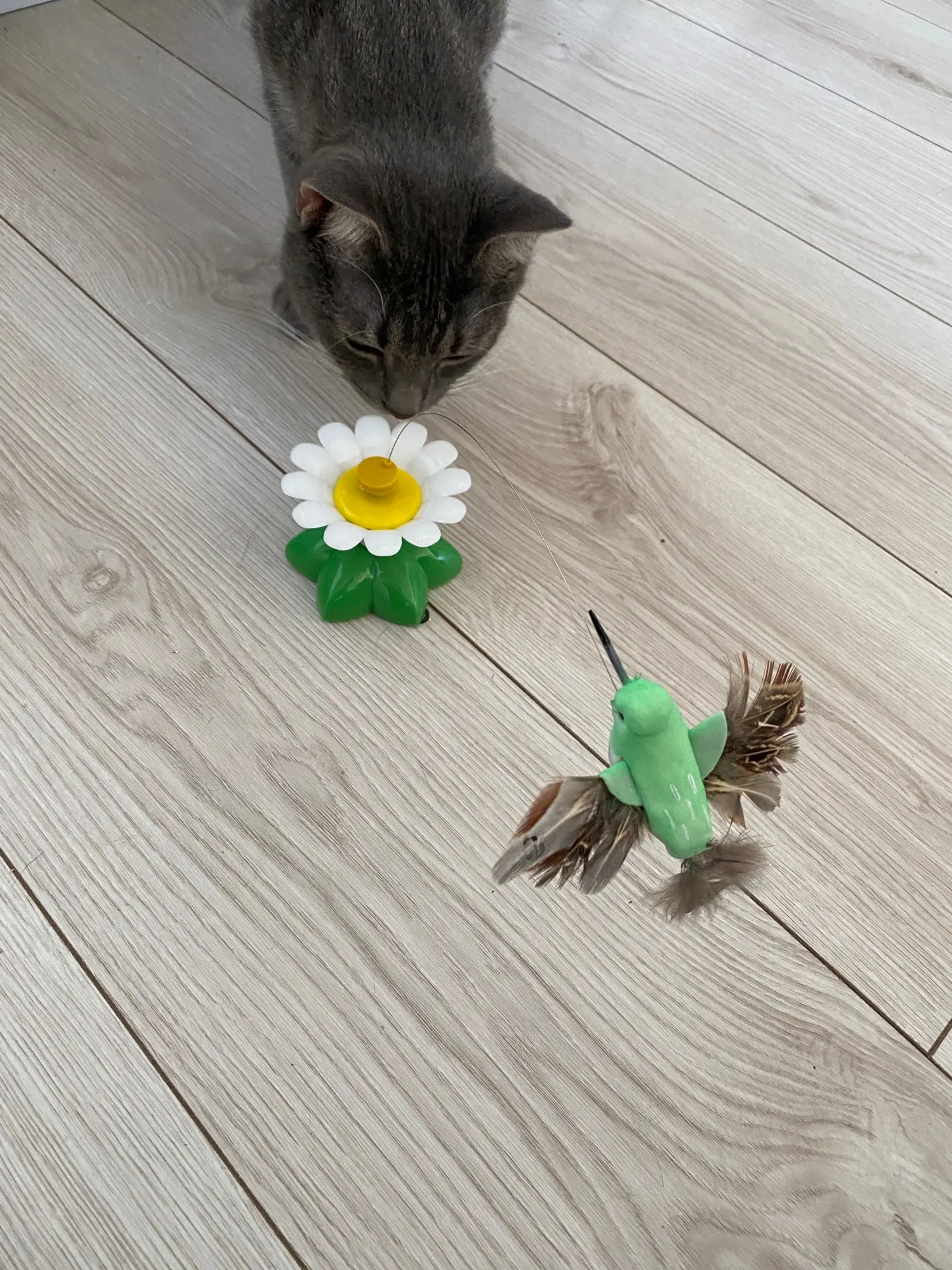 The toy was very interesting for the cat. The bird vibrates. When a cat pushes him, it "flies" around the flower. If your cat likes to bite it is a disposable toy, the hummingbird is made of polystyrene and it loses feathers quickly. It would be useful to have a sucker on the floor, because when a cat catches a bird, it turns over the flower.
