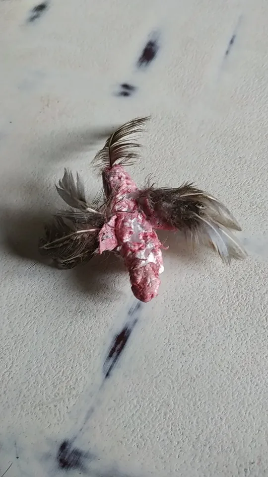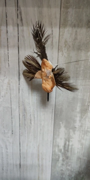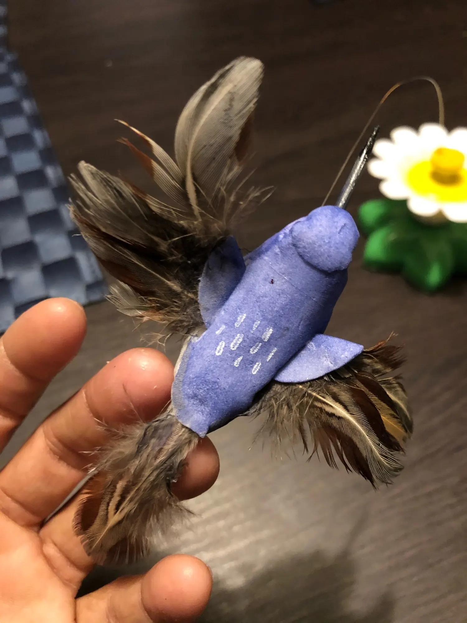 Миниатюрная птичка, очень привлекает . Хорошо сделано, но коты быстро с ней расправились. Было интересно, для разнообразия. Птичку легко починить или сделать другую приманку чтобы котикам поохотиться.