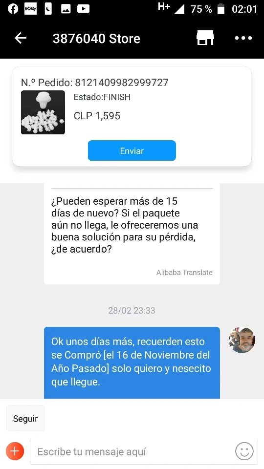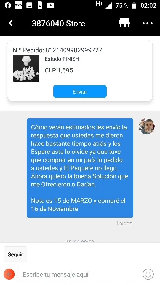 Плохая покупка 4 месяца и товар так и не пришел, я дал продавцу больше времени, чем обычно, так как я обычно просил его подождать больше дней, когда срок защиты истек во второй раз, он подтвердил, что если он не прибудет через 15 дней, я открою спор. Посылка не прибыла, я открыл спор, и продавец попросил меня в пользу, и я не возвращаю деньги _ я потерял время, деньги и покупку. Я не рекомендую не встретить