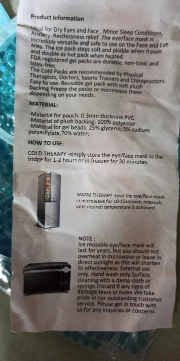 Холодное использование:Пожалуйста, положите маску на глаза в холодильник на 10-30 минут, затем вы можете носить маску на глаза около 5 ~ 10 минут.