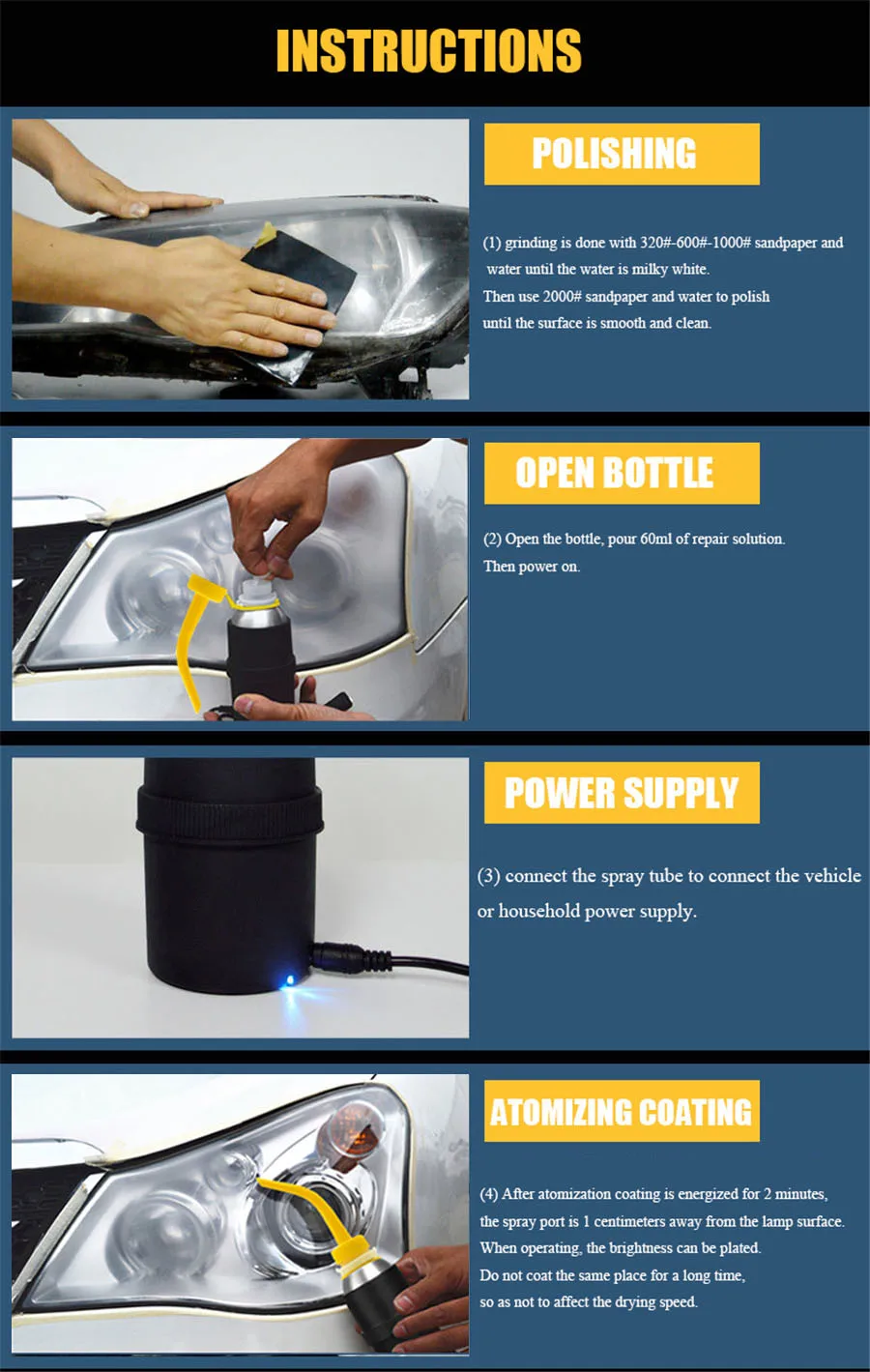 Новинка 2020, набор для ремонта автомобильных фар от царапин и пожелтенияРемонт таких дефектов, как царапины, царапины, пожелтение, старение, размытие, растрескивание и т. д. на пластиковых фарахОписание действий(1) измельчение производится с помощью наждачной бумаги 320 #-600 #-1000 # и воды до тех пор, пока вода не станет молочно-белой. Затем используйте наждачную бумагу 2000 # и воду для полировки до тех пор, пока поверхность не станет гладкой и чистой.(2) Откройте бутылку, откройте крышку бутылки, откройте уплотнительное кольцо (необходимо открыть уплотнительное кольцо, которое можно подключить к источнику питания, иначе нагрев раствора покрытия в баке будет иметь риск выброса)Примечание: Из-за жидкости в заводской бутылке, таможня не может пройти, поэтому жидкость выливается перед доставкой, мы не заряжаем жидкость, не повторное использование, 100% новый.(3) Подключите распылительную трубку для подключения автомобиля или бытового источника питания.4. После распыления покрытие заряжается энергией в течение 2 минут, порт распыления находится в 1 сантиметрах от поверхности лампы.При эксплуатации яркость может быть покрыта.Не покрывайте одно и то же место в течение длительного времени, чтобы не повлиять на скорость высыхания.Этапы работы1. Он должен быть полностью отшлифован от оригинального покрытия на поверхности лампы, а не отшлифован полностью на поверхности лампы нельзя покрывать. 2. Необходимо открыть уплотнительное кольцо резервуара для подключения блока питания. В противном случае нагревающаяся жидкость будет нагреваться.3. При эксплуатации бак нельзя наклонять до более чем 75 градусов. И предотвращают падение тумана.4. Когда температура окружающей среды ниже 20 ~ C, нагрев лампы до 50 ~ C лампой для выпечки или феном, или нагрев лампы в течение 10 минут до покрытия5. Когда раствор покрытия израсходован, отключите источник питания, когда индикатор питания мигает.6. Для хорошей вентиляции надевайте защитную маску для очков. Если пленка попала в глаза, сразу краску большим количеством воды. Если вы случайно вдохнули паром, быстро Перемещайтесь на свежий воздух и держите дыхательные пути открытыми.Емкость: 200 млНоминальное напряжение: 110- 220 ВПосылка1 × распыленная чашка (белая или желтая новая Форсунка в случайном порядке)4 шт. наждачной бумаги1x лентаПримечание: Этот посылка жидкостей без, необходимо приобрести.