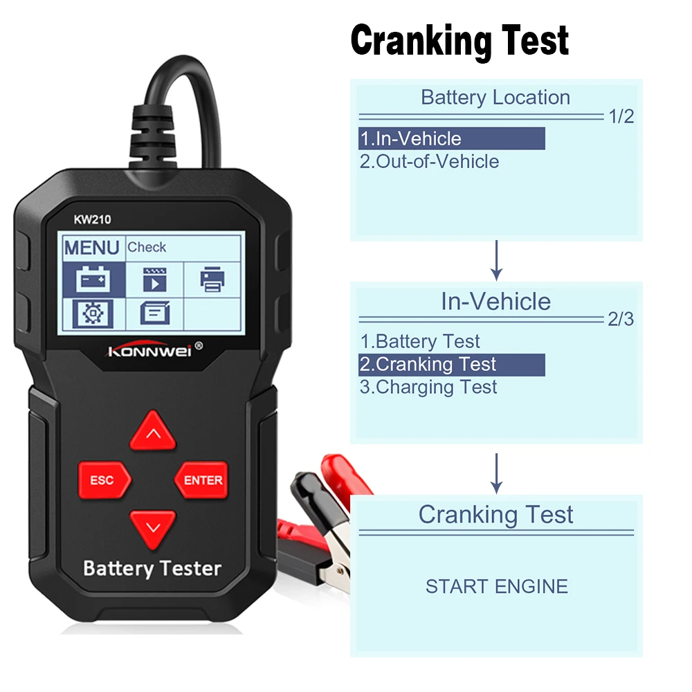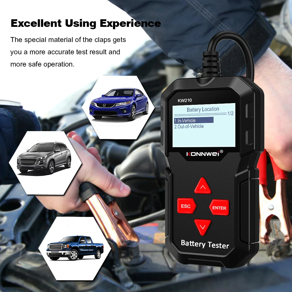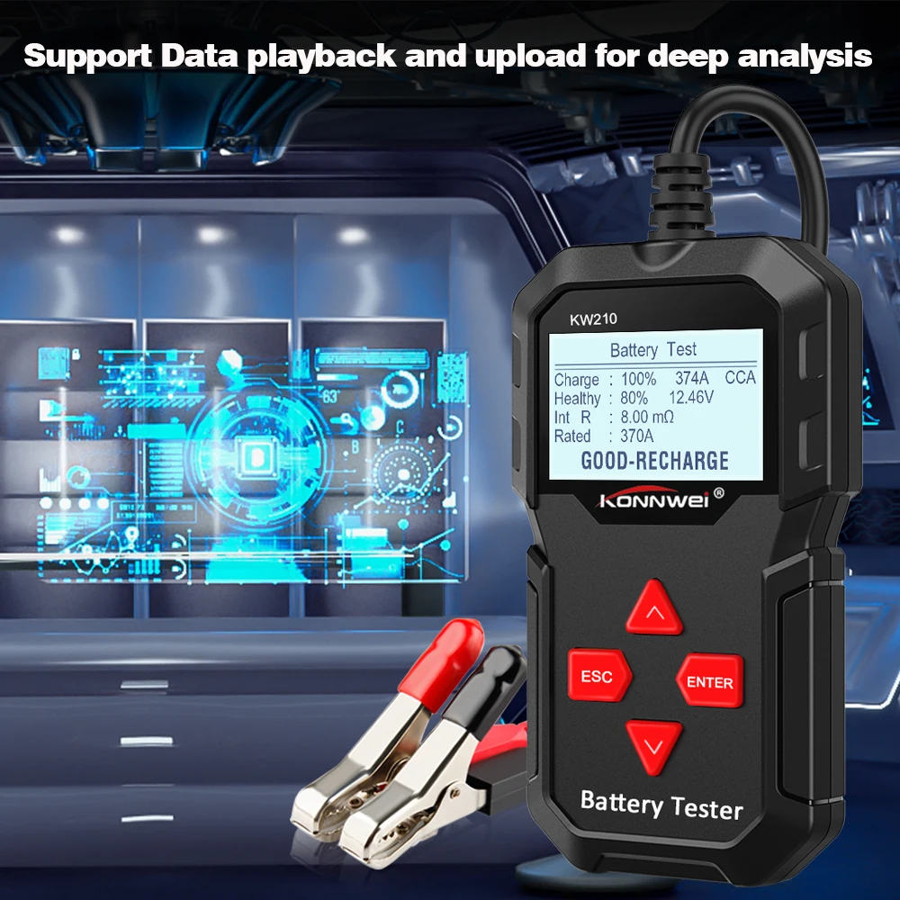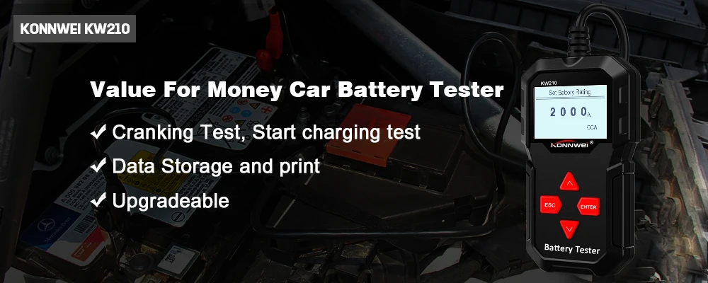 KONNWEI KW210-это обновленный на рынке классический тестер с подсветкой новый аккумулятор, который позволяет быстро и точно Проверять работоспособность аккумулятора, а также проверять рабочее состояние генератора. Это профессиональный инструмент диагностики транспортных средств для проверки неполадок аккумуляторной системы с помощью графического инструмента мониторинга напряжения, с его цветным экраном и уникальным рисунком, бесплатным обновлением срока службы, KONNWEI KW210-это идеальный инструмент для тестирования аккумуляторов для вашей работы и семьи. KONNWEI KW210 языки: английский, японский, французский, немецкий, русский, голландский, испанский, португальский, польский, итальянский