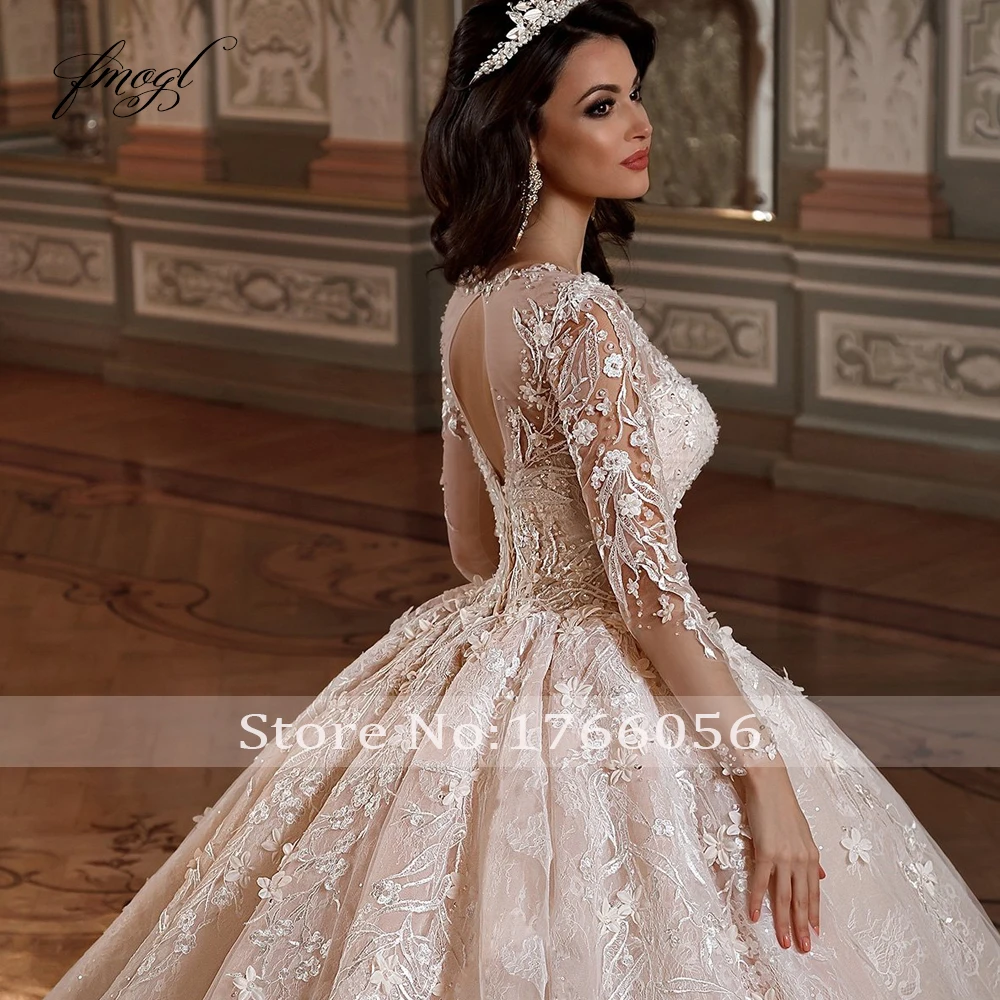 Роскошное кружевное бальное платье Fmogl с длинным рукавом и цветами, свадебные платья 2022, элегантные винтажные Свадебные платья с аппликацией и бисером и шлейфом для часовни