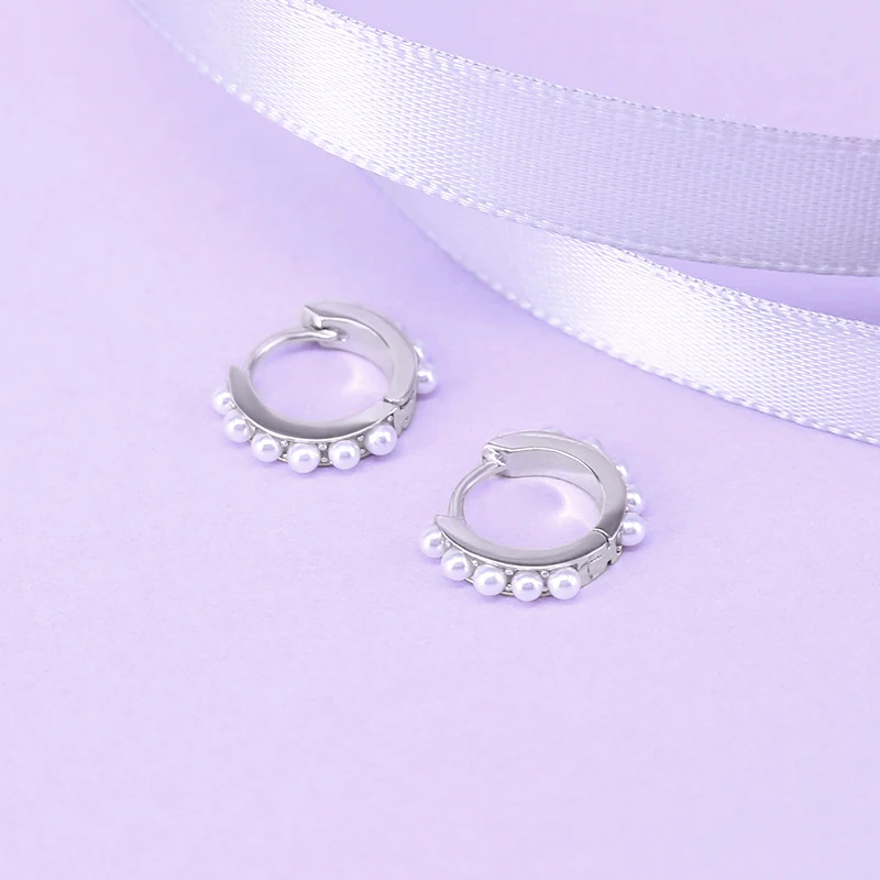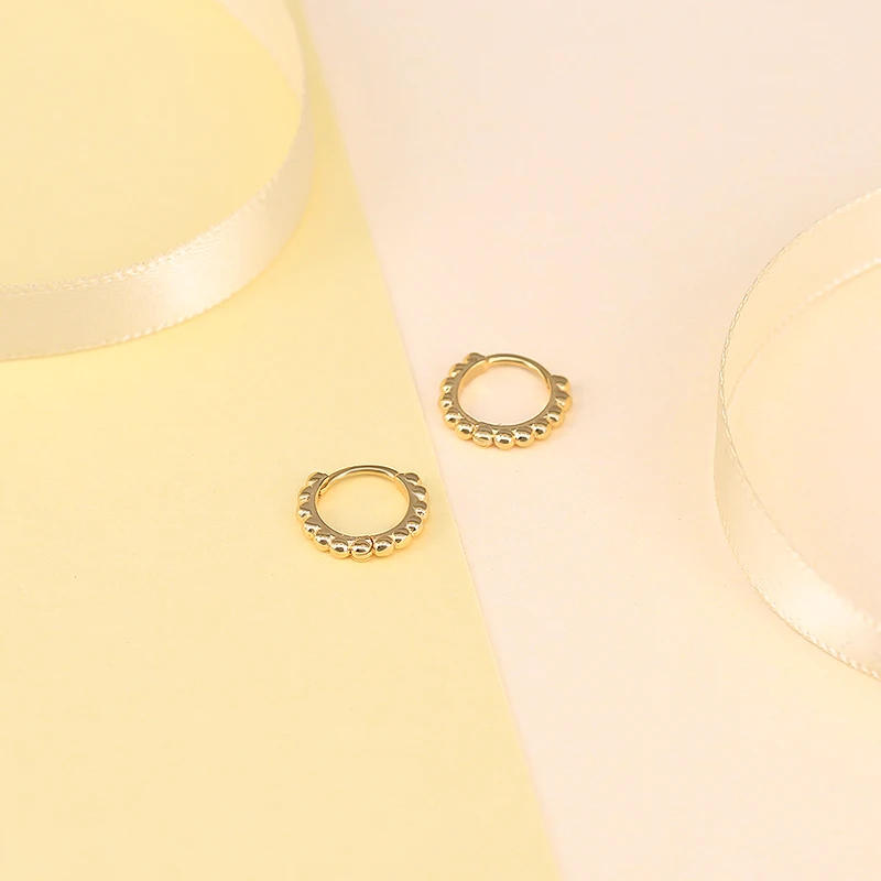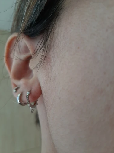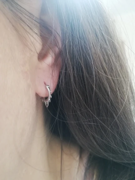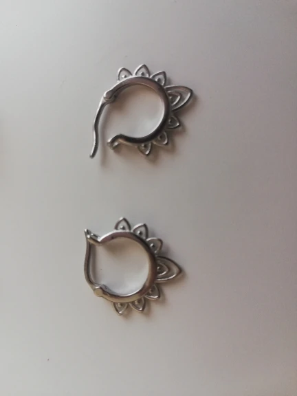 Creo que son de acero y son muy pequeñitos, son bonitos pero si tienes el lóbulo de la oreja grande no los recomiendo, o bien los recomiendo para ponerlos en la parte de arriba de la oreja. Son los mas pequeñitos de todos los que compre.