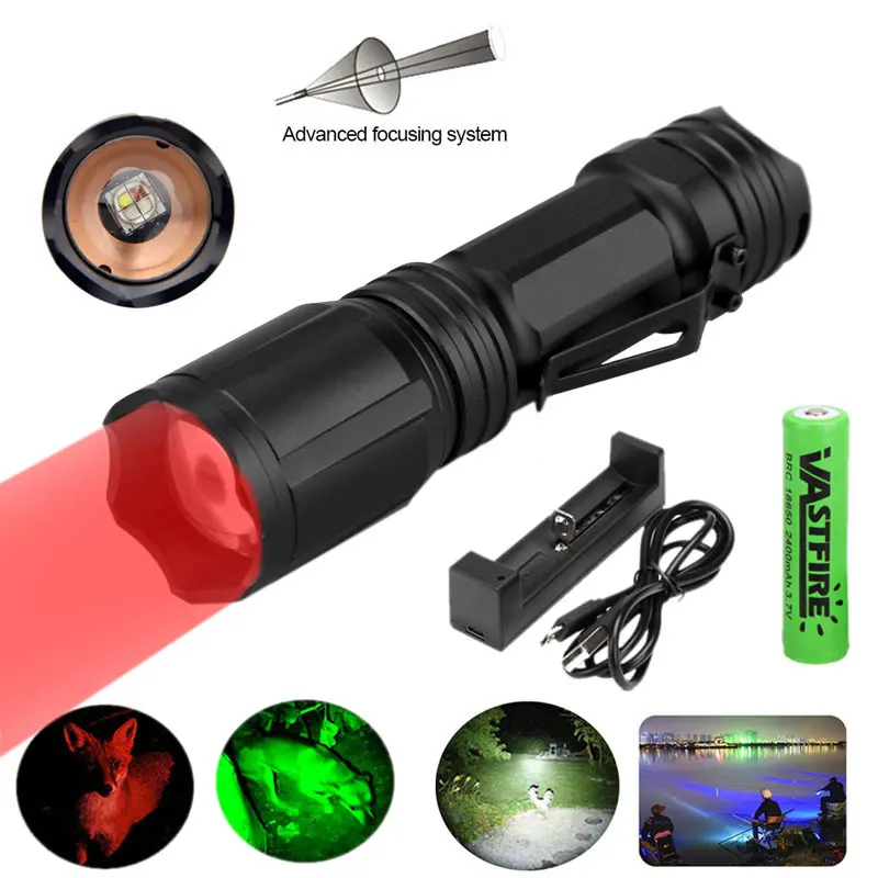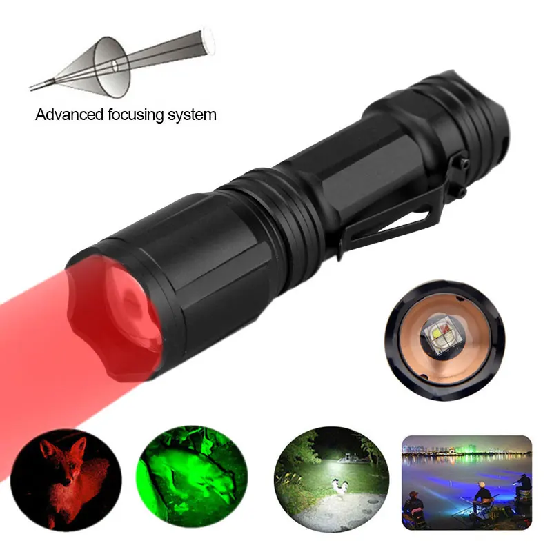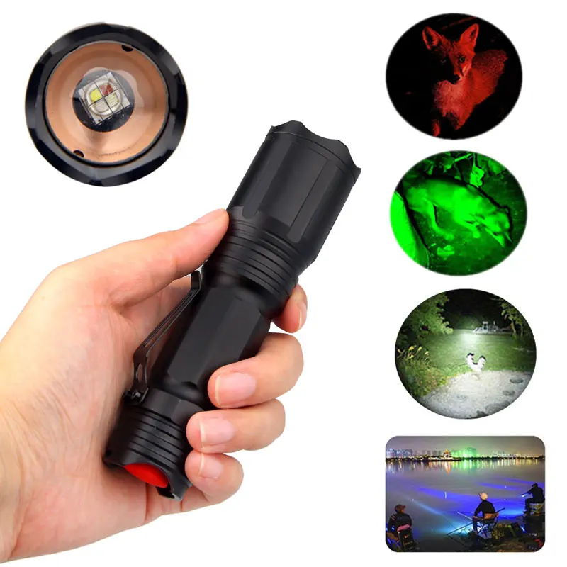 Охотничий фонарик 4 цвета в 1, многоцветный, белыйзеленыйкрасныйсиний, алюминиевый фонарь, тактический фонарик на батарее 18650