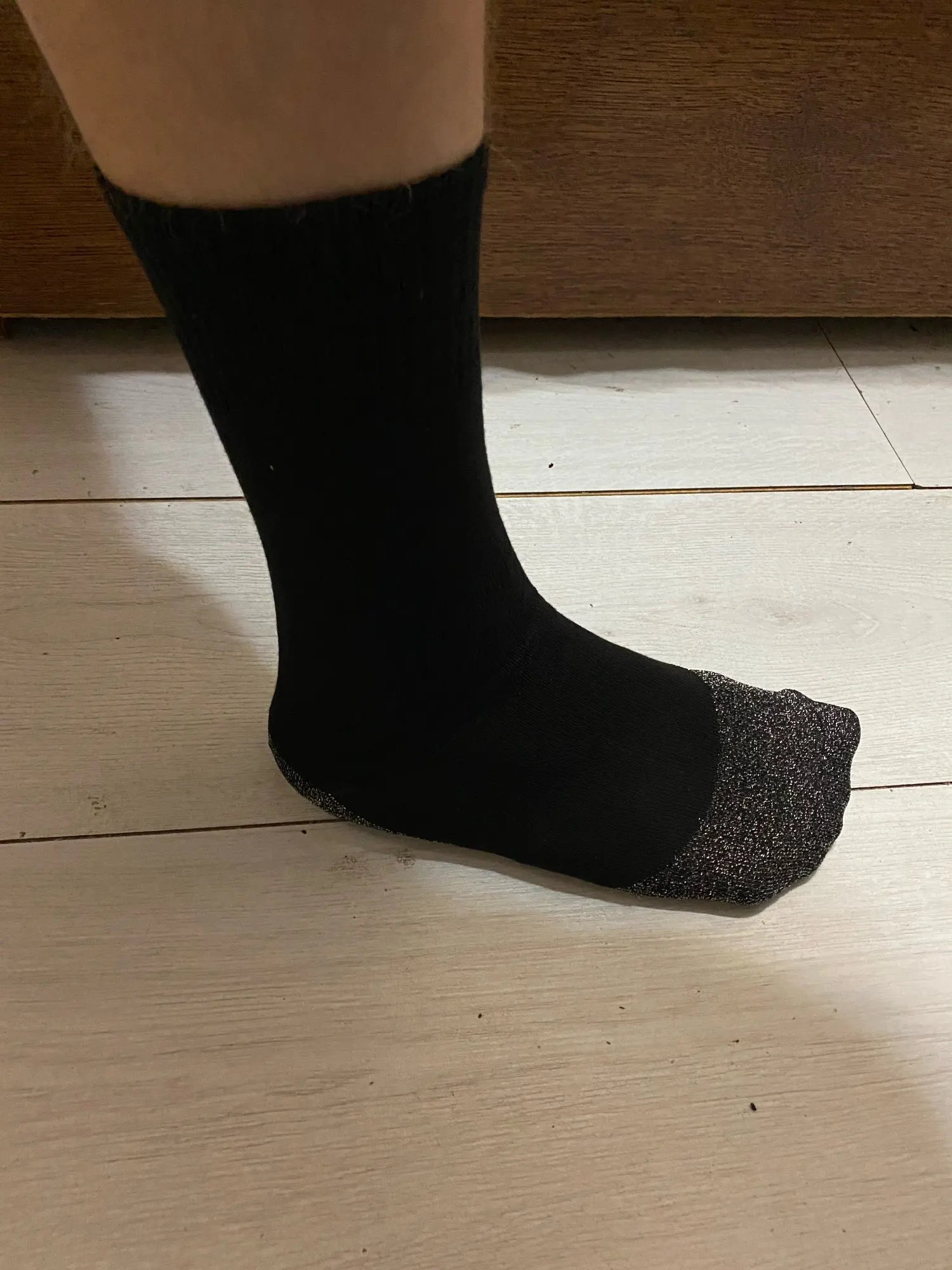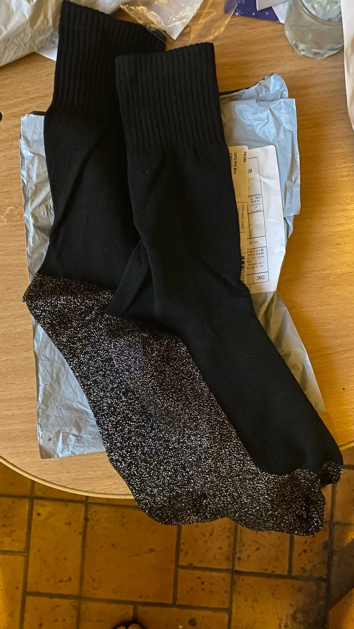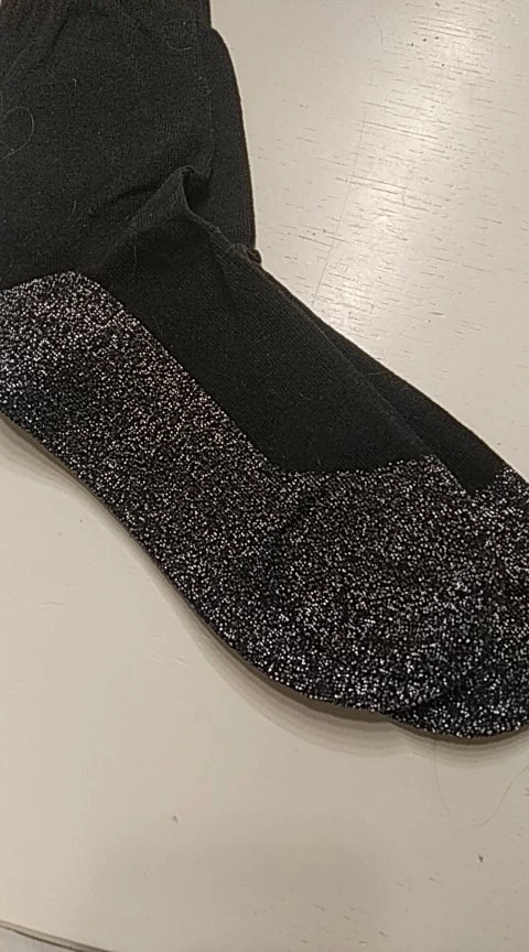 Носки наощупь тонкие, сложно оценить пока их морозоустойчивость. На 39 размер немного великоваты, но не смертельно. Выглядят как мужские черные носки (довольно высокие) со следами из люрекса