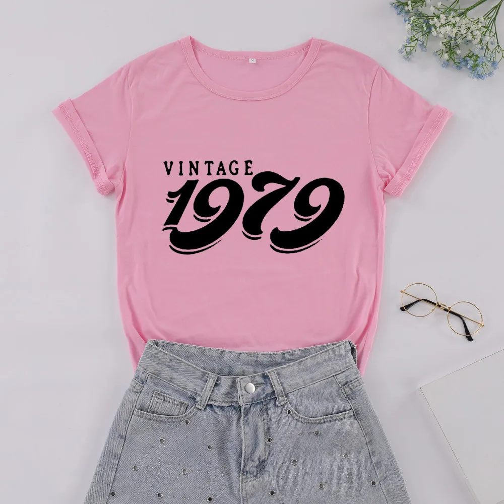 Женская Винтажная футболка с круглым вырезом, повседневная хлопковая футболка с коротким рукавом и графическим принтом, модель 1979 на день рождения, 43th