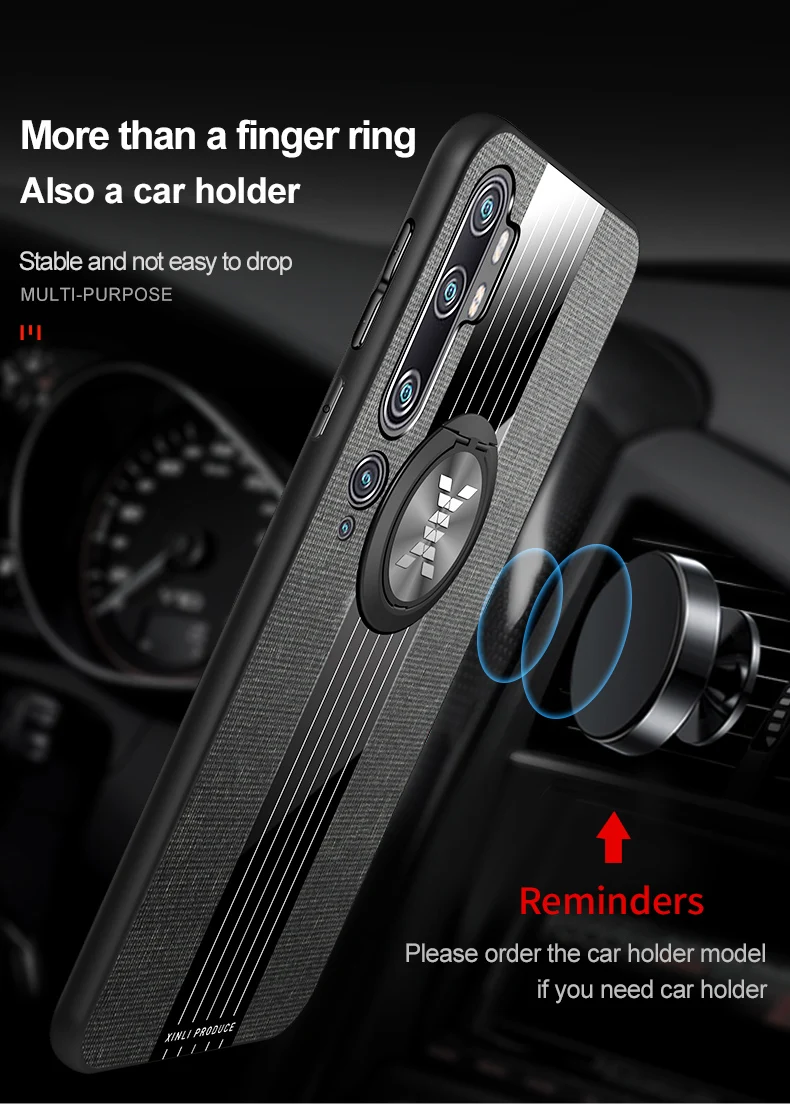 Особенности: Идеально подходит дляXiaomiNote 10 Lite 6,67'' Матовая ткань и глянцевая задняя панель, сделает ваш телефон уникальным Жесткая задняя крышка и мягкая оправа, приятная на ощупь Магнитный металлический держатель кольца для пальцев, делает его удобным во время вождения Палец отделен, если вам это нужно, пожалуйста, выберите модель кольца для пальцев Автомобильный держатель не входит в комплект.