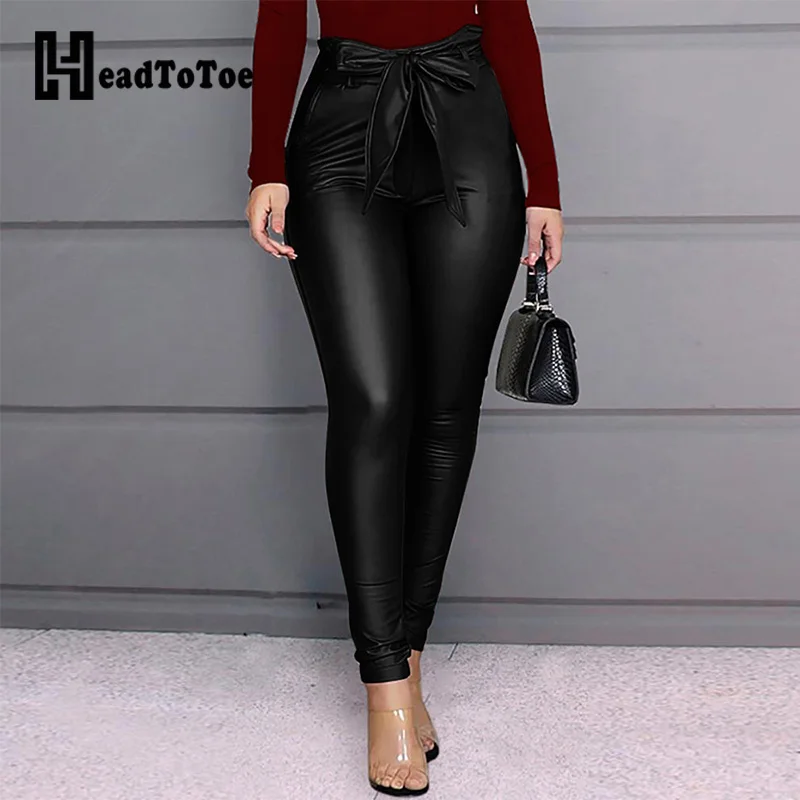 Брюки Paperbag из искусственной кожи на талию, женские повседневные брюки-карандаш из искусственной кожи с высокой талией и поясом