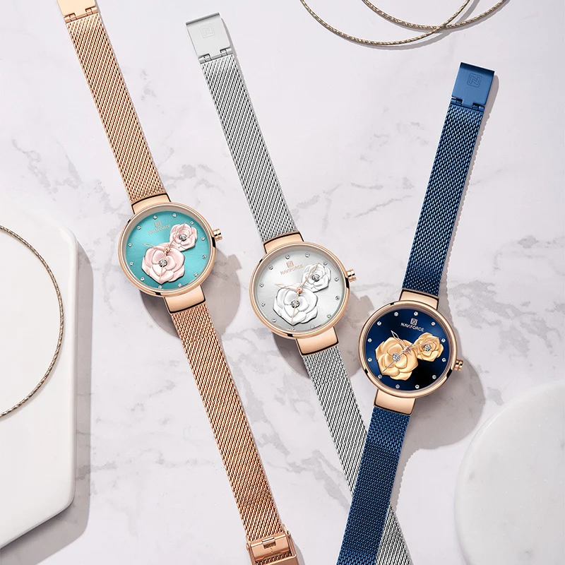 Часы наручные NAVIFORCE женские кварцевые, брендовые красивые водонепроницаемые с сетчатым ремешком из нержавеющей стали, с красивым цветком