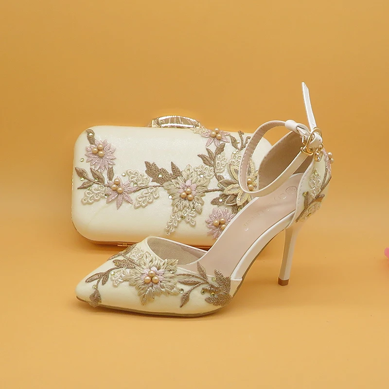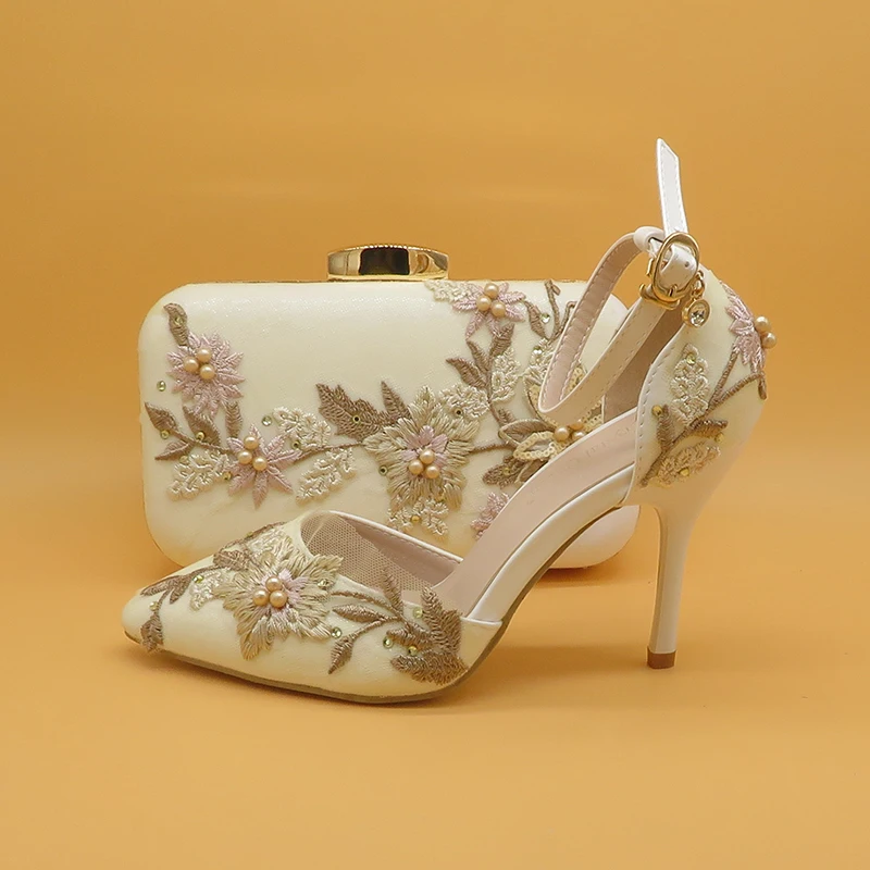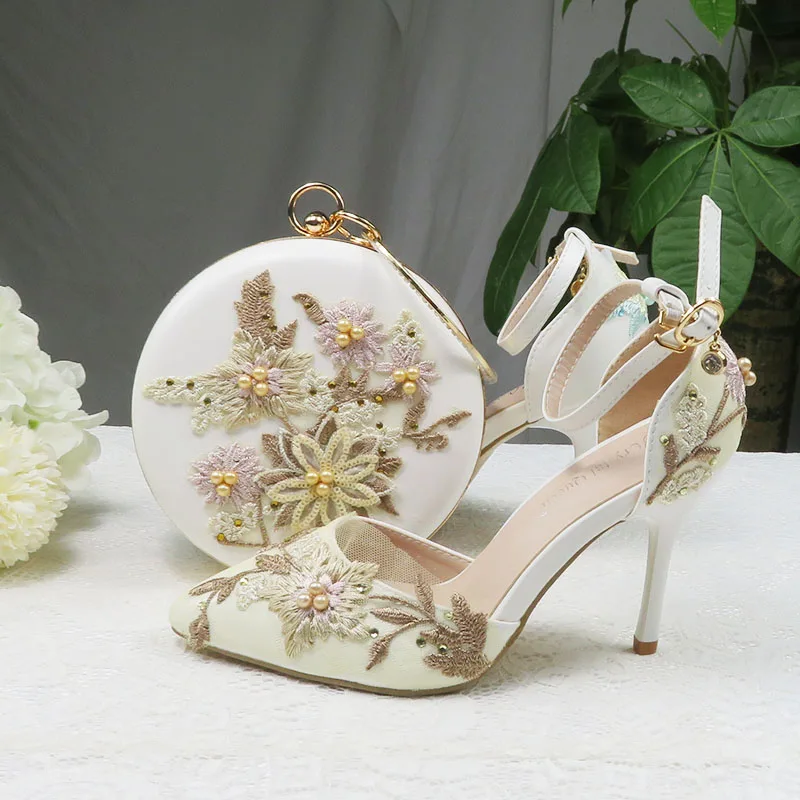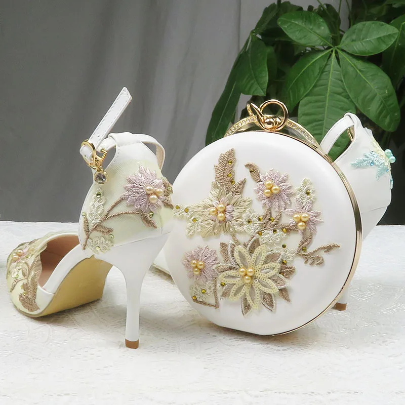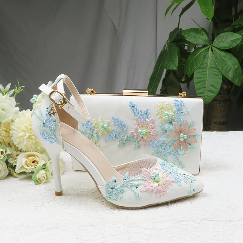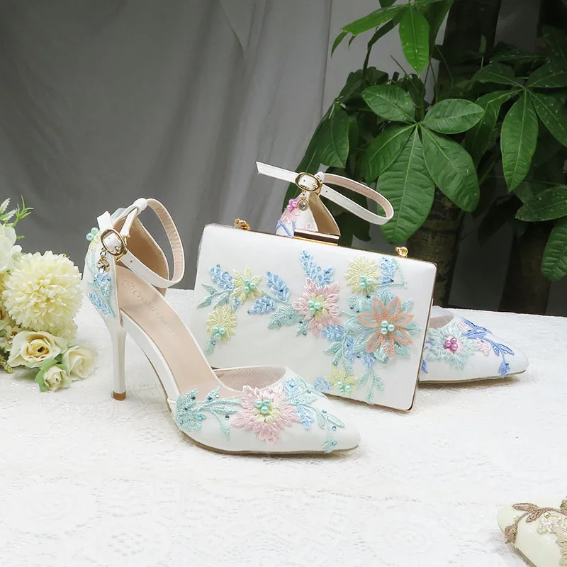 Женские свадебные туфли на высоком каблуке, белые туфли с цветочным кружевом и подходящими сумками, комплект из туфель и сумки с острым носком и ремешком на щиколотке для вечеринки, 2021